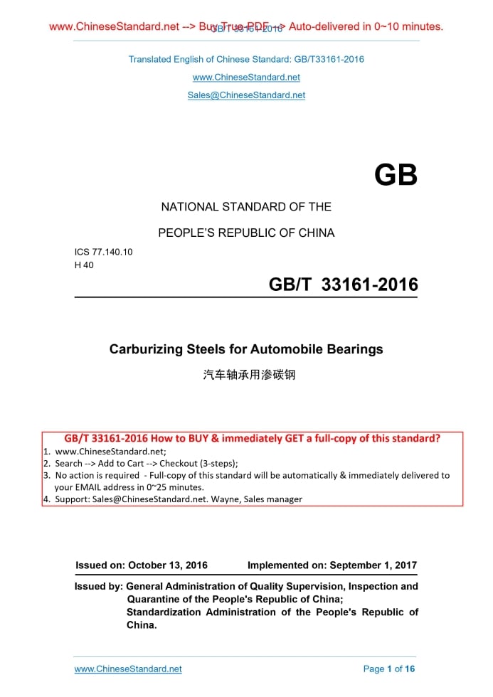GB/T 33161-2016: Carburizing Steels for Automobile Bearings Delivery: 9 seconds. True-PDF full-copy in English & invoice will be downloaded + auto-delivered via email. See step-by-step procedure Status: Valid