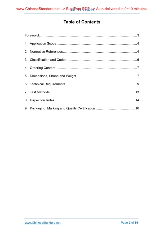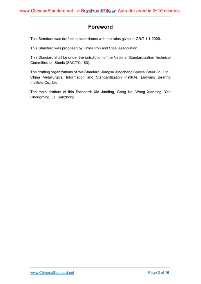 Similar standardsGB/T 33161-2016: Carburizing Steels for Automobile Bearings---This is an excerpt. Full copy of true-PDF in English version (including equations, symbols, images, flow-chart, tables, and figures etc.), auto-downloaded/delivered in 9 seconds, can be purchased online: https://www.ChineseStandard.net/PDF.aspx/GBT33161-2016GB NATIONAL STANDARD OF THE PEOPLE’S REPUBLIC OF CHINA ICS 77.140.10 H 40 Carburizing Steels for Automobile Bearings Issued on: OCTOBER 13, 2016 Implemented on: SEPTEMBER 1, 2017 Issued by. General Administration of Quality Supervision, Inspection and Quarantine of the People's Republic of China; Standardization Administration of the People's Republic of China. Table of ContentsForeword ... 3 1 Application Scope ... 4 2 Normative References ... 4 3 Classification and Codes ... 6 4 Ordering Content ... 7 5 Dimensions, Shape and Weight ... 7 6 Technical Requirements ... 9 7 Test Methods ... 13 8 Inspection Rules ... 14 9 Packaging, Marking and Quality Certification ... 16ForewordThis Standard was drafted in accordance with the rules given in GB/T 1.1-2009. This Standard was proposed by China Iron and Steel Association. This Standard shall be under the jurisdiction of the National Standardization Technical Committee on Steels (SAC/TC 183). The drafting organizations of this Standard. Jiangsu Xingcheng Special Steel Co., Ltd., China Metallurgical Information and Standardization Institute, Luoyang Bearing Institute Co., Ltd. The main drafters of this Standard. Xie Junding, Geng Ke, Wang Xiaoning, Yan Chengming, Lei Jianzhong. Carburizing Steels for Automobile Bearings1 Application ScopeThis Standard specifies the classification and codes, ordering content, dimensions, shape, weight, technical requirements, test methods, inspection rules, packaging, marking and quality certification of carburizing steels for automobile bearings. This Standard applies to carburizing steels for automobile bearings of nominal diameter 4.5 mm ~ 120 mm (hereinafter referred to as steels).2 Normative ReferencesThe following referenced documents are indispensable for the application of this document. For dated references, only the edition dated applies to this document. For undated references, the latest edition of the referenced documents (including all amendments) applies to this Standard. GB/T 223.5, Steel and Iron – Determination of Acid-soluble Silicon and Total Silicon Content – Reduced Molybdosilicate Spectrophotometric Method GB/T 223.9, Iron, Steel and Alloy – Determination of Aluminium Content – Chrom Azurol S Photometric Method GB/T 223.11, Iron, Steel and Alloy – Determination of Chromium Content – Visual Titration or Potentiometric Titration Method GB/T 223.19, Methods for Chemical Analysis of Iron Steel and Alloy – The Neocuproine-chloroform Extraction Photometric Method for the Determination of Copper Content GB/T 223.26, Iron, Steel and Alloy – Determination of Molybdenum Content – The Thiocyanate Spectrophotometric Method GB/T 223.29, Iron, Steel and Alloy – Determination of Lead Content – Carrier Precipitation-Xylenol Orange Spectrophotometric Method GB/T 223.31, Iron, Steel and Alloy - Determination of Arsenic Content – Distillation Separation-Molybdenum Blue Spectrophotometric Method GB/T 223.47, Methods for Chemical Analysis of Iron, Steel and Alloy – The Carrier Precipitation-Molybdenum Blue Potometric Method for the Determination of Antimony Content GB/T 223.50, Methods for Chemical Analysis of Iron, Steel and Alloy – The Phenylfuorone-CTMAB Direct Photometric Method for the Determination of Tin Content GB/T 223.54, Methods for Chemical Analysis of Iron, Steel and Alloy – The Flame Atomic Absorption Spectrophotometric Method for the Determination of Nickel Content GB/T 223.59, Iron, Steel and Alloy – Determination of Phosphorus Content – Bismuth Phosphomolybdate Blue Spectrophotometric Method and Antimony Phosphomolybdate Blue Spectrophotometric Method GB/T 223.63, Methods for Chemical Analysis of Iron, Steel and Alloy – The Sodium (Potassium) Periodate Photometric Method for the Determination of Manganese Content GB/T 223.67, Iron, Steel and Alloy – Determination of Sulfur Content – Methylene Blue Spectrophotometric Method GB/T 223.71, Methods for Chemical Analysis of Iron, Steel and Alloy – The Gravimetric Method after Combustion in the Pipe Furnace for the Determination of Carbon Content GB/T 223.77, Methods for Chemical Analysis of Iron, Steel and Alloy – The Flame Atomic Absorption Spectrometric Method for the Determination of Calcium Content GB/T 223.84, Iron, Steel and Alloy – Determination of Titanium Content – Diantipyrylmethane Spectrophotometric Method GB/T 224, Determination of Depth of Decarburization of Steels GB/T 225, Steel – Hardenability Test by End Quenching (Jominy Test) GB/T 226, Test Method for Macrostructure and Defect of Steel by Etching GB/T 228.1, Metallic Materials – Tensile Testing – Part 1. Method of Test at Room Temperature GB/T 229, Metallic Materials – Charpy Pendulum Impact Test Method GB/T 231.1, Metallic Materials – Brinell Hardness Test – Part 1. Test Method GB/T 702-2008, Hot-rolled Steel Bars – Dimensions, Shape, Weight and Tolerances GB/T 905-1994, Dimension, Shape, Weight and Tolerance for Cold-drawn Round, Square and Hexagonal Steels GB/T 1979, Standard Diagrams for Macrostructure and Defect of Structural Steels GB/T 2101, General Requirements for Acceptance, Packaging, Marking and Certification for Section Steel acceptance as specified in this Standard. 8.1.2 The purchaser can dispatch inspection personnel to the supplier at any time, if necessary. The supplier shall provide necessary facilities for the inspection personnel of the purchaser to ensure steels confirmed for delivery conform to the requirements of this Standard. The inspection personnel of the purchaser shall not disturb the production and operation of the supplier for no reason. 8.2 Grouping rule
