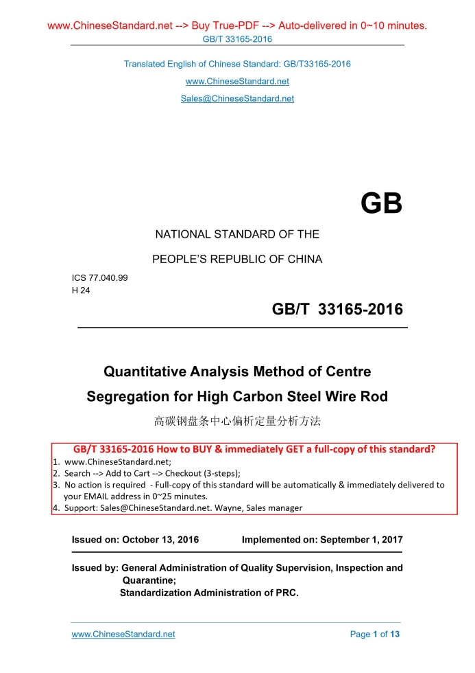 GB/T 33165-2016: Quantitative Analysis Method of Centre Segregation for High Carbon Steel Wire Rod Delivery: 9 seconds. True-PDF full-copy in English & invoice will be downloaded + auto-delivered via email. See step-by-step procedure Status: Valid
