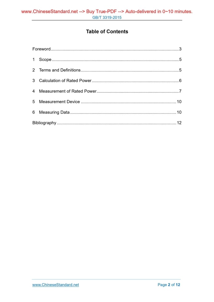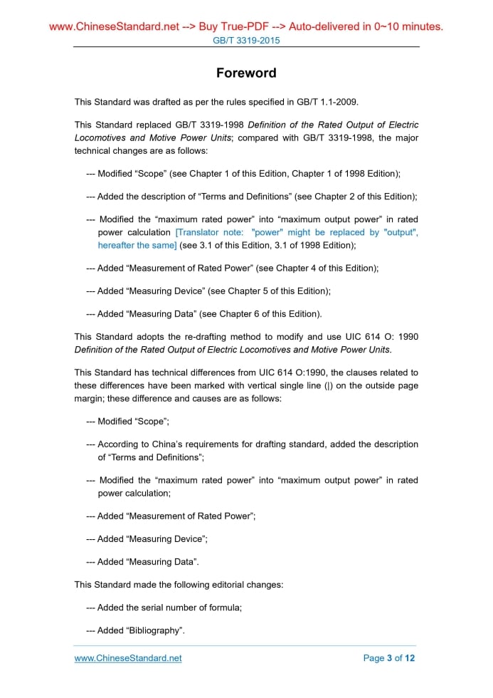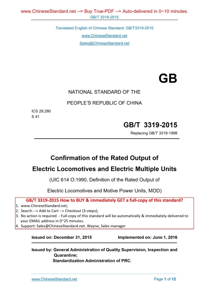 Similar standardsGB/T 3319-2015: Confirmation of the rated output of electric locomotives and electric multiple units---This is an excerpt. Full copy of true-PDF in English version (including equations, symbols, images, flow-chart, tables, and figures etc.), auto-downloaded/delivered in 9 seconds, can be purchased online: https://www.ChineseStandard.net/PDF.aspx/GBT3319-2015 GB NATIONAL STANDARD OF THE PEOPLE’S REPUBLIC OF CHINA ICS 29.280 S 41 Replacing GB/T 3319-1998 Confirmation of the Rated Output of Electric Locomotives and Electric Multiple Units (UIC 614 O.1990, Definition of the Rated Output of Electric Locomotives and Motive Power Units, MOD) Issued on: DECEMBER 31, 2015 Implemented on: JUNE 1, 2016 Issued by. General Administration of Quality Supervision, Inspection and Quarantine; Standardization Administration of PRC. Table of ContentsForeword ... 3 1 Scope ... 5 2 Terms and Definitions ... 5 3 Calculation of Rated Power ... 6 4 Measurement of Rated Power ... 7 5 Measurement Device ... 10 6 Measuring Data ... 10 Bibliography ... 12ForewordThis Standard was drafted as per the rules specified in GB/T 1.1-2009. This Standard replaced GB/T 3319-1998 Definition of the Rated Output of Electric Locomotives and Motive Power Units; compared with GB/T 3319-1998, the major technical changes are as follows. --- Modified “Scope” (see Chapter 1 of this Edition, Chapter 1 of 1998 Edition); --- Added the description of “Terms and Definitions” (see Chapter 2 of this Edition); --- Modified the “maximum rated power” into “maximum output power” in rated power calculation [Translator note. "power" might be replaced by "output", hereafter the same] (see 3.1 of this Edition, 3.1 of 1998 Edition); --- Added “Measurement of Rated Power” (see Chapter 4 of this Edition); --- Added “Measuring Device” (see Chapter 5 of this Edition); --- Added “Measuring Data” (see Chapter 6 of this Edition). This Standard adopts the re-drafting method to modify and use UIC 614 O. 1990 Definition of the Rated Output of Electric Locomotives and Motive Power Units. This Standard has technical differences from UIC 614 O.1990, the clauses related to these differences have been marked with vertical single line (|) on the outside page margin; these difference and causes are as follows. --- Modified “Scope”; --- According to China’s requirements for drafting standard, added the description of “Terms and Definitions”; --- Modified the “maximum rated power” into “maximum output power” in rated power calculation; --- Added “Measurement of Rated Power”; --- Added “Measuring Device”; --- Added “Measuring Data”. This Standard made the following editorial changes. --- Added the serial number of formula; --- Added “Bibliography”. Confirmation of the Rated Output of Electric Locomotives and Electric Multiple Units1 ScopeThis Standard specifies the calculation and measurement method of rated power of electric locomotives and electric multiple units. This Standard is applicable to the calculation and measurement of electric locomotives and electric multiple units.2 Terms and DefinitionsThe following terms and definitions are applicable to this document. 2.1 Rated output The rated power of electric locomotives and electric multiple units indicates the output power measured on the wheelsets in the following two cases. --- The maximum output power that can be provided within a defined time interval (at least 5min from the cold state); --- Nominal power, namely continuous power. However, it shall be emphasized that the power value obtained here shall not be regarded as a basis for comprehensively judging the tractive effort of these electric locomotives and electric multiple units; the evaluation of tractive effort still needs considering other factors. NOTE. before the issuance of corresponding standards, the measured value indicates the value measured at the rated voltage of power network. 2.2 Electric multiple units It includes one set of locomotive at least, also indicates the minimum independent unit where the multi-unit train is inseparable during the running period. 2.3 Continuous tractive effort When the main controller of electric locomotives and electric multiple units is at the D – actually-measured value of dynamic wheel diameter, in mm; D’ – wheel diameter when dynamic wheel half-worn, in mm; F’ – in the constant power working condition of locomotives, the actually-measured vehicle hook traction force, in kN; M – calculated service weight of locomotives, in t; w – total unit running resistance of locomotives at the corresponding speed, in N/kN. 4.1.3 Reducing calculus of continuous tractive effort of electric multiple units wheel circumference The continuous tractive effort (F) of wheel circumference, when wheel diameter is half- worn, shall be calculated as per Formula (4). Where. P – train weight, in t; g – gravity acceleration, in m/s2; wo – unit running additional resistance, in N/kN; wr – unit curve additional resistance, in N/kN; wi – unit slope additional resistance, in N/kN; wa – unit accelerative force, in N/kN. Thereof, wa shall be calculated as per Formula (5). Where. v – train speed, in km/h; t – time, in s. 4.1.4 Reducing calculus of continuous running speed 4.1.4.1 For step voltage-regulating electric locomotive, the speed shall be calculated to the one when voltage of power network is 25kV, and wheel diameter is half-worn as per Formula (6). T – measuring time, in min; u(t) – the instantaneous value of the primary voltage at the test speed point, in V; i(t) – the instantaneous value of the primary current at the test speed point, in A.5 Measurement Device5.1 The error of equipment and system required for the measurement of electric locomotive are as follows. a) Use the test vehicle equipped with dynamometer; b) Vehicle hook force measuring system, the system error shall be no greater than 0.5%; c) Running speed measu
