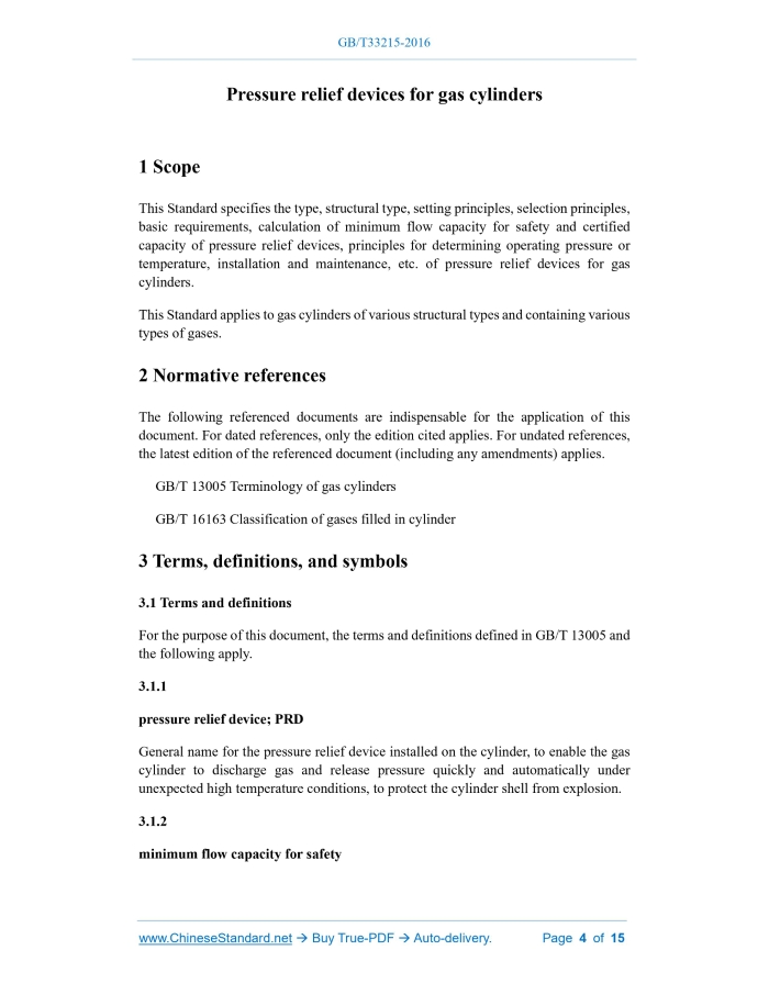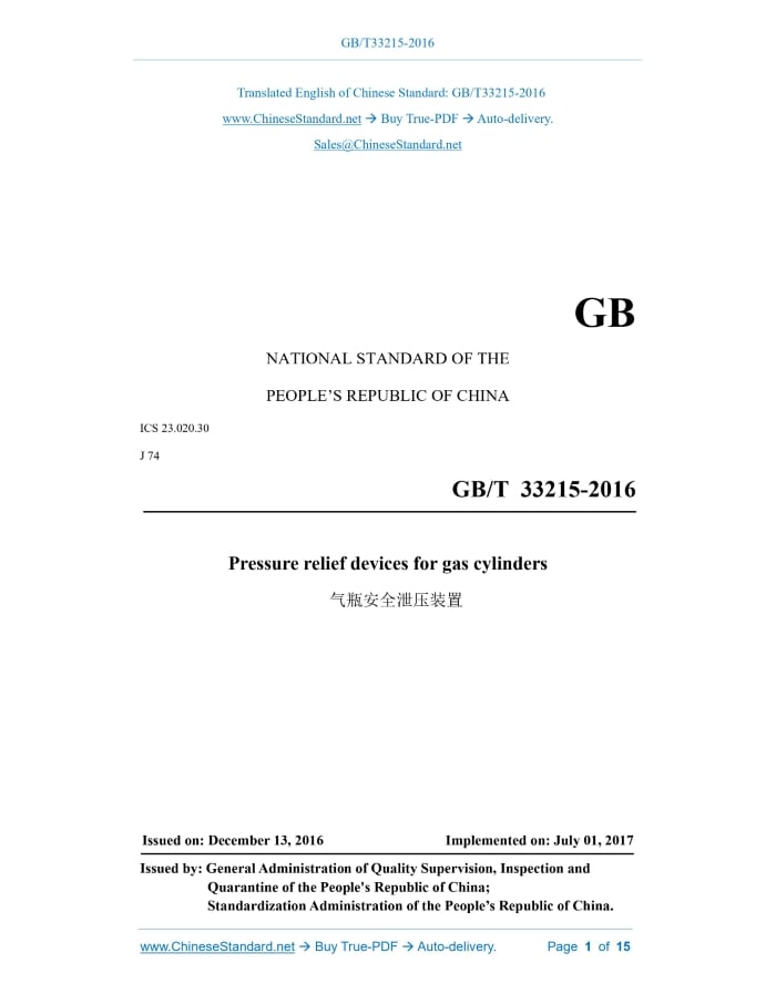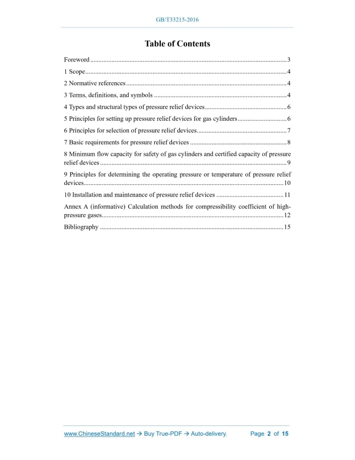 Similar standardsGB/T 33215-2016: Pressure relief devices for gas cylinders---This is an excerpt. Full copy of true-PDF in English version (including equations, symbols, images, flow-chart, tables, and figures etc.), auto-downloaded/delivered in 9 seconds, can be purchased online: https://www.ChineseStandard.net/PDF.aspx/GBT33215-2016GB NATIONAL STANDARD OF THE PEOPLE’S REPUBLIC OF CHINA ICS 23.020.30 J 74 GB/T 33215-2016 Pressure relief devices for gas cylinders Issued on. DECEMBER 13, 2016 Implemented on. JULY 01, 2017 Issued by. General Administration of Quality Supervision, Inspection and Quarantine of the People's Republic of China; Standardization Administration of the People’s Republic of China. Table of ContentsForeword... 3 1 Scope... 4 2 Normative references... 4 3 Terms, definitions, and symbols... 4 4 Types and structural types of pressure relief devices... 6 5 Principles for setting up pressure relief devices for gas cylinders... 6 6 Principles for selection of pressure relief devices... 7 7 Basic requirements for pressure relief devices... 8 8 Minimum flow capacity for safety of gas cylinders and certified capacity of pressure relief devices... 9 9 Principles for determining the operating pressure or temperature of pressure relief devices... 10 10 Installation and maintenance of pressure relief devices... 11 Annex A (informative) Calculation methods for compressibility coefficient of high- pressure gases... 12 Bibliography... 15ForewordThis Standard was drafted in accordance with the rules given in GB/T 1.1-2009. Attention is drawn to the possibility that some of the elements of this document may be the subject of patent rights. The issuing authority of this document shall not be held responsible for identifying any or all such patent rights. This Standard was proposed by and shall be under the jurisdiction of National Technical Committee on Gas Cylinders of Standardization Administration of China (SAC/TC 31). Drafting organizations of this Standard. Ningbo Sanan Valve Co., Ltd., Jinhua Yonghui Precision Machinery Co., Ltd., Beijing Tianhai Industry Co., Ltd., China Special Equipment Inspection and Research Institute, Shanghai Special Equipment Supervision and Inspection Technology Research Institute, Dalian Boiler and Pressure Vessel Inspection Institute. Main drafters of this Standard. Wu Yueshen, Huang Qianghua, Zhang Baoguo, Hu Jun, Weng Guodong, Shi Lei, Shao Yongqing, Sun Li, Wang Yanhui. Pressure relief devices for gas cylinders1 ScopeThis Standard specifies the type, structural type, setting principles, selection principles, basic requirements, calculation of minimum flow capacity for safety and certified capacity of pressure relief devices, principles for determining operating pressure or temperature, installation and maintenance, etc. of pressure relief devices for gas cylinders. This Standard applies to gas cylinders of various structural types and containing various types of gases.2 Normative referencesThe following referenced documents are indispensable for the application of this document. For dated references, only the edition cited applies. For undated references, the latest edition of the referenced document (including any amendments) applies. GB/T 13005 Terminology of gas cylinders GB/T 16163 Classification of gases filled in cylinder3 Terms, definitions, and symbols3.1 Terms and definitions For the purpose of this document, the terms and definitions defined in GB/T 13005 and the following apply. 3.2 Symbols For the purpose of this document, the following symbols apply.4 Types and structural types of pressure relief devices4.1 Fusible plug device It is composed of a fusible plug and a plug boss. The plug boss is connected to the cylinder shell or valve body. When the temperature reaches a predetermined value, the fusible alloy melts and the gas is discharged. 4.3 Safety valve A pressure control device that can be opened and closed repeatedly, composed of a valve boss, a valve disc, and a spring. 4.4 Bursting disc - fusible plug composite device A safety pressure relief device composed of a bursting disc and a fusible plug connected in series. 4.5 Bursting disc - safety valve composite device A pressure relief device composed of a bursting disc and a safety valve connected in series. When the gas pressure in the cylinder reaches a predetermined value, the bursting disc breaks first, and the discharged gas causes the safety valve to open, and the high- pressure gas is automatically discharged.5 Principles for setting up pressure relief devices for gas cylinders5.1 The following gas cylinders shall be equipped with pressure relief devices. 5.2 Gas cylinders containing highly toxic gases (the second digit of the FTSC code in GB/T 16163 is “3”) and self-igniting gases are prohibited from installing pressure relief devices. Liquid chlorine cylinders do not need to be equipped with pressure relief devices. 5.3 Non-industrial liquefied petroleum gas cylinders are not equipped with pressure relief devices.6 Principles for selection of pressure relief devices6.1 Gas cylinders containing toxic gases (the second digit of the FTSC code in GB/T 16163 is “2”) shall not be equipped with a safety valve separately; gas cylinders containing low-pressure toxic gases may be equipped with a fusible plug device; 6.3 Gas cylinders containing flammable gases that are prone to decomposition or polymerization (the first digit of the FTSC code in GB/T 16163 is “5”) should be equipped with a fusible plug device. 6.4 Welded insulated gas cylinders containing cryogenic liquefied gases shall be7 Basic requirements for pressure relief devices7.1 Requirements for design and structure of pressure relief devices 7.1.1 The structure of devices shall be suitable for the use environment and conditions. 7.2 Requirements for materials of pressure relief devices 7.2.1 For materials from which parts are made, the chemical composition and physical properties shall be uniform. 7.2.2 F