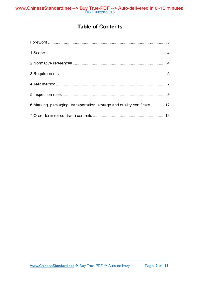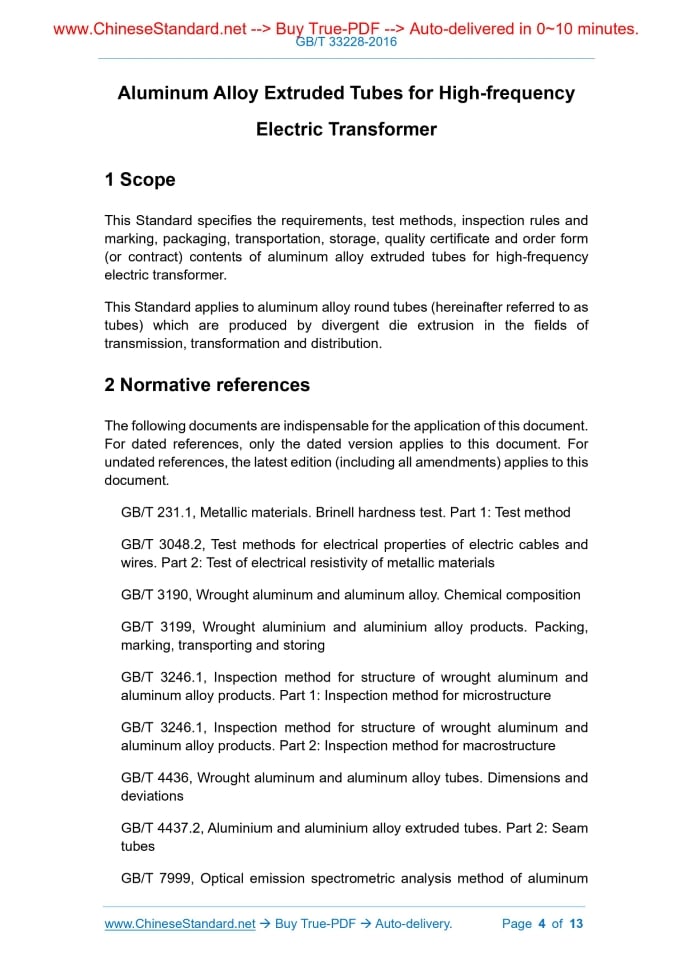 Similar standardsGB/T 33228-2016: Aluminum Alloy Extruded Tubes for High-frequency Electric Transformer---This is an excerpt. Full copy of true-PDF in English version (including equations, symbols, images, flow-chart, tables, and figures etc.), auto-downloaded/delivered in 9 seconds, can be purchased online: https://www.ChineseStandard.net/PDF.aspx/GBT33228-2016NATIONAL STANDARD OF THE PEOPLE’S REPUBLIC OF CHINA ICS 77.150.10 H 61 Aluminum Alloy Extruded Tubes for High-frequency Electric Transformer ISSUED ON: DECEMBER 13, 2016 IMPLEMENTED ON: NOVEMBER 01, 2017 Issued by: General Administration of Quality Supervision, Inspection and Quarantine; Standardization Administration of the People's Republic of China. Table of ContentsForeword ... 3 1 Scope ... 4 2 Normative references ... 4 3 Requirements ... 5 4 Test method ... 7 5 Inspection rules ... 9 6 Marking, packaging, transportation, storage and quality certificate ... 12 7 Order form (or contract) contents ... 13 Aluminum Alloy Extruded Tubes for High-frequency Electric Transformer1 ScopeThis Standard specifies the requirements, test methods, inspection rules and marking, packaging, transportation, storage, quality certificate and order form (or contract) contents of aluminum alloy extruded tubes for high-frequency electric transformer. This Standard applies to aluminum alloy round tubes (hereinafter referred to as tubes) which are produced by divergent die extrusion in the fields of transmission, transformation and distribution.2 Normative referencesThe following documents are indispensable for the application of this document. For dated references, only the dated version applies to this document. For undated references, the latest edition (including all amendments) applies to this document. GB/T 231.1, Metallic materials. Brinell hardness test. Part 1: Test method GB/T 3048.2, Test methods for electrical properties of electric cables and wires. Part 2: Test of electrical resistivity of metallic materials GB/T 3190, Wrought aluminum and aluminum alloy. Chemical composition GB/T 3199, Wrought aluminium and aluminium alloy products. Packing, marking, transporting and storing GB/T 3246.1, Inspection method for structure of wrought aluminum and aluminum alloy products. Part 1: Inspection method for microstructure GB/T 3246.1, Inspection method for structure of wrought aluminum and aluminum alloy products. Part 2: Inspection method for macrostructure GB/T 4436, Wrought aluminum and aluminum alloy tubes. Dimensions and deviations GB/T 4437.2, Aluminium and aluminium alloy extruded tubes. Part 2: Seam tubes GB/T 7999, Optical emission spectrometric analysis method of aluminum 4.1.1 The analysis method of chemical composition shall comply with requirements of GB/T 20975 or GB/T 7999; the arbitration analysis shall adopt the methods which are specified in GB/T 20975. 4.1.2 Perform routine chemical analysis only on the numerically specified elements other than those in the columns of the “Aluminum” and “Other” of grade-6101B in GB/T 3190. When the mass fraction of the non-routine analysis element is suspected to exceed the limit value of this Standard, the producer shall analyze these elements. 4.1.3 The “Al” content is calculated according to the method which is specified in GB/T 3190. When the “Al” content is calculated, take the sum value of the analytical values of the conventional analytical elements and the suspected excess unconventional analytical elements as the “sum of elemental content”. 4.1.4 The determination of analysis value is based on the rounding comparison method; the value rounding rules shall be carried out in accordance with the relevant provisions of GB/T 8170; the rounding digit shall be consistent with the limit digits which are specified in Table 3 of this Standard or GB/T 3190. 4.2 Size inspection The tube size is tested according to the provisions of GB/T 4436. 4.3 Tensile mechanical properties at room temperature The tensile test method of the tubes at room temperature shall be carried out in accordance with the provisions of GB/T 16865. 4.4 Brinell hardness The Brinell hardness test of the tubes shall be carried out in accordance with the provisions of GB/T 231.1. 4.5 Conductivity The conductivity test of the tubes shall comply with the provisions of GB/T 12966 or GB/T 3048.2. The arbitration shall be performed in accordance with the provisions of GB/T 3048.2. 4.6 Low-magnification organization The test method of low-magnification organization of the tubes shall comply with the provisions of GB/T 3246.2. 4.7 Microstructure The test method of microstructure of the tubes shall comply with the provisions of GB/T 3246.1. 4.8 Appearance quality Visually inspect the appearance quality under natural scattered light. If necessary, use dimensional measurement tools to define the defect size; determine the defect depth by grinding.5 Inspection rules5.1 Inspection and acceptance 5.1.1 The product shall be inspected by the supplier to ensure that the product quality complies with the requirements of this Standard and the order form (or the contract); the supplier shall fill in the quality certificate. 5.1.2 The buyer shall inspect the received products in accordance with the provisions of this Standard. If the test result is inconsistent with the provisions of this Standard and the order form (or the contract), a written form shall be submitted to the supplier; the issue shall be settled by negotiation between the supplier and the buyer. Objections of appearance quality and dimension deviation shall be filed within one months from the date of receipt of the product; objections of other performances shall be filed within three months from the date of receipt of the product. Arbitration, if required, may be carried out by an organization which is recognized by both the supplier and the buyer; the sampling shall be jointly done on the buyer’s site. 5.2 Batch Tubes shall be submitted for acceptance in batch