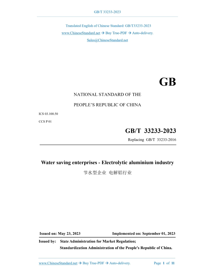 GB NATIONAL STANDARD OF THE PEOPLE’S REPUBLIC OF CHINA ICS 03.100.50 CCS P 01 Replacing GB/T 33233-2016 Water saving enterprises - Electrolytic aluminium industry ISSUED ON: MAY 23, 2023 IMPLEMENTED ON: SEPTEMBER 01, 2023 Issued by: State Administration for Market Regulation; Standardization Administration of the People's Republic of China.
