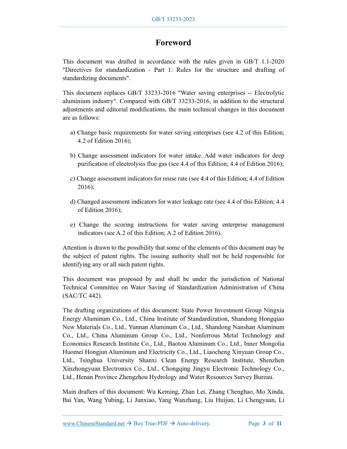 This document was drafted in accordance with the rules given in GB/T 1.1-2020 "Directives for standardization - Part 1: Rules for the structure and drafting of standardizing documents". This document replaces GB/T 33233-2016 "Water saving enterprises -- Electrolytic aluminium industry". Compared with GB/T 33233-2016, in addition to the structural adjustments and editorial modifications, the main technical changes in this document are as follows: a) Change basic requirements for water saving enterprises (see 4.2 of this Edition; 4.2 of Edition 2016); b) Change assessment indicators for water intake. Add water indicators for deep purification of electrolysis flue gas (see 4.4 of this Edition; 4.4 of Edition 2016); c) Change assessment indicators for reuse rate (see 4.4 of this Edition; 4.4 of Edition 2016); d) Changed assessment indicators for water leakage rate (see 4.4 of this Edition; 4.4 of Edition 2016); e) Change the scoring instructions for water saving enterprise management indicators (see A.2 of this Edition; A.2 of Edition 2016). Attention is drawn to the possibility that some of the elements of this document may be the subject of patent rights. The issuing authority shall not be held responsible for identifying any or all such patent rights. This document was proposed by and shall be under the jurisdiction of National Technical Committee on Water Saving of Standardization Administration of China (SAC/TC 442). The drafting organizations of this document: State Power Investment Group Ningxia Energy Aluminum Co., Ltd., China Institute of Standardization, Shandong Hongqiao New Materials Co., Ltd., Yunnan Aluminum Co., Ltd., Shandong Nanshan Aluminum Co., Ltd., China Aluminum Group Co., Ltd., Nonferrous Metal Technology and Economics Research Institute Co., Ltd., Baotou Aluminum Co., Ltd., Inner Mongolia Huomei Hongjun Aluminum and Electricity Co., Ltd., Liaocheng Xinyuan Group Co., Ltd., Tsinghua University Shanxi Clean Energy Research Institute, Shenzhen Xinzhongyuan Electronics Co., Ltd., Chongqing Jingyu Electronic Technology Co., Ltd., Henan Province Zhengzhou Hydrology and Water Resources Survey Bureau. Main drafters of this document: Wu Keming, Zhan Lei, Zhang Chenghao, Mo Xinda, Bai Yan, Wang Yubing, Li Junxiao, Yang Wanzhang, Liu Huijun, Li Chengyuan, Li Water saving enterprises - Electrolytic aluminium industry