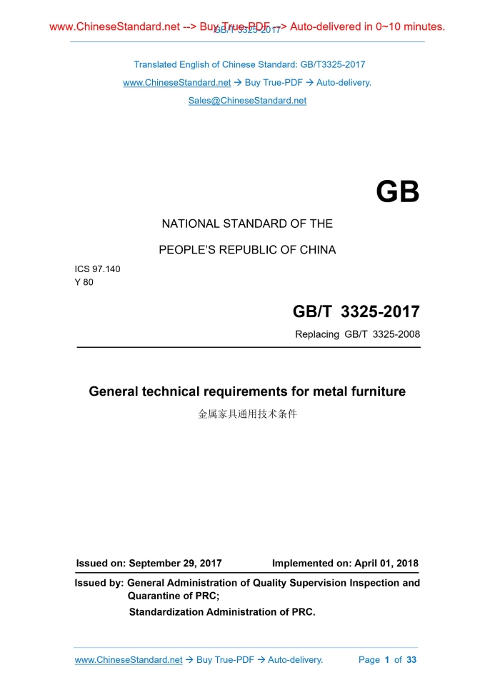 GB/T 3325-2017: General technical requirements for metal furniture Delivery: 9 seconds. True-PDF full-copy in English & invoice will be downloaded + auto-delivered via email. See step-by-step procedure Status: Valid GB/T 3325: Historical versions
