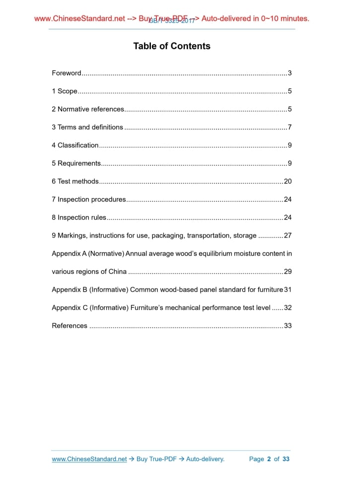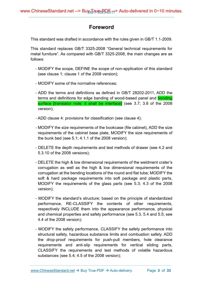 GB/T 3325-2017: General technical requirements for metal furniture---This is an excerpt. Full copy of true-PDF in English version (including equations, symbols, images, flow-chart, tables, and figures etc.), auto-downloaded/delivered in 9 seconds, can be purchased online: https://www.ChineseStandard.net/PDF.aspx/GBT3325-2017GB NATIONAL STANDARD OF THE PEOPLE’S REPUBLIC OF CHINA ICS 97.140 Y 80 Replacing GB/T 3325-2008 General technical requirements for metal furniture Issued on: SEPTEMBER 29, 2017 Implemented on: APRIL 01, 2018 Issued by. General Administration of Quality Supervision Inspection and Quarantine of PRC; Standardization Administration of PRC. Table of ContentsForeword... 3 1 Scope... 5 2 Normative references... 5 3 Terms and definitions... 7 4 Classification... 9 5 Requirements... 9 6 Test methods... 20 7 Inspection procedures... 24 8 Inspection rules... 24 9 Markings, instructions for use, packaging, transportation, storage... 27 Appendix A (Normative) Annual average wood’s equilibrium moisture content in various regions of China... 29 Appendix B (Informative) Common wood-based panel standard for furniture 31 Appendix C (Informative) Furniture’s mechanical performance test level... 32 References... 33ForewordThis standard was drafted in accordance with the rules given in GB/T 1.1-2009. This standard replaces GB/T 3325-2008 “General technical requirements for metal furniture”. As compared with GB/T 3325-2008, the main changes are as follows. - MODIFY the scope, DEFINE the scope of non-application of this standard (see clause 1; clause 1 of the 2008 version); - MODIFY some of the normative references; - ADD the terms and definitions as defined in GB/T 28202-2011, ADD the terms and definitions for edge banding of wood-based panel and bonding surface [translator note. it shall be interface] (see 3.7; 3.8 of the 2008 version); - ADD clause 4.provisions for classification (see clause 4); - MODIFY the size requirements of the bookcase (file cabinet), ADD the size requirements of the cabinet base plate, MODIFY the size requirements of the bunk bed (see 5.1; 4.1.1 of the 2008 version); - DELETE the depth requirements and test methods of drawer (see 4.2 and 5.3.10 of the 2008 versions); - DELETE the high & low dimensional requirements of the weldment crater’s corrugation as well as the high & low dimensional requirements of the corrugation at the bending locations of the round and flat tube; MODIFY the soft & hard package requirements into soft package and plastic parts, MODIFY the requirements of the glass parts (see 5.3; 4.3 of the 2008 version); - MODIFY the standard’s structure; based on the principle of standardized performance, RE-CLASSIFY the contents of other requirements, respectively INCLUDE them into the appearance performance, physical and chemical properties and safety performance (see 5.3, 5.4 and 5.5; see 4.4 of the 2008 version); - MODIFY the safety performance, CLASSIFY the safety performance into structural safety, hazardous substance limits and combustion safety. ADD the drop-proof requirements for push-pull members, hole clearance requirements and anti-slip requirements for vertical sliding parts, CLASSIFY the requirements and test methods of volatile hazardous substances (see 5.4; 4.5 of the 2008 version); General technical requirements for metal furniture1 ScopeThis standard specifies the terms and definitions, classification, requirements, test methods, inspection procedures, inspection rules, marking, instructions for use, packaging, transportation and storage of metal furniture. This standard applies to metal furniture products which use the metal materials as the main structure. The furniture which uses components of other metal materials may make reference to this standard.2 Normative referencesThe following documents are essential to the application of this document. For the dated documents, only the versions with the dates indicated are applicable to this document; for the undated documents, only the latest version (including all the amendments) are applicable to this standard. GB 250 Textiles - Tests for color fastness - Grey scale for assessing change in color GB/T 1043.1 Plastics - Determination of Charpy impact properties - Part 1. Non - instrumented impact test GB/T 1732 Determination of impact resistance of film GB/T 1931 Method for determination of the moisture content of wood GB/T 2828.1-2012 Sampling procedures for inspection by attributes -Part 1. Sampling schemes indexed by acceptance quality limit (AQL) for lot-by-lot inspection GB/T 3920 Textiles - Tests for color fastness - Color fastness to rubbing GB/T 4689.20 Leather - Determination for adhesion of finish GB/T 4893.1 Furniture - Assessment of surface resistance to cold liquids GB/T 4893.2 Furniture - Assessment of surface resistance to wet heat GB/T 4893.3 Furniture - Assessment of surface resistance to dry heat GB/T 4893.4 Test of surface coatings of furniture - Part 4.Determination of GB 28008-2011 Safety requirements of glass furniture GB/T 28202-2011 Furniture industry terminology QB/T 1951.2-2013 Metal furniture - Quality test and evaluation QB/T 2537 Leather - Tests for color fastness - Color fastness to cycles of to- and-fro rubbing QB/T 2724 Leather - Chemical test - Determination of pH QB/T 3826 Corrosion-resistant testing method of the metal deposits and conversion coatings for the light industrial products - Neutral salt spraying test (NSS) QB/T 4156-2010 Office furniture - Microcomputer desk3 Terms and definitionsThe terms and definitions as defined in GB/T 28202-2011 as well as the following terms and definitions apply to this document. 3.1 Metal furniture A furniture which mainly uses the metal pipes, plates, and other profiles to constitute the frame or component, together with the parts and components which are made of wood, wood-based panels, leather, textile fabrics, plastics, glass, stone, and other auxiliary materials, or furniture which is made entirely 