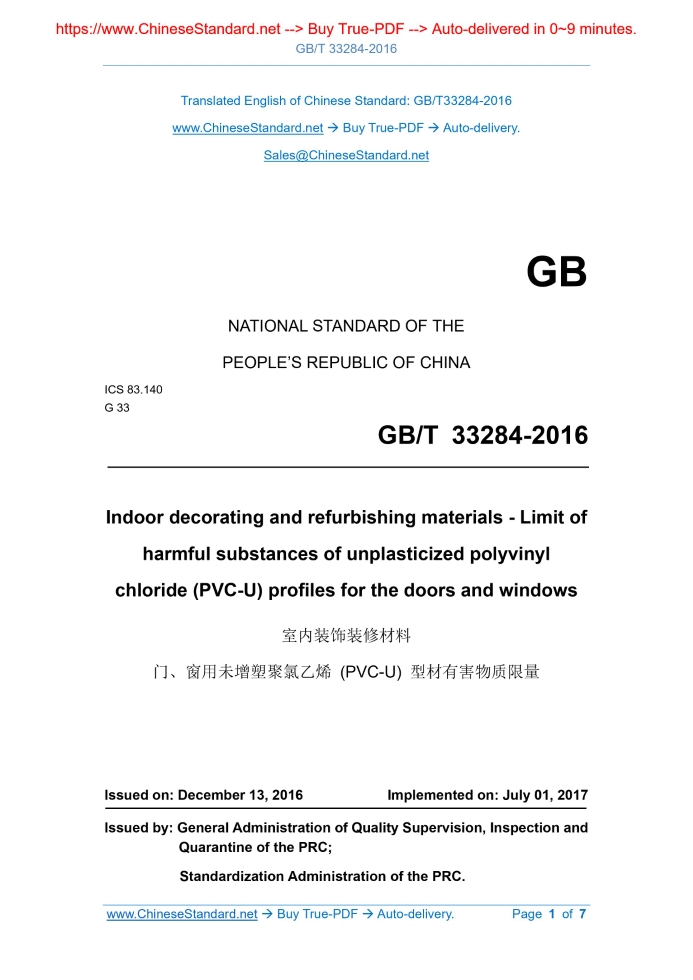 GB/T 33284-2016: Indoor decorating and refurbishing materials -- Limit of harmful substances of unplasticized polyvinyl chloride (PVC-U) profiles for the doors and windows Delivery: 9 seconds. True-PDF full-copy in English & invoice will be downloaded + auto-delivered via email. See step-by-step procedure Status: Valid