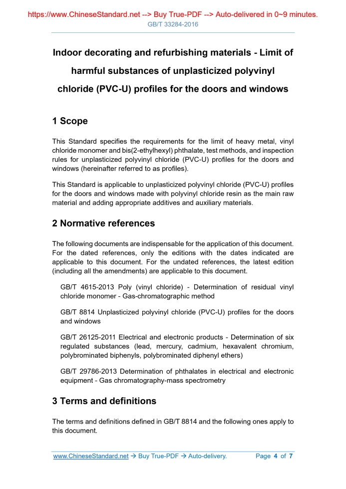 Similar standardsGB/T 33284-2016: Indoor decorating and refurbishing materials -- Limit of harmful substances of unplasticized polyvinyl chloride (PVC-U) profiles for the doors and windows---This is an excerpt. Full copy of true-PDF in English version (including equations, symbols, images, flow-chart, tables, and figures etc.), auto-downloaded/delivered in 9 seconds, can be purchased online: https://www.ChineseStandard.net/PDF.aspx/GBT33284-2016 GB NATIONAL STANDARD OF THE PEOPLE’S REPUBLIC OF CHINA ICS 83.140 G 33 Indoor decorating and refurbishing materials - Limit of harmful substances of unplasticized polyvinyl chloride (PVC-U) profiles for the doors and windows 室内装饰装修材料 ISSUED ON: DECEMBER 13, 2016 IMPLEMENTED ON: JULY 01, 2017 Issued by: General Administration of Quality Supervision, Inspection and Quarantine of the PRC; Standardization Administration of the PRC. Table of ContentsForeword ... 3 1 Scope ... 4 2 Normative references ... 4 3 Terms and definitions ... 4 4 Requirements ... 5 5 Test methods ... 5 6 Inspection rules ... 6 Indoor decorating and refurbishing materials - Limit of harmful substances of unplasticized polyvinyl chloride (PVC-U) profiles for the doors and windows1 ScopeThis Standard specifies the requirements for the limit of heavy metal, vinyl chloride monomer and bis(2-ethylhexyl) phthalate, test methods, and inspection rules for unplasticized polyvinyl chloride (PVC-U) profiles for the doors and windows (hereinafter referred to as profiles). This Standard is applicable to unplasticized polyvinyl chloride (PVC-U) profiles for the doors and windows made with polyvinyl chloride resin as the main raw material and adding appropriate additives and auxiliary materials.2 Normative referencesThe following documents are indispensable for the application of this document. For the dated references, only the editions with the dates indicated are applicable to this document. For the undated references, the latest edition (including all the amendments) are applicable to this document. GB/T 4615-2013 Poly (vinyl chloride) - Determination of residual vinyl chloride monomer - Gas-chromatographic method GB/T 8814 Unplasticized polyvinyl chloride (PVC-U) profiles for the doors and windows GB/T 26125-2011 Electrical and electronic products - Determination of six regulated substances (lead, mercury, cadmium, hexavalent chromium, polybrominated biphenyls, polybrominated diphenyl ethers) GB/T 29786-2013 Determination of phthalates in electrical and electronic equipment - Gas chromatography-mass spectrometry3 Terms and definitionsThe terms and definitions defined in GB/T 8814 and the following ones apply to this document. sample. White profiles and full-body color profiles are directly sampled from the profiles. For color profiles (including co-extrusion, painting, and laminating color profiles), cut from the visible surface perpendicular to the visible surface. If necessary, samples are taken from the coating surface and the basis materials and tested respectively. MAKE the sample 2 mm×2 mm or smaller and mix well. 5.2 Determination of heavy metal limit The determination of lead, cadmium, mercury and hexavalent chromium content is carried out according to GB/T 26125-2011. 5.3 Determination of vinyl chloride monomer content TEST according to GB/T 4615-2013. 5.4 Determination of content of phthalate ester substances The determination of phthalate content is carried out in accordance with GB/T 29786-2013.6 Inspection rules6.1 Type inspection Type inspection items are all items specified in Clause 4 “Requirements”. Under normal production conditions, type inspection shall be carried out at least once a year. If there is one of the following conditions, type inspection shall also be carried out: - When the new product is trial-produced and finalized; - When there are major changes in the production process and its raw materials; - When production resumes after a long-term suspension of production. 6.2 Determination rule When the inspection results of all items meet the requirements of this Standard, the product is determined as conformity. If there is an inspection result that does not meet the requirements of this Standard, the product is determined as nonconformity. ......Source: Above contents are excerpted from the full-copy PDF -- translated/reviewed by: www.ChineseStandard.net / Wayne Zheng et al. Tips & Frequently Asked Questions:Question 1: How long will the true-PDF of English version of GB/T 33284-2016 be delivered?Answer: The full copy PDF of English version of GB/T 33284-2016 can be downloaded in 9 seconds, and it will also be emailed to you in 9 seconds (double mechanisms to ensure the delivery reliably), with PDF-invoice.Question 2: Can I share the purchased PDF of GB/T 33284-2016_English with my colleagues?Answer: Yes. The purchased PDF of GB/T 33284-2016_English will be deemed to be sold to your employer/organization who actually paid for it, including your colleagues and your employer's intranet.Question 3: Does the price include tax/VAT?Answer: Yes. Our tax invoice, downloaded/delivered in 9 seconds, includes all tax/VAT and complies with 100+ countries' tax regulations (tax exempted in 100+ countries) -- See Avoidance of Double Taxation Agreements (DTAs): List of DTAs signed between Singapore and 100+ countriesQuestion 4: Do you accept my currency other than USD?Answer: Yes. www.ChineseStandard.us -- GB/T 33284-2016 -- Click this link and select your country/currency to pay, the exact amount in your currency will be printed on the invoice. Full PDF will also be downloaded/emailed in 9 seconds.How to buy and download a true PDF of English version of GB/T 33284-2016?A step-by-step guide to download PDF of GB/T 33284-2016_EnglishStep 1: Visit website https://www.ChineseStandard.net (Pay in USD), or https://www.ChineseStandard.us (Pay in any currencies such as Euro, KRW, JPY, AUD).Step 2: Search keyword "GB/T 33284-2016". Step 3: Click "Add to Cart".