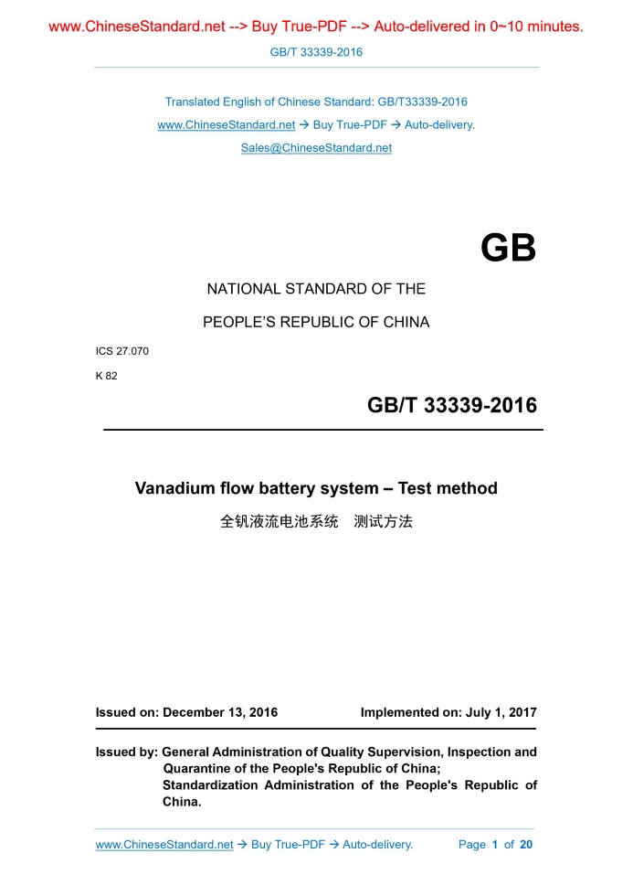 GB/T 33339-2016: Vanadium flow battery system - Test method Delivery: 9 seconds. True-PDF full-copy in English & invoice will be downloaded + auto-delivered via email. See step-by-step procedure Status: Valid GB/T 33339: Historical versions