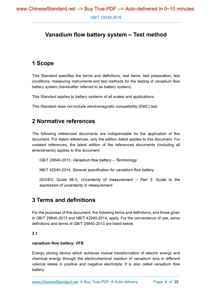 Similar standardsGB/T 33339-2016: Vanadium flow battery system - Test method---This is an excerpt. Full copy of true-PDF in English version (including equations, symbols, images, flow-chart, tables, and figures etc.), auto-downloaded/delivered in 9 seconds, can be purchased online: https://www.ChineseStandard.net/PDF.aspx/GBT33339-2016GB NATIONAL STANDARD OF THE PEOPLE’S REPUBLIC OF CHINA ICS 27.070 K 82 Vanadium flow battery system – Test method ISSUED ON: DECEMBER 13, 2016 IMPLEMENTED ON: JULY 1, 2017 Issued by: General Administration of Quality Supervision, Inspection and Quarantine of the People's Republic of China; Standardization Administration of the People's Republic of China. Table of ContentsForeword ... 3 1 Scope ... 4 2 Normative references ... 4 3 Terms and definitions ... 4 4 Test items ... 5 5 Test preparation ... 5 6 Test conditions ... 6 7 Measuring instruments ... 6 8 Test methods ... 8 9 Test reports ... 18 Annex A (Informative) Test reports ... 19 Vanadium flow battery system – Test method1 ScopeThis Standard specifies the terms and definitions, test items, test preparation, test conditions, measuring instruments and test methods for the testing of vanadium flow battery system (hereinafter referred to as battery system). This Standard applies to battery systems of all scales and applications. This Standard does not include electromagnetic compatibility (EMC) test.2 Normative referencesThe following referenced documents are indispensable for the application of this document. For dated references, only the edition dated applies to this document. For undated references, the latest edition of the referenced documents (including all amendments) applies to this document. GB/T 29840-2013, Vanadium flow battery – Terminology NB/T 42040-2014, General specification for vanadium flow battery ISO/IEC Guide 98-3, Uncertainty of measurement – Part 3: Guide to the expression of uncertainty in measurement3 Terms and definitionsFor the purposes of this document, the following terms and definitions, and those given in GB/T 29840-2013 and NB/T 42040-2014, apply. For the convenience of use, some definitions and terms of GB/T 29840-2013 are listed below. 3.1 vanadium flow battery; VFB Energy storing device which achieves mutual transformation of electric energy and chemical energy through the electrochemical reaction of vanadium ions in different valence states in positive and negative electrolyte. It is also called vanadium flow battery. where, κstack – the range coefficient; ηstack, max – the maximum value of energy efficiency in all stacks of battery system, in %; ηstack, max – the minimum value of energy efficiency in all stacks of battery system, in %; ηstack, avg – the average value of energy efficiency in all stacks of battery system, in %. 8.1.1.2 Voltage range test Voltage range test shall be carried out as follows: a) charge the battery system to 100% SOC; b) discharge the battery system at rated power; c) measure and record voltage Udn of each stack at regular intervals. Until the end of discharge, test points shall not be less than 5. The time interval for each test point shall be kept consistent; d) continue to discharge the battery system until discharge end-off condition; e) charge the battery system at rated power; f) measure and record voltage Ucn of each stack at regular intervals. Until the end of discharge, test points shall not be less than 5. The time interval for each test point shall be kept consistent; NOTE 1: It is recommended that the SOC at the end of discharge is 20% and the SOC at the end of charge is 80%. NOTE 2: The measurement time interval is as agreed on by user and manufacturer. g) calculate the voltage ranges during the charging process and discharging process of stack in accordance with Equation (3) and make data tables. NOTE 3: For a large-scale battery system, considering the operability of test, element cell systems can be selected to replace the battery system entireties to carry out test. where, ΔUstack, n – the voltage range of the nth test point of battery system; Maximum charge power test of the battery system is carried out as follows: a) maintain the battery system at 90% SOC; b) charge the battery system at the constant maximum power, with the charge time not less than 10 min; c) record the charge power of step b). 8.1.4.2 50% SOC maximum charge power test Maximum charge power test of the battery system is carried out as follows: a) maintain the battery system at 50% SOC; b) charge the battery system at the constant maximum power, with the charge time is not less than 10 min; c) record the charge power of step b). 8.1.4.3 10% SOC maximum charge power test Maximum charge power test of the battery system is carried out as follows: a) maintain the battery system at 10% SOC; b) charge the battery system at the constant maximum power, with the charge time not less than 10 min; c) record the charge power of step b). 8.1.5 Rated watt-hour capacity test Rated watt-hour capacity test of the battery system is carried out as follows: a) charge the battery system to 100% SOC; b) discharge the battery system at rated power to 30% SOC; c) continue to discharge at 30% of rated power until discharge end-off condition; d) record the SOC of the battery system during the discharging process; e) repeat steps a) ~ d) for three times; f) record the discharge watt-hour capacity and auxiliary energy consumption of the last charge cycle of battery system; g) calculate the rated discharge watt-hour capacity of the battery system in c) charge the battery system at rated power until charge end-off condition; d) discharge the battery system at rated power until discharge end-off condition; e) record the SOC of the battery system during charge and discharge; f) repeat steps c) ~ e) for three times; g) record the charge-discharge watt-hour capacity and auxiliary energy consumption of 3 charge-discharge cycles; h) calculate the battery system ener