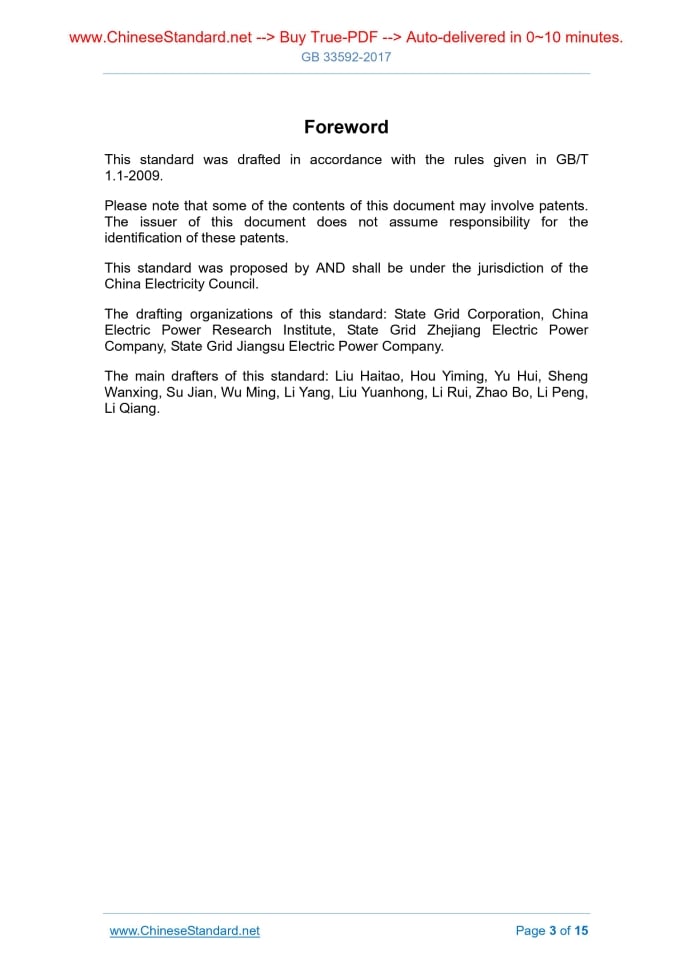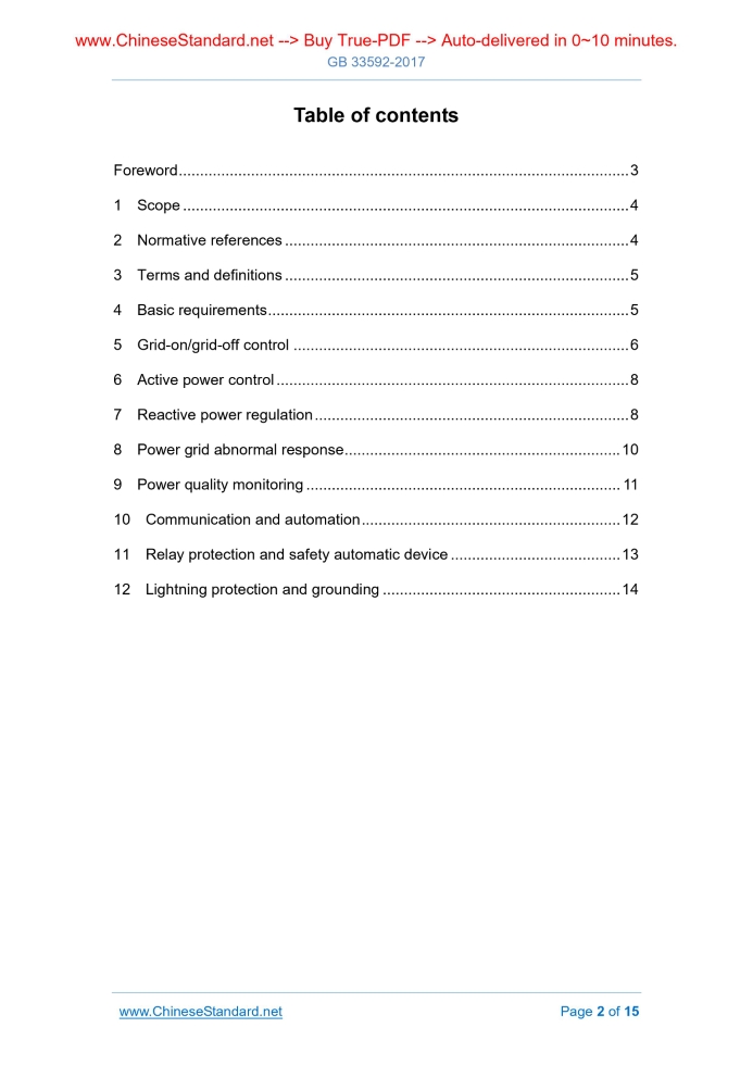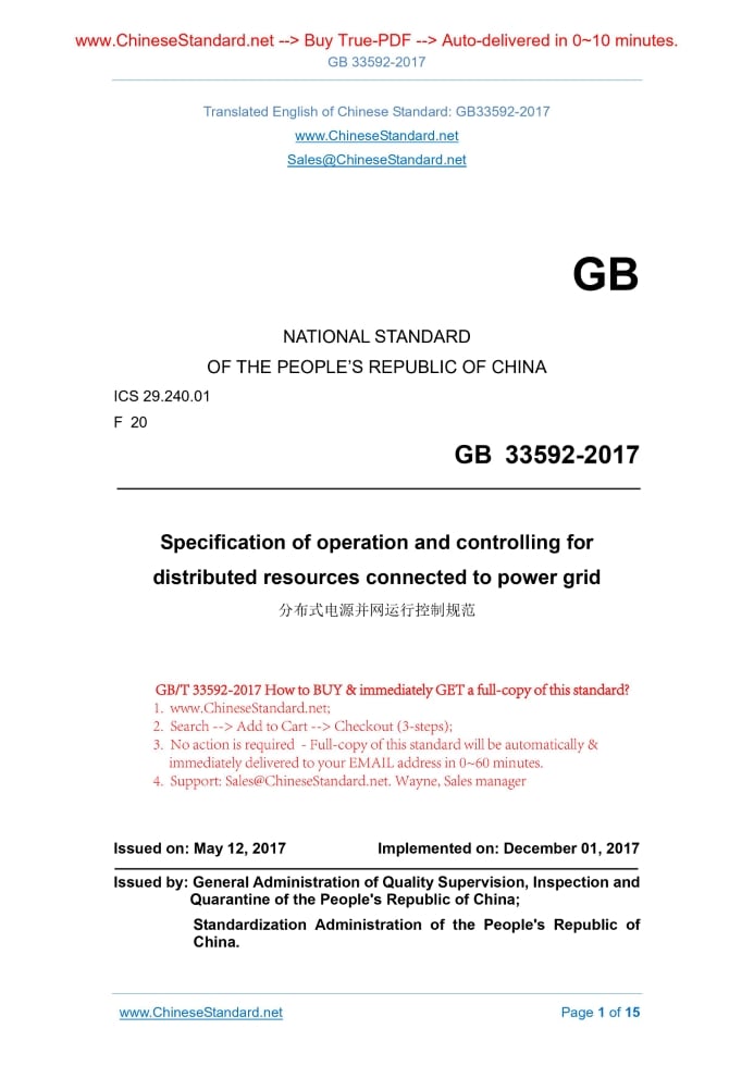 Similar standardsGB/T 33592-2017: Specification of operation and controlling for distributed resources connected to power grid---This is an excerpt. Full copy of true-PDF in English version (including equations, symbols, images, flow-chart, tables, and figures etc.), auto-downloaded/delivered in 9 seconds, can be purchased online: https://www.ChineseStandard.net/PDF.aspx/GBT33592-2017 GB NATIONAL STANDARD OF THE PEOPLE’S REPUBLIC OF CHINA ICS 29.240.01 F 20 Specification of operation and controlling for distributed resources connected to power grid Issued on: MAY 12, 2017 Implemented on: DECEMBER 01, 2017 Issued by. General Administration of Quality Supervision, Inspection and Quarantine of the People's Republic of China; Standardization Administration of the People's Republic of China. 3. No action is required - Full-copy of this standard will be automatically & immediately delivered to your EMAIL address in 0~60 minutes. Table of ContentsForeword ... 3 1 Scope ... 4 2 Normative references ... 4 3 Terms and definitions ... 5 4 Basic requirements ... 5 5 Grid-on/grid-off control ... 6 6 Active power control ... 8 7 Reactive power regulation ... 8 8 Power grid abnormal response ... 10 9 Power quality monitoring ... 11 10 Communication and automation ... 12 11 Relay protection and safety automatic device ... 13 12 Lightning protection and grounding ... 14ForewordThis standard was drafted in accordance with the rules given in GB/T 1.1-2009. Please note that some of the contents of this document may involve patents. The issuer of this document does not assume responsibility for the identification of these patents. This standard was proposed by AND shall be under the jurisdiction of the China Electricity Council. The drafting organizations of this standard. State Grid Corporation, China Electric Power Research Institute, State Grid Zhejiang Electric Power Company, State Grid Jiangsu Electric Power Company. The main drafters of this standard. Liu Haitao, Hou Yiming, Yu Hui, Sheng Wanxing, Su Jian, Wu Ming, Li Yang, Liu Yuanhong, Li Rui, Zhao Bo, Li Peng, Li Qiang. Specification of operation and controlling for distributed resources connected to power grid1 ScopeThis standard specifies the operation and controlling requirements for the distributed resources connected to power grid in such aspects as on-grid/off-grid control, active power control, reactive voltage regulation, power grid abnormal response, power quality monitoring, communication and automation, relay protection and safety automatic device, and lightning protection and grounding. This standard is suitable for the operation and controlling of the newly built, reconstructed, and extended distributed resources which are connected to the 35 kV and below voltage level power grid.2 Normative referencesThe following documents are essential to the application of this document. For the dated documents, only the versions with the dates indicated are applicable to this document; for the undated documents, only the latest version (including all the amendments) are applicable to this Standard. GB/T 12325 Power quality – Deviation of supply voltage GB/T 12326 Power quality – Power fluctuation and flicker GB 14050 Types and safety technical requirements of system earthing GB/T 14549 Quality of electric energy supply – Harmonics in public supply network GB/T 15945 Power quality – Frequency deviation for power system GB 26859 Safety code of electric power industry – Part of electric lines GB 26860 Safety code of electric power industry – Electric part of power plants and transformers GB 50057 Design code for protection of structures against lightning GB/T 50064 Code for design of overvoltage protection and insulation coordination for AC electrical installations GB 50065 Code for grounding design of AC electrical installations GB/T 33593-2017 Technical requirements for grid connection of distributed resources NB/T 33011 Technical specification for distributed resources connected to power grid NB/T 33015 Technical guideline for electrochemical energy storage system interconnecting with distribution network3 Terms and definitionsThe following terms and definitions apply to this document. 3.1 Point of interconnection As for the distributed resources which are connected to the grid through the transformer, it refers to the bus or node at the power grid side of the transformer. As for the distributed resources which are connected to the power grid not through the transformer, it refers to the output collection point of the distributed resources. 3.2 Point of common coupling It refers to the connection through which the user accesses to the public power grid. 3.3 Unintentional islanding It refers to the unplanned and uncontrolled occurrence of distributed power islanding. Note. The distributed resource islanding phenomenon refers to the self-independent operation which is composed of the distributed resources, local loads, and monitoring and controlling device which is independent of the public power grid.4 Basic requirements4.1 The distributed resources connected to the power grid shall have the testing report which is issued by the unit or department having corresponding qualifications, the testing items and testing methods shall comply with the provisions of NB/T 33011, AND the test results shall comply with the requirements of GB/T 33593-2017. 4.2 Before the distributed resources connected into the power grid, its operation management party and the power grid enterprise shall, in accordance with the principles of the unified scheduling and leveled 7.6 As for the distributed resources connected to the 10 (6) kV ~ 35 kV user internal power grid AND transmitted electricity to the public power grid, it is preferable for it to have the reactive voltage control function. Under the conditions that the distributed resource satisfies the reactive output range and the public connection point power factor limits, the power factor and voltage at it