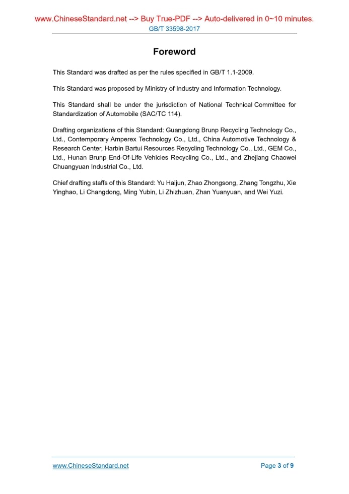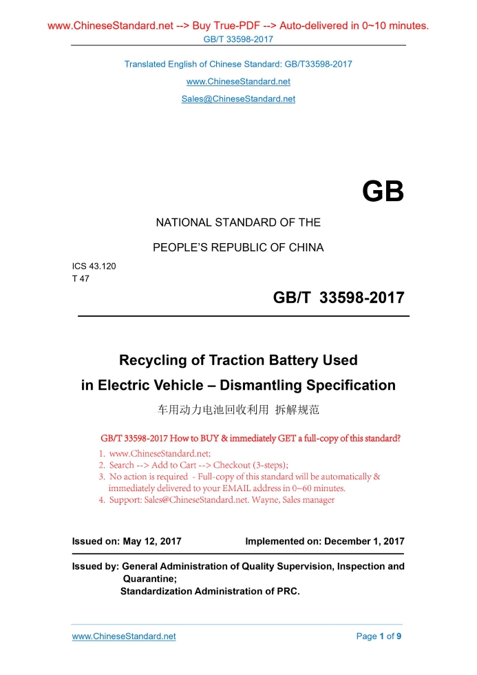 Similar standardsGB/T 33598-2017: Recycling of traction battery used in electric vehicle -- Dismantling specification---This is an excerpt. Full copy of true-PDF in English version (including equations, symbols, images, flow-chart, tables, and figures etc.), auto-downloaded/delivered in 9 seconds, can be purchased online: https://www.ChineseStandard.net/PDF.aspx/GBT33598-2017 GB NATIONAL STANDARD OF THE PEOPLE’S REPUBLIC OF CHINA ICS 43.120 T 47 Recycling of Traction Battery Used in Electric Vehicle – Dismantling Specification Issued on. MAY 12, 2017 Implemented on. DECEMBER 1, 2017 Issued by. General Administration of Quality Supervision, Inspection and Quarantine; Standardization Administration of PRC. Table of ContentsForeword... 3 1 Scope... 4 2 Normative References... 4 3 Terms and Definitions... 4 4 Overall Requirements... 5 5 Operation Procedures... 6 6 Storage and Management... 9ForewordThis Standard was drafted as per the rules specified in GB/T 1.1-2009. This Standard was proposed by Ministry of Industry and Information Technology. This Standard shall be under the jurisdiction of National Technical Committee for Standardization of Automobile (SAC/TC 114). Drafting organizations of this Standard. Guangdong Brunp Recycling Technology Co., Ltd., Contemporary Amperex Technology Co., Ltd., China Automotive Technology & Research Center, Harbin Bartui Resources Recycling Technology Co., Ltd., GEM Co., Ltd., Hunan Brunp End-Of-Life Vehicles Recycling Co., Ltd., and Zhejiang Chaowei Chuangyuan Industrial Co., Ltd. Chief drafting staffs of this Standard. Yu Haijun, Zhao Zhongsong, Zhang Tongzhu, Xie Yinghao, Li Changdong, Ming Yubin, Li Zhizhuan, Zhan Yuanyuan, and Wei Yuzi. Recycling of Traction Battery Used in Electric Vehicle – Dismantling Specification1 ScopeThis Standard specifies the terms and definitions, general requirements, operating procedures, storage and management requirements for vehicle used waste battery packs (cases), and module dismantling work. This Standard is applicable to the vehicle used waste lithium-ion traction battery, metal hydride nickel traction battery pack (case), and module dismantling; it is not applicable to the vehicle used waste traction battery single-cell dismantling.2 Normative ReferencesThe following documents are essential to the application of this document. For the dated documents, only the versions with the dates indicated are applicable to this document; for the undated documents, only the latest version (including all the amendments) are applicable to this document. GB 5085.7 Identification Standards for Hazardous Wastes – General Specifications GB 18597 Standard for Pollution Control on Hazardous Waste Storage GB 18599 Standard for Pollution on the Storage and Disposal Site for General Industrial Solid Wastes GB/T 19596 Terminology of Electric Vehicles HJ 2025 Technical Specifications for Collection, Storage, Transportation of Hazardous Waste3 Terms and DefinitionsThe following terms and definitions and those ones stipulated in GB/T 19596 are applicable to this document. 3.1 Dismantling The operation dismantling the waste traction battery pack (case) and module.4 Overall Requirements4.1 General requirements 4.1.1 When designing the traction battery, the manufacturer shall consider the dismantlability, recyclability and other green design factors. 4.2 Equipment requirements 4.2.1 Shall equip with insulation gloves, protective gloves against the mechanical harm, safety helmet, insulation shoes (boots), protective mask, anti-electronic shock insulated rescue hook, and the like protective equipment. 4.3 Site requirements 4.3.1 The dismantling and storing sites shall have security facilities, such as fire facilities, alarm facilities, emergency facilities, etc. 4.3.2 The ground of dismantling and storing sites shall be hardened and anti-leakage; have the environmental protection facilities, for instance, the wastewater treatment system. 4.3.3 The dismantling and storing sites shall keep dry and ventilated, good light, and far away from the residential areas. 4.4 Safety requirements 4.4.1 Personnel safety 4.4.3 Dismantling security 4.4.3.1 Independent operation during the dismantling period shall be strictly forbidden, the dismantling work shall be carried out as per the prepared dismantling procedures and operation instructions. 4.4.3.4 After the dismantling, take insulation treatment against the waste traction battery module and single-cell.5 Operation Procedures5.1 Operation flow chart 5.1.1 The operating procedures of waste traction battery dismantling shall strictly follow three principles of safety, environmental protection and resource recycling. 5.2 Pre-treatment 5.2.1 Collect the waste traction battery’s model, manufacturer, voltage, nominal capacity, size, mass, and the like information. 5.2.2 For the liquid cooling traction battery, the special pumping system shall be adopted to discharge the coolant fully, and use special container to collect the coolant. 5.3 Dismantling 5.3.1 Traction battery pack (case) dismantling 5.3.1.3 After removal the shell, firstly dismantle brackets, partitions, and the like auxiliary fixing parts. 5.3.1.4 Use the insulation tools to remove the high-voltage wiring harness, circuit board, battery management system, high-voltage safety box and the like functional components. 5.3.2 Traction battery module dismantling 5.3.2.1 Special module-dismantling device shall be adopted to dismantle the module safely and environmentally. 5.3.2.2 Adopt the special lifting tools and lifting devices to lift the traction battery module to the dismantling tooling platform or module dismantling equipment inlet. 5.3.2.4 After removal of the shell, adopt the insulation tools to dismantle the conductor, connections strap and the like connection components, so that separate the single-cell of battery.6 Storage and Management6.1 Identify and classify the collected waste liquid and waste solid substance according to the pro