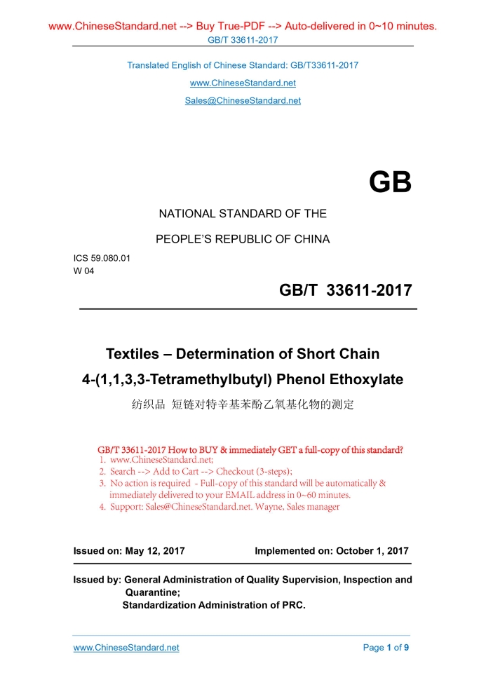 GB/T 33611-2017: Textiles -- Determination of short chain 4- (1, 1, 3, 3-tetramethylbutyl) phenol ethoxylate Delivery: 9 seconds. True-PDF full-copy in English & invoice will be downloaded + auto-delivered via email. See step-by-step procedure Status: Valid