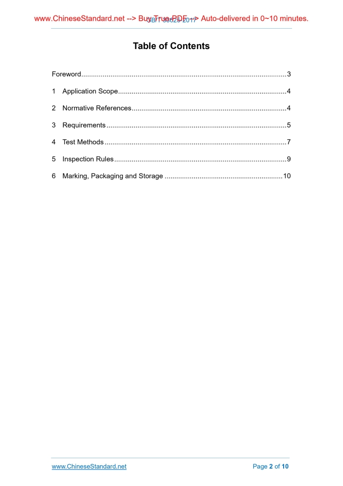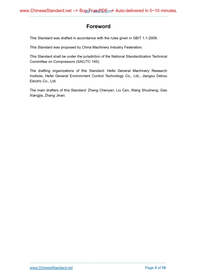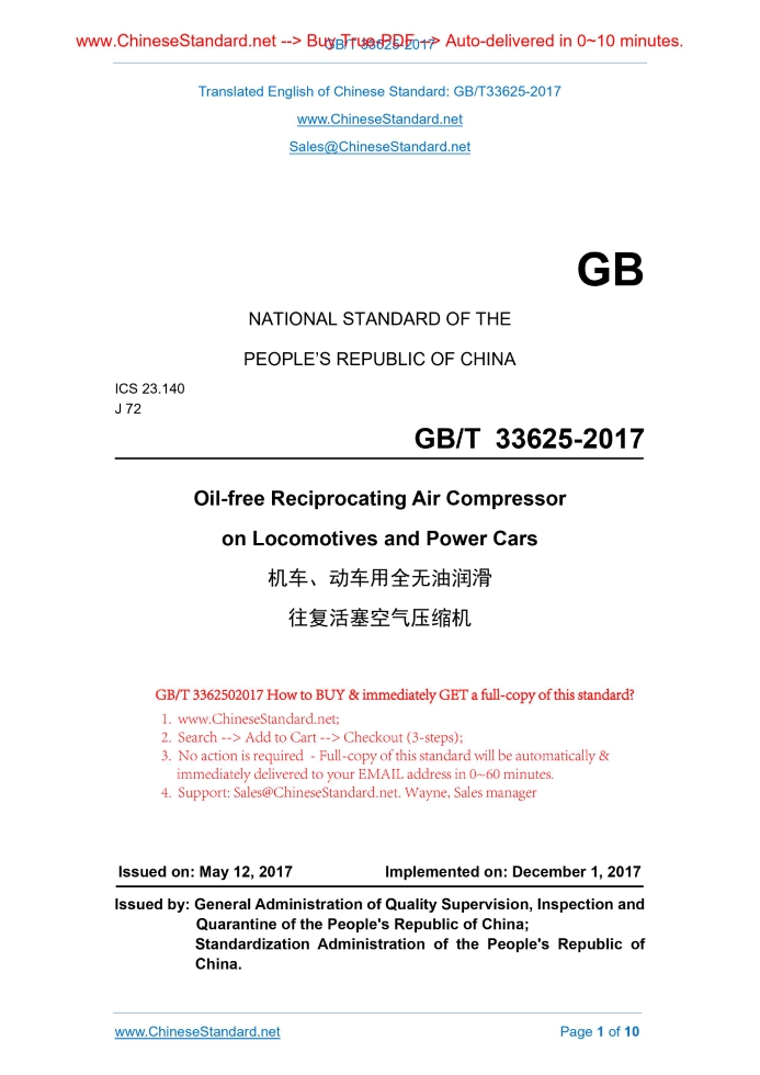 Similar standardsGB/T 33625-2017: Oil-free Reciprocating Air Compressor on Locomotives and Power Cars---This is an excerpt. Full copy of true-PDF in English version (including equations, symbols, images, flow-chart, tables, and figures etc.), auto-downloaded/delivered in 9 seconds, can be purchased online: https://www.ChineseStandard.net/PDF.aspx/GBT33625-2017GB NATIONAL STANDARD OF THE PEOPLE’S REPUBLIC OF CHINA ICS 23.140 J 72 Oil-free Reciprocating Air Compressor on Locomotives and Power Cars Issued on: MAY 12, 2017 Implemented on: DECEMBER 1, 2017 Issued by. General Administration of Quality Supervision, Inspection and Quarantine of the People's Republic of China; Standardization Administration of the People's Republic of China. 3. No action is required - Full-copy of this standard will be automatically & immediately delivered to your EMAIL address in 0~60 minutes. Table of ContentsForeword ... 3 1 Application Scope ... 4 2 Normative References ... 4 3 Requirements ... 5 4 Test Methods ... 7 5 Inspection Rules ... 9 6 Marking, Packaging and Storage ... 10ForewordThis Standard was drafted in accordance with the rules given in GB/T 1.1-2009. This Standard was proposed by China Machinery Industry Federation. This Standard shall be under the jurisdiction of the National Standardization Technical Committee on Compressors (SAC/TC 145). The drafting organizations of this Standard. Hefei General Machinery Research Institute, Hefei General Environment Control Technology Co., Ltd., Jiangsu Dehou Electric Co., Ltd. The main drafters of this Standard. Zhang Chenyan, Liu Cen, Wang Shusheng, Gao Xiangjia, Zhang Jinan. Oil-free Reciprocating Air Compressor on Locomotives and Power Cars1 Application ScopeThis Standard specifies the requirements, test methods, inspection rules and marking, packaging and storage of air-cooling, single-stage, single-action, direct-drive oil-free reciprocating air compressors (hereinafter referred to as “air compressors”) used on the pantograph system of locomotives and power cars. This Standard applies to air compressors used on the pantograph system of locomotives and power cars, whose rated discharge pressure is not greater than 1.0 MPa.2 Normative ReferencesThe following referenced documents are indispensable for the application of this document. For dated references, only the edition dated applies to this document. For undated references, the latest edition of the referenced documents (including all amendments) applies to this Standard. GB/T 755, Rotating Electrical Machines – Rating and Performance GB/T 3853, Displacement Compressor – Acceptance Tests GB/T 4208, Degrees of Protection Provided by Enclosure (IP Code) GB/T 4980, Determination of Sound Level for Noise Emitted by Displacement Compressors GB/T 7777, Measurement and Evaluation of Mechanical Vibration of Displacement Compressors GB/T 9438, Aluminum Alloy Castings GB/T 9440, Malleable Iron Castings GB/T 11021, Electrical Insulation – Thermal Evaluation and Designation GB/T 13306, Plate GB/T 15115, Die Casting Aluminum Alloys GB/T 15487, Methods of Flow Measurement for Displacement Compressor GB 19153, Minimum Allowable Values of Energy Efficiency and Energy Efficiency Grades for Displacement Air Compressors GB/T 21563-2008, Railway Applications – Rolling Stock Equipment – Shock and Vibration Tests GB 22207, Safety Requirements of Displacement Air Compressor JB/T 6431, Gray Iron Castings for Displacement Compressor – Specification JB/T 7663.1, Packaging Technical Condition of Displacement Compressors JB/T 7663.2, Coating Specifications for Displacement Compressors JB/T 8934, Direct Drive Portable Reciprocating Piston Air Compressor JB/T 9104, The Technical Specification for Spheroidal Araphite Iron Castings of Displacement Compressors TB/T 1126, Standard Voltage for Locomotive Control and Light Circuit3 Requirements3.1 General requirements 3.1.1 Air compressors shall comply with this Standard; they shall be manufactured in accordance with the drawings and technical documents which are approved through specified procedures. 3.1.2 Specified operating conditions of air compressors a) suction pressure. 0.1 MPa (absolute pressure); b) suction temperature. 20°C; c) suction relative humidity. 0; d) rated discharge pressure. 0.8 MPa; e) operating voltage. DC 110 V; f) rotational speed. as specified in the product technical documents, expressed in r/min. 3.1.3 Air compressors shall be capable of operating normally under the following service environmental conditions. a) the altitude not more than 2 500 m; 4.1.2 The testing of the input specific power of air compressors shall be conducted as specified in GB 19153. 4.1.3 The testing of the noise power level of air compressors shall be conducted as specified in GB/T 4980. 4.1.4 The testing of the mechanical vibration intensity of air compressors shall be conducted as specified in GB/T 7777. 4.2 Environment adaptation 4.2.1 High-temperature test 4.2.1.1 After storing air compressors for 2 h under the environmental conditions of 40°C, start the machine for continuous operation for 2 h. the operating voltage during operation is DC 110 V and the discharge pressure is the rated discharge pressure. Measure the discharge temperature of air compressors at this moment, which shall be as specified in this Standard. 4.2.1.2 Install the air compressors under the environmental conditions of 70°C which are installed inside the car body in actual use or install the air compressors under the environmental conditions of 50°C which are installed inside the car body; store for 2 h; start the machine to run continuously for 10 min. the operating voltage during operating is DC 110 V and the discharge pressure is the rated discharge pressure. Measure the discharge temperature of air compressors at this moment, which shall be as specified in this Standard. 4.2.2 Low-temperature test After storing air compressors for 2 h under the environmental conditions of - 40°C, air
