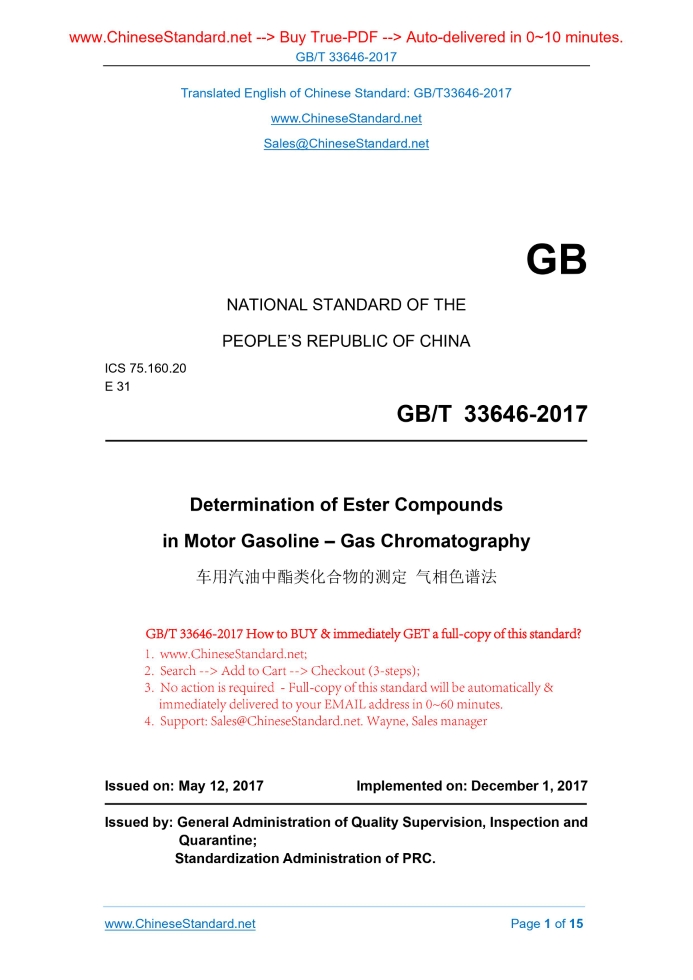 GB/T 33646-2017: Determination of Ester Compounds in Motor Gasoline - Gas Chromatography Delivery: 9 seconds. True-PDF full-copy in English & invoice will be downloaded + auto-delivered via email. See step-by-step procedure Status: Valid