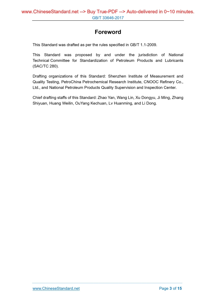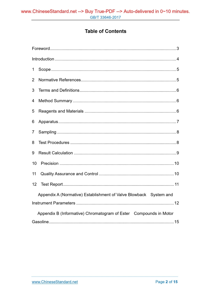 Similar standardsGB/T 33646-2017: Determination of Ester Compounds in Motor Gasoline - Gas Chromatography---This is an excerpt. Full copy of true-PDF in English version (including equations, symbols, images, flow-chart, tables, and figures etc.), auto-downloaded/delivered in 9 seconds, can be purchased online: https://www.ChineseStandard.net/PDF.aspx/GBT33646-2017GB NATIONAL STANDARD OF THE PEOPLE’S REPUBLIC OF CHINA ICS 75.160.20 E 31 Determination of Ester Compounds in Motor Gasoline – Gas Chromatography Issued on: MAY 12, 2017 Implemented on: DECEMBER 1, 2017 Issued by. General Administration of Quality Supervision, Inspection and Quarantine; Standardization Administration of PRC. 3. No action is required - Full-copy of this standard will be automatically & immediately delivered to your EMAIL address in 0~60 minutes. Table of ContentsForeword ... 3 Introduction ... 4 1 Scope ... 5 2 Normative References ... 5 3 Terms and Definitions ... 6 4 Method Summary ... 6 5 Reagents and Materials ... 6 6 Apparatus ... 7 7 Sampling ... 8 8 Test Procedures ... 8 9 Result Calculation ... 9 10 Precision ... 10 11 Quality Assurance and Control ... 10 12 Test Report ... 11 Appendix A (Normative) Establishment of Valve Blowback System and Instrument Parameters ... 12 Appendix B (Informative) Chromatogram of Ester Compounds in Motor Gasoline ... 15ForewordThis Standard was drafted as per the rules specified in GB/T 1.1-2009. This Standard was proposed by and under the jurisdiction of National Technical Committee for Standardization of Petroleum Products and Lubricants (SAC/TC 280). Drafting organizations of this Standard. Shenzhen Institute of Measurement and Quality Testing, PetroChina Petrochemical Research Institute, CNOOC Refinery Co., Ltd., and National Petroleum Products Quality Supervision and Inspection Center. Chief drafting staffs of this Standard. Zhao Yan, Wang Lin, Xu Dongyu, Ji Ming, Zhang Shiyuan, Huang Weilin, OuYang Kechuan, Lv Huanming, and Li Dong. Determination of Ester Compounds in Motor Gasoline – Gas Chromatography Warning – personnel using this Standard shall have practical working experience in the formal laboratory. The use of this Standard may involve certain hazardous materials, equipment and operation; this Standard doesn’t address all possible safety issues. The users shall be responsible for taking appropriate safety and health measures, and ensure compliance with the conditions stipulated in the relevant national regulations.1 ScopeThis Standard specifies the determination method of ester compounds (ethyl acetate, sec-butyl acetate, dimethyl carbonate) in the motor gasoline. This Standard is applicable to determine the motor gasoline, ester compounds with concentration of 50mg/L ~ 2000mg/L; this Method can also determine beyond such content range; however, the precision is not investigated. This Standard is not applicable to alcohol-containing gasoline; Certain alcoholic compounds (such as methanol, ethanol, tert-amyl alcohol, and sec-butanol) and ketone compounds (such as acetone and butanone) may interfere the determination of ester compounds.2 Normative ReferencesThe following documents are essential to the application of this document. For the dated documents, only the versions with the dates indicated are applicable to this document; for the undated documents, only the latest version (including all the amendments) are applicable to this document. GB/T 1884 Crude Petroleum and Liquid Petroleum Products - Laboratory Determination of Density - Hydrometer Method GB/T 1885 Petroleum Measurement Tables GB/T 4756 Method for Manual Sampling of Petroleum Liquids GB/T 6683 Petroleum Products - Determination of Precision Data in relation to Methods of Test 6.4 Electronic balance. accurate to 0.0001g. 6.5 Volumetric flask. 100mL. 6.6 Sample flask. small glass flask covered with gland or threaded buckle cap, and there is a rubber gasket with polytetrafluoroethylene outer surface in the cap. 6.7 Pipette. 0.5mL, 1.0mL, 2.0mL, 5.0mL.7 Sampling7.1 Sampling shall be performed as per GB/T 4756 or other equivalent method. 7.2 Since the laboratory receives the sample, the original container shall be cooled and stored at 0°C~5°C before sampling of any sub-samples. 7.3 If necessary, transfer the cooling sample into the pressure-sealed container, store at 0°C~5°C till analysis is required.8 Test Procedures8.1 Gas chromatographic conditions If different instruments are used, then the optimal analysis conditions may be different; thus, it is impossible to give the general parameters for the gas chromatographic analysis. The setting parameters shall ensure the to-be-tested components to be separated and tested effectively. The parameters given in Appendix A are proven to be feasible. 8.2 Sample injection Directly take about 1.5mL of sample and place it into 2.0mL sample flask (6.6); manually or take autosampler to inject 1.0µL specimen into gas chromatograph (6.1); perform the chromatographic analysis according to the optimized method conditions. If the content of ester compounds in the sample exceeds the test range specified in Clause 1, the sample shall be suitably diluted (for instance, isooctane – xylene solution with volume ratio of 5.1). 8.3 Qualitative analysis Test the standard working solution (5.5) and specimen under the same instrument analysis conditions; perform the qualitative analysis according to the retention time of ester compounds chromatographic peak. The reference retention time of 3 kinds of ester compounds can refer to Appendix B.Appendix A(Normative) Establishment of Valve Blowback System and Instrument Parameters A.1 Establishment of valve blowback column system A.1.1 Adjust the valve to the positive blow position (1 in Figure A.1); adjust the flowrate to control Valve A, so that the flowrate can reach the setting value in Table A.1. Measure the flowrate on the detector exit sample side. A.1.2 Adjust the valve to the blowback position (2 in Figure A.1)