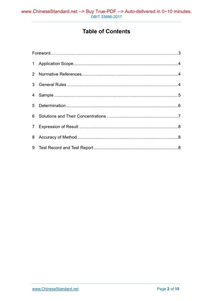Similar standardsGB/T 33686-2017: General Rules for Analytical and Testing Methods of Coal Mine Water---This is an excerpt. Full copy of true-PDF in English version (including equations, symbols, images, flow-chart, tables, and figures etc.), auto-downloaded/delivered in 9 seconds, can be purchased online: https://www.ChineseStandard.net/PDF.aspx/GBT33686-2017GB NATIONAL STANDARD OF THE PEOPLE’S REPUBLIC OF CHINA ICS 13.060.30 Z 23 General Rules for Analytical and Testing Methods of Coal Mine Water Issued on: MAY 12, 2017 Implemented on: DECEMBER 1, 2017 Issued by. General Administration of Quality Supervision, Inspection and Quarantine of the People's Republic of China; Standardization Administration of the People's Republic of China. 3. No action is required - Full-copy of this standard will be automatically & immediately delivered to your EMAIL address in 0~60 minutes. Table of ContentsForeword ... 3 1 Application Scope ... 4 2 Normative References ... 4 3 General Rules ... 4 4 Sample ... 5 5 Determination ... 6 6 Solutions and Their Concentrations ... 7 7 Expression of Result ... 8 8 Accuracy of Method ... 8 9 Test Record and Test Report ... 8ForewordThis Standard was drafted in accordance with the rules given in GB/T 1.1-2009. This Standard was proposed by China Coal Industry Association. This Standard shall be under the jurisdiction of the National Standardization Technical Committee on Coal (SAC/TC 42). The drafting organizations of this Standard. Chongqing Institute of Geology and Mineral Resources, Chongqing Juneng Construction Group Co., Ltd. The main drafters of this Standard. Zhu Zhenzhong, Tong Chunlin, Li Chengtao, Yang Tianfu. General Rules for Analytical and Testing Methods of Coal Mine Water1 Application ScopeThis Standard specifies the general rules, sample, determination, solutions and their concentration, expression of results, accuracy of method, test record and test report of analysis and testing of coal mine water. This Standard applies to the analysis and testing of coal mine water.2 Normative ReferencesThe following referenced documents are indispensable for the application of this document. For dated references, only the edition dated applies to this document. For undated references, the latest edition of the referenced documents (including all amendments) applies to this Part. GB/T 601, Chemical Reagent – Preparations of Standard Volumetric Solutions GB 3100, The International System of Units and Its Application GB/T 3101, General Principles Concerning Quantities, Units and Symbols GB 3102 (all parts), Quantities and Units GB/T 6379.2, Accuracy (Trueness and Precision) of Measurement Methods and Results – Part 2. Basic Method for the Determination of Repeatability and Reproducibility of a Standard Measurement Method GB/T 6682, Water for Analytical Laboratory Use – Specification and Test Methods GB/T 8170, Rules of Rounding off for Numerical Values and Expression and Judgement of Limiting Values GB/T 8538, Methods for Examination of Drinking Natural Mineral Water3 General Rules3.1 The analytical methods listed in the analytical standard of coal mine water may be used in arbitration analysis, validation of other analytical methods, standard substance fixed value analysis and routine analysis. 5.4 Blank test Blank test shall be carried out for chemical analysis while samples are tested. The same flask of reagent prepared solution shall be used for blank test and sample test; and meanwhile, they shall be carried out under the same procedures and conditions. Blank values shall be deducted in the results calculated.6 Solutions and Their Concentrations6.1 Unless specified otherwise, the water used in the preparation of solutions and process of analysis shall be grade-3 water specified in GB/T 6682. 6.2 All solutions using water as solvents are water solutions, usually abbreviation solutions; solution using other liquids as solvents shall be named with the name of solvents in front. 6.3 The frequently-used solution concentrations in standards are expressed as follows. a) the mass concentration of substance B. the mass of substance B divided by the total volume of mixture. It is usually expressed in g/L, mg/L, mg/mL, μg/mL and ng/mL; b) the amount-of-substance concentration of substance B or the concentration of substance B. the amount-of-substance of substance B divided by the total volume of mixture. It is usually expressed in mol/L and mmol/L. The basic element form of solute shall be indicated in actual applications; c) the mass fraction of substance B. the ratio of the mass of solute to the mass of solution (solute + solvent), i.e. the ratio of the mass of substance B to the mass of mixture, which is usually expressed in %, 10-2, 10-4, 10-6 and 10-9; d) the mass ratio. the ratio of two masses of a certain constituent in the mixtures. It is expressed by “m1 + m2”, i.e. the reagents of mass m1 and mass m2 mixed up; e) the volume fraction of substance B. the ratio of the volumes of pure substance B and mixture under the same temperature and pressure, which is usually expressed in mL/L or its fraction or multiple; f) the volume ratio. the ratio of liquid reagent to solvent. It is expressed by “V1 + V2”, i.e. the certain solution of volume V1 added to the solvent of volume V2. 6.4 The conversion factors in the method standard and the concentrations of standard solutions shall be rounded off to four significant digits. 6.5 The calibration of solutions shall be as specified in GB/T 601. a) test item name, record form management number, marking of page number and total pages number; b) test date; c) test standard or method, and name and number of main apparatus used; d) sample number in laboratory; e) sample pretreatment (if necessary); f) test data; g) test result and calculation; h) environmental conditions for test; i) tester and reviewer; j) other issues that need to be addressed or content that needs to be added (if necessary). 9.2 Test report Test re