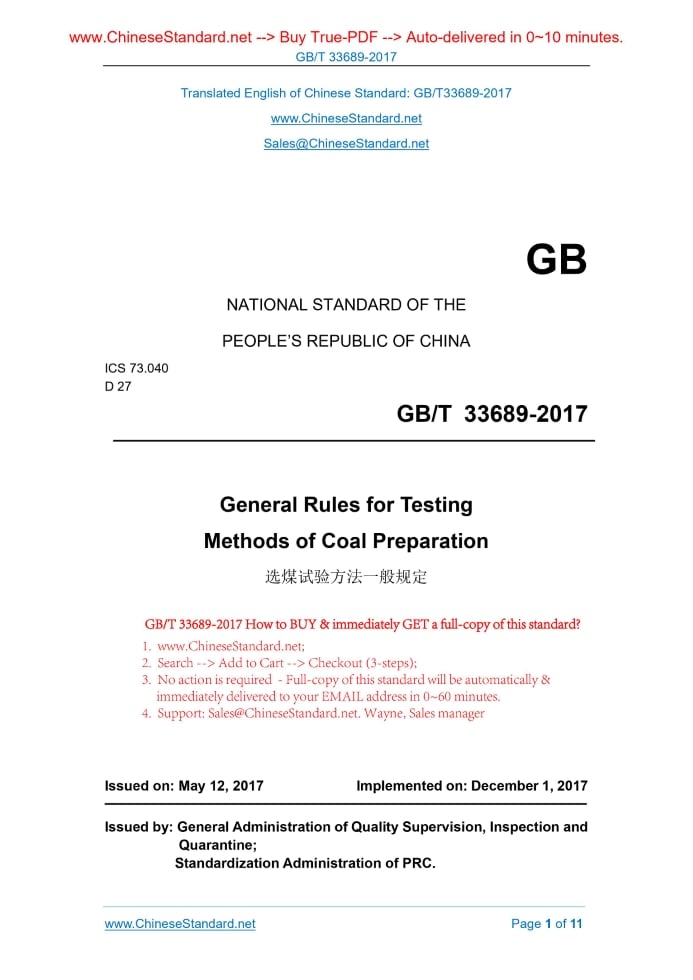 GB/T 33689-2017: General Rules for Testing Methods of Coal Preparation Delivery: 9 seconds. True-PDF full-copy in English & invoice will be downloaded + auto-delivered via email. See step-by-step procedure Status: Valid