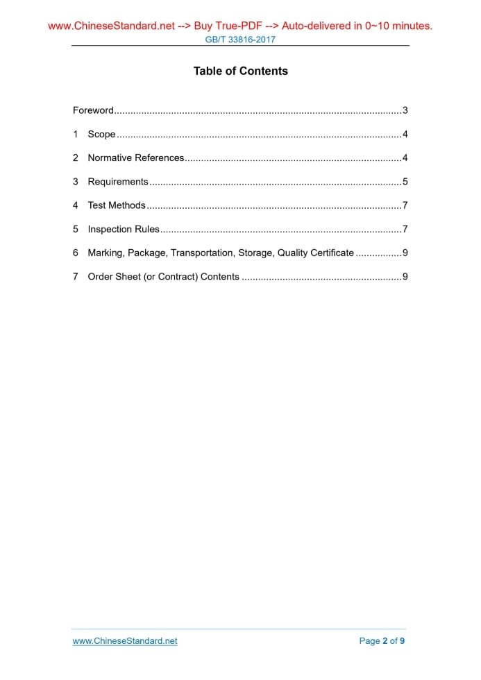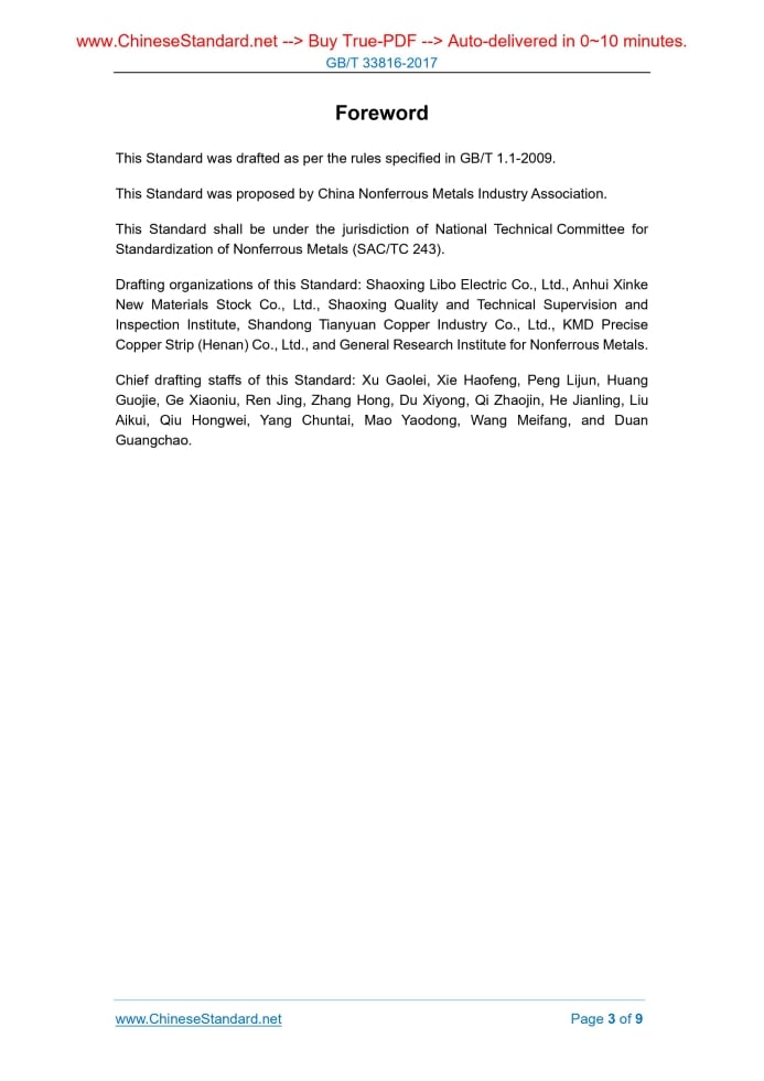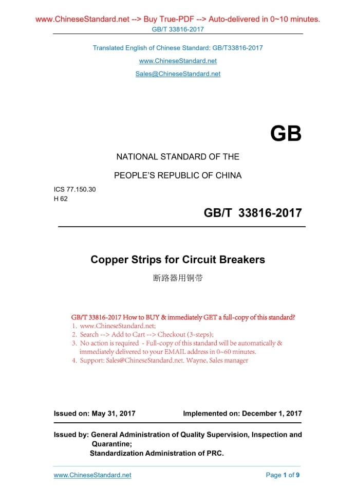Similar standardsGB/T 33816-2017: Copper strips for circuit breakers---This is an excerpt. Full copy of true-PDF in English version (including equations, symbols, images, flow-chart, tables, and figures etc.), auto-downloaded/delivered in 9 seconds, can be purchased online: https://www.ChineseStandard.net/PDF.aspx/GBT33816-2017GB NATIONAL STANDARD OF THE PEOPLE’S REPUBLIC OF CHINA ICS 77.150.30 H 62 Copper Strips for Circuit Breakers Issued on: MAY 31, 2017 Implemented on: DECEMBER 1, 2017 Issued by. General Administration of Quality Supervision, Inspection and Quarantine; Standardization Administration of PRC. 3. No action is required - Full-copy of this standard will be automatically & immediately delivered to your EMAIL address in 0~60 minutes. Table of ContentsForeword ... 3 1 Scope ... 4 2 Normative References ... 4 3 Requirements ... 5 4 Test Methods ... 7 5 Inspection Rules ... 7 6 Marking, Package, Transportation, Storage, Quality Certificate ... 9 7 Order Sheet (or Contract) Contents ... 9ForewordThis Standard was drafted as per the rules specified in GB/T 1.1-2009. This Standard was proposed by China Nonferrous Metals Industry Association. This Standard shall be under the jurisdiction of National Technical Committee for Standardization of Nonferrous Metals (SAC/TC 243). Drafting organizations of this Standard. Shaoxing Libo Electric Co., Ltd., Anhui Xinke New Materials Stock Co., Ltd., Shaoxing Quality and Technical Supervision and Inspection Institute, Shandong Tianyuan Copper Industry Co., Ltd., KMD Precise Copper Strip (Henan) Co., Ltd., and General Research Institute for Nonferrous Metals. Chief drafting staffs of this Standard. Xu Gaolei, Xie Haofeng, Peng Lijun, Huang Guojie, Ge Xiaoniu, Ren Jing, Zhang Hong, Du Xiyong, Qi Zhaojin, He Jianling, Liu Aikui, Qiu Hongwei, Yang Chuntai, Mao Yaodong, Wang Meifang, and Duan Guangchao. Copper Strips for Circuit Breakers1 ScopeThis Standard specifies the requirements, test methods, inspection rules, marking, package, transportation, storage, quality certificate and order sheet (contract) content of copper strips for circuit breakers This Standard is applicable to the copper strips for circuit breakers.2 Normative ReferencesThe following documents are essential to the application of this document. For the dated documents, only the versions with the dates indicated are applicable to this document; for the undated documents, only the latest version (including all the amendments) are applicable to this document. GB/T 228.1-2010 Metallic Materials – Tensile Testing – Part 1. Method of Test at Room Temperature GB/T 351 Metallic Materials – Resistivity Measurement Method GB/T 4340.1 Metallic Materials – Vickers Hardness Test – Part 1. Test Method GB/T 5121 (all parts) Methods for Chemical Analysis of Copper and Copper Alloys GB/T 5231 Designation and Chemical Composition of Wrought Copper and Copper Alloys GB/T 8888 Wrought Heavy Non-Ferrous Metal Products – Packing, Marking, Transporting and Storing GB/T 26303.3 Measuring Methods for Dimensions and Shapes of Wrought Copper and Copper Alloys – Part 3. Sheets and Strips YS/T 478 Method for Electrical Conductivity Measurement of Copper and Copper Alloys by Use of Eddy Current YS/T 482 Method for Analysis of Copper and Copper Alloys – The Atomic Emission Spectrometry YS/T 668 Sampling Method of Physical and Chemical Testing for Copper and4 Test Methods4.1 Chemical compositions The inspection of strip chemical compositions shall be performed as per the provisions of GB/T 5121 (all parts) or YS/T 482; the arbitration analysis method shall be performed as per the provisions of GB/T 5121 (all parts). 4.2 Shape size and permissible deviation The inspection of strip shape size and permissible deviation shall be performed as per the provisions of GB/T 26303.3. 4.3 Mechanical property 4.3.1 The tensile test of strip shall be performed as per the provisions of GB/T 228.1- 2010; its shape size and specimen number shall conform to the provisions of P04 or P08 in Table D.2. 4.3.2 The Vickers hardness test of strip shall be performed as per the provisions of GB/T 4340.1. 4.4 Electrical property The electrical property test of strip shall be performed as per the provisions of GB/T 351 or YS/T 478. When arbitrating, it shall be performed as per the provisions of GB/T 351. 4.5 Surface quality The surface quality of strip shall be examined visually.5 Inspection Rules5.1 Inspection and acceptance 5.1.1 The strip shall be inspected by the quality supervision department of the supplier; ensure that the product quality conforms to the provisions of this Standard and order sheet (or contract); and fill in the product quality certificate. 5.1.2 The purchaser shall be re-inspected the product received according to the provisions of this Standard and order sheet (or contract); if the re-inspection results are inconsistent with the provisions of this Standard and order sheet (or contract), it shall be submitted to the supplier within 3 months in written form, then shall be solved through negotiation between the supplier and purchaser. The problems that belong to 5.5.2 When the shape size, permissible deviation and surface quality of strip are disqualified, then such batch of strip is disqualified. 5.5.3 When there is disqualified specimen in mechanical property and electrical property test results, take double quantity of specimens from such batch of strips (including the originally disqualified roll of strip in the test) to re-test; if the re-test results are qualified totally, then the whole batch of products are qualified. If there is still disqualified product in the re-test results, then such batch (or such roll) of strip is disqualified; then the supplier is allowed to check roll by roll, only the qualified roll can be delivered.6 Marking, Package, Transportation, Storage, QualityCertificate The marking, package, transportation, storage and quality certificate of strip shall conform to the pr