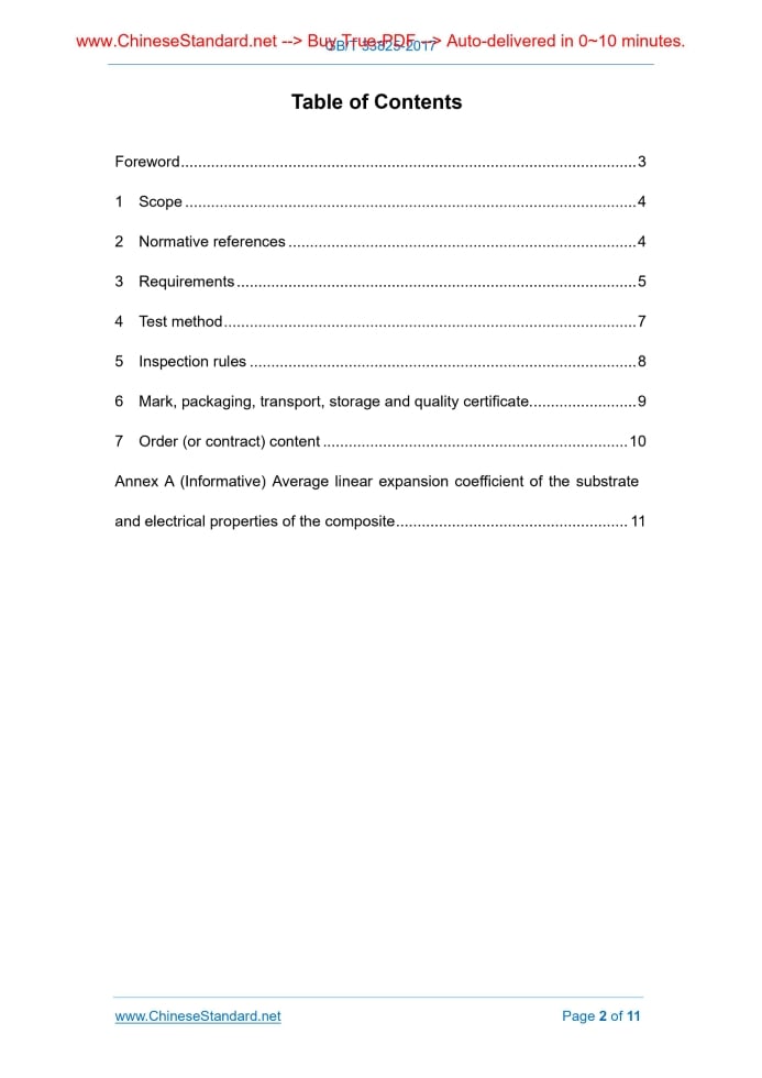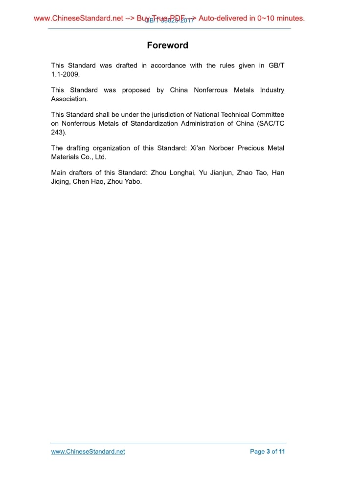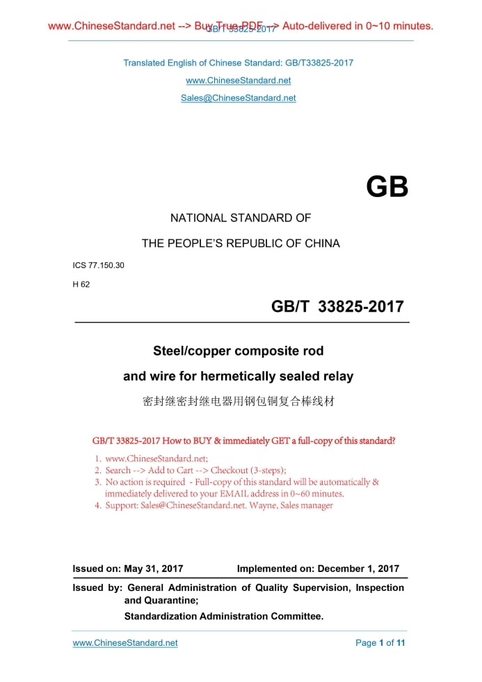 Similar standardsGB/T 33825-2017: Steel/copper composite rod and wire for hermetically sealed relay---This is an excerpt. Full copy of true-PDF in English version (including equations, symbols, images, flow-chart, tables, and figures etc.), auto-downloaded/delivered in 9 seconds, can be purchased online: https://www.ChineseStandard.net/PDF.aspx/GBT33825-2017GB NATIONAL STANDARD OF THE PEOPLE’S REPUBLIC OF CHINA ICS 77.150.30 H 62 Steel/copper composite rod and wire for hermetically sealed relay Issued on: MAY 31, 2017 Implemented on: DECEMBER 1, 2017 Issued by. General Administration of Quality Supervision, Inspection and Quarantine; Standardization Administration Committee. 3. No action is required - Full-copy of this standard will be automatically & immediately delivered to your EMAIL address in 0~60 minutes. Table of ContentsForeword ... 3 1 Scope ... 4 2 Normative references ... 4 3 Requirements ... 5 4 Test method ... 7 5 Inspection rules ... 8 6 Mark, packaging, transport, storage and quality certificate... 9 7 Order (or contract) content ... 10 Annex A (Informative) Average linear expansion coefficient of the substrate and electrical properties of the composite ... 11ForewordThis Standard was drafted in accordance with the rules given in GB/T 1.1-2009. This Standard was proposed by China Nonferrous Metals Industry Association. This Standard shall be under the jurisdiction of National Technical Committee on Nonferrous Metals of Standardization Administration of China (SAC/TC 243). The drafting organization of this Standard. Xi'an Norboer Precious Metal Materials Co., Ltd. Main drafters of this Standard. Zhou Longhai, Yu Jianjun, Zhao Tao, Han Jiqing, Chen Hao, Zhou Yabo. Steel/copper composite rod and wire for hermetically sealed relay1 ScopeThis Standard specifies the requirements, test methods, inspection rules, marks, packaging, transport, storage, quality certificate and order (or contract) of steel/copper composite rod and wire for hermetically sealed relay. This Standard applies to steel/copper composite rod and wire for hermetically sealed relay (hereinafter referred to as the composite rod and wire).2 Normative referencesThe following referenced documents are indispensable for the application of this document. For dated references, only the edition cited applies. For undated references, the latest edition of the referenced document (including any amendments) applies. GB/T 223.20, Methods for chemical analysis of iron steel and alloy - The Potentiometric titration method for the determination of cobalt content GB/T 223.25, Methods for chemical analysis of iron, steel and alloy - The dimethylglyoxime gravimetric method for the determination of nickel content GB/T 3077, Alloy structure steels GB/T 4336, Standard test method for spark discharge atomic emission spectrometric analysis of carbon and low-alloy steel (routine method) GB/T 5121(all parts), Methods for chemical analysis of copper and copper alloys GB/T 5231, Designation and chemical composition of wrought copper and copper alloys GB/T 6462, Metallic and oxide coatings - Measurement of coating thickness - Microscope method YS/T 668, Sampling method of physical and chemical testing for copper and copper alloys YB/T 5231, Sealed iron-nickel-cobalt alloy with permanent expansion The product and test accessories shall be tested after sealing. The leakage rate is not more than 1×10-4 Pa · cm3/s. 3.7 Appearance quality Product surface shall be bright and clean, no obvious longitudinal scratches, cracks, peelings, inclusions, pressure pit or other defects, allowing a slight local scratch or straightening roll.4 Test method4.1 Chemical composition The analysis of Ni element with the substrates of 4J29, 4J44, 4J33, 4J34, 4J4 is carried out according to GB/T 223.25. The analysis of Co element is carried out according to GB/T 223.20. The analysis of other element shall be in accordance with GB/T 4336 or the method agreed by the supplier and the purchaser. The chemical composition analysis with the substrate of 30CrMnSiA is carried out according to GB/T 4336. The chemical composition analysis of composite is carried out according to GB/T 5121 (all parts). 4.2 Dimension and its allowable deviation The outer diameter of the product is measured with a micrometer. The length is measured with a tape measure. And the diameter of the composite is measured according to GB/T 6462. 4.3 Surface roughness The surface roughness of the product is measured with a roughness meter. 4.4 Composite quality The finished wire is repeatedly bent until it is broken. And the fracture longitudinal metallographic sample is prepared and observed with a 30x microscope. 4.5 Air tightness The testing of the product's air tightness is carried out according to the method agreed by the supplier and the purchaser. 4.6 Appearance quality The appearance of the product is visually inspected. batch Air tightness Twenty samples at random from each batch 3.6 4.5 Appearance quality Piece by piece or by roll 3.7 4.6 5.5 Determination of inspection results 5.5.1 If the chemical composition fails, this batch of products shall be rejected. 5.5.2 Should the dimension and its allowable deviation, surface roughness, appearance quality fail, this piece or roll of products shall be rejected. 5.5.3 When the air tightness qualification rate is not greater than 90%, this batch of products shall be rejected. 5.5.4 If a sample of composite quality inspection fails, it shall extract double samples from this batch to repeat the test (including the failed piece or roll in the previous inspection). Only when the retesting results are qualified, this whole batch of products shall be accepted. If there is still one sample in the retesting failing, this whole batch of products shall be rejected.6 Mark, packaging, transport, storage and qualitycertificate 6.1 Mark In addition to the inspection mark, the product shall be marked or labeled on each box with. a) supplier’s name; b) product