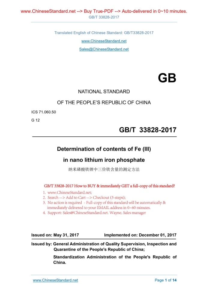 GB/T 33828-2017: Determination of contents of Fe (III) in nano lithium iron phosphate Delivery: 9 seconds. True-PDF full-copy in English & invoice will be downloaded + auto-delivered via email. See step-by-step procedure Status: Valid