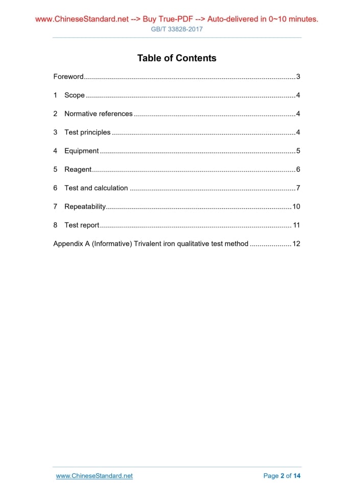 Similar standardsGB/T 33828-2017: Determination of contents of Fe (III) in nano lithium iron phosphate---This is an excerpt. Full copy of true-PDF in English version (including equations, symbols, images, flow-chart, tables, and figures etc.), auto-downloaded/delivered in 9 seconds, can be purchased online: https://www.ChineseStandard.net/PDF.aspx/GBT33828-2017GB NATIONAL STANDARD OF THE PEOPLE’S REPUBLIC OF CHINA ICS 71.060.50 G 12 Determination of contents of Fe (III) in nano lithium iron phosphate Issued on: MAY 31, 2017 Implemented on: DECEMBER 01, 2017 Issued by. General Administration of Quality Supervision, Inspection and Quarantine of the People's Republic of China; Standardization Administration of the People's Republic of China. 3. No action is required - Full-copy of this standard will be automatically & immediately delivered to your EMAIL address in 0~60 minutes. Table of ContentsForeword ... 3 1 Scope ... 4 2 Normative references ... 4 3 Test principles ... 4 4 Equipment ... 5 5 Reagent ... 6 6 Test and calculation ... 7 7 Repeatability ... 10 8 Test report ... 11 Appendix A (Informative) Trivalent iron qualitative test method ... 12ForewordThis standard was drafted in accordance with the rules given in GB/T 1.1-2009. This standard was proposed by the Chinese Academy of Sciences. This standard shall be under the jurisdiction of the National Nanotechnology Standardization Technical Committee of Nano Materials Subcommittee (SAC/TC 279 /SC 1). The drafting organizations of this standard. Shenzhen BTR New Energy Materials Co., Ltd., Hefei Guoxuan Hi-Tech Power Co., Ltd., Henan Kelong New Energy Co., Ltd., Shenzhen BTR Nami Technology Co., Ltd., Tianjin BTR New Energy Technology Co., Ltd., Metallurgical Industry Information Standards Institute. The main drafters of this standard. Huang Youyuan, Yue Min, Xu Xiaoming, Cheng Di, Dai Shifeng, Gao Yingquan, Xie Ailiang, Xu Yunjun, Li Xiaojun, Liu Xiuming, Chen Nanmin. Determination of contents of Fe (III) in nano lithium iron phosphate1 ScopeThis standard specifies the principle, equipment, reagents, procedures and test report contents for the method of determination of trivalent iron content in nano lithium iron phosphate. This standard is applicable to the determination of trivalent iron in nano lithium iron phosphate in the range of 0.2% ~ 5.0%.2 Normative referencesThe following documents are essential to the application of this document. For the dated documents, only the versions with the dates indicated are applicable to this document; for the undated documents, only the latest version (including all the amendments) are applicable to this Standard. GB/T 601-2002 Chemical reagent - Preparation of standard volumetric solutions GB/T 603 Chemical reagent - Preparation of reagent solutions for use in test methods GB/T 6682-2008 Water for analytical laboratory use - Specification and test methods3 Test principlesThe difference between the mass fraction of total iron and the mass fraction of ferrous iron in the sample is the mass fraction of trivalent iron content in the sample. First USE the hydrochloric acid to dissolve the sample to be tested to form a solution; respectively TAKE two sets of solution sample, 20.00 mL for each set. TAKE one set of sample solution; under the acidic condition (pH controlled at 1 ~ 2), USE the SnCl2 solution to reduce most of the Fe (III); ADD the CuSO4- isatin indicator; AND the solution changes from yellow to green; USE the TiCl3 solution to reduce the Fe (III) of the remaining part; the slightly excessive TiCl35 ReagentWARNING. Some of the reagents used in this test method are toxic or corrosive AND shall be handled with care! 5.1 General requirements Unless otherwise specified, it shall use the analytical reagents and level 3 water as specified in GB/T 6682-2008. AND all the reagents shall be prepared in accordance with the requirements of GB/T 603. 5.2 Hydrochloric acid The mass fraction is more than 36%. 5.3 Sulfuric acid The mass fraction is more than 98%. 5.4 Phosphoric acid The mass fraction is more than 85%. 5.5 Hydrochloric acid solution (1 + 1) MEASURE the equal volume of hydrochloric acid (5.2) and water; MIX it uniformly to prepare for use. 5.6 Sulfur phosphoric acid solution (15%) Slowly ADD 150 mL of sulfuric acid (5.3) into 500 mL of water while stirring; after cooling it down, ADD 150 mL of phosphoric acid (5.4); USE water to dilute it to 1000 mL; MIX it uniformly. 5.7 Tin dichloride solution WEIGH 5 g of tin chloride; DISSOLVE it in 10 mL of hydrochloric acid solution (5.5); USE water to dilute it to 100 mL; AND the solution shall be filtered if it is turbid. 5.8 Potassium dichromate standard titration solution [c(1/6 K2Cr2O7) = 0.0500 mol/L] PREPARE it in accordance with the method II in clause 4.5.2 of GB/T 601-2002. 5.9 Titanium trichloride solution heating device to heat it slightly boiling for 30 min; TAKE it off and quickly ADD approximately 1.0 g of sodium bicarbonate (5.16) and 30 mL of water; USE water bath to cool it quickly to room temperature. 6.1.2 PLACE the medium-speed filter paper in a 100.00 mL volumetric flask; USE water to rinse the volumetric flask for 3 ~ 4 times; RINSE the precipitate for 3 ~ 4 times; MAKE its volume reach to the mark; SHAKE it uniformly to prepare for use. 6.2 Determination of total iron content in sample solution 6.2.1 USE the single-line pipette (4.3) to accurately pipette 20.00 mL of the newly prepared sample solution (6.1.2) into a 250 mL conical flask; ADD 30 mL of water and 2 mL of hydrochloric acid (5.5); SHAKE it uniformly and PLACE it on the heating device to heat it to boil for 30 s; TAKE it off; immediately ADD tin dichloride solution (5.7) until the solution is pale yellow (if the solution itself is yellow but not apparent, it can skip this step); then ADD 2 drops of copper sulphate-isatin indicator (5.13) and the solution turns green; ADD titanium trichloride solution (5.9) until the green disappears; ADD one more drop; LET it sta