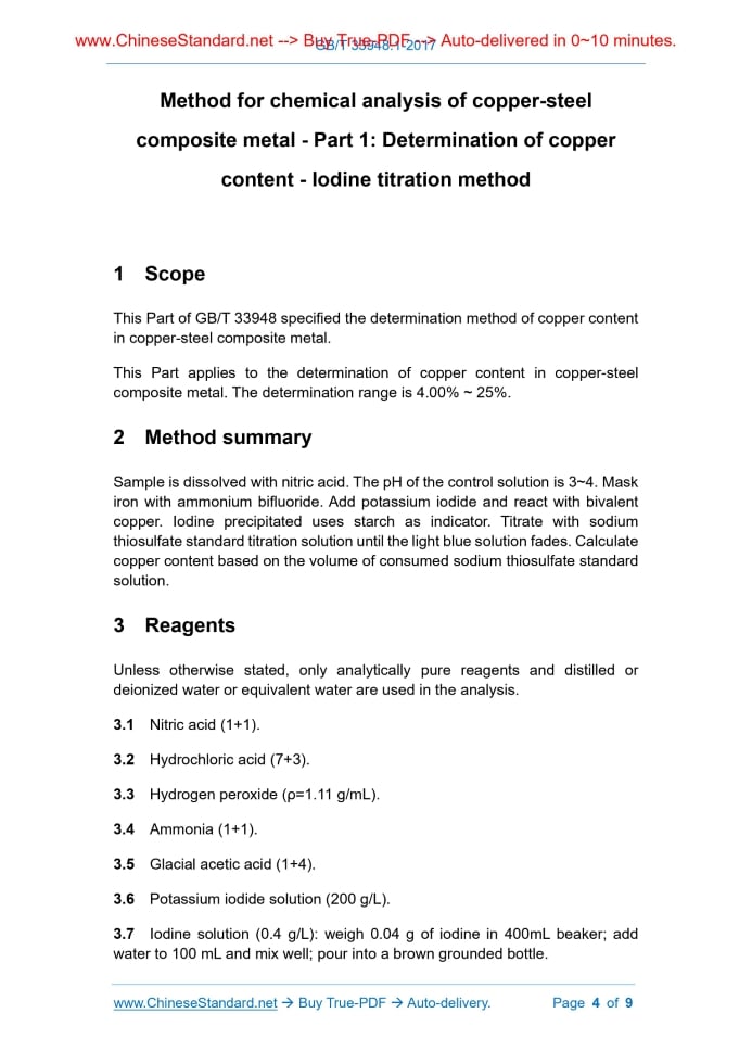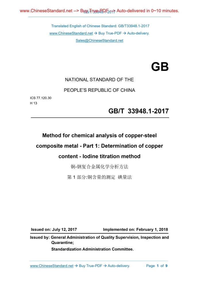 GB/T 33948.1-2017: Method for chemical analysis of copper-steel composite metal -- Part 1: Determination of copper content -- Iodine titration method Delivery: 9 seconds. True-PDF full-copy in English & invoice will be downloaded + auto-delivered via email. See step-by-step procedure Status: Valid