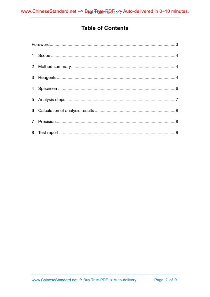 Similar standardsGB/T 33948.1-2017: Method for chemical analysis of copper-steel composite metal -- Part 1: Determination of copper content -- Iodine titration method---This is an excerpt. Full copy of true-PDF in English version (including equations, symbols, images, flow-chart, tables, and figures etc.), auto-downloaded/delivered in 9 seconds, can be purchased online: https://www.ChineseStandard.net/PDF.aspx/GBT33948.1-2017 GB NATIONAL STANDARD OF THE PEOPLE’S REPUBLIC OF CHINA ICS 77.120.30 H 13 Method for chemical analysis of copper-steel composite metal - Part 1. Determination of copper content - Iodine titration method Issued on: JULY 12, 2017 Implemented on: FEBRUARY 1, 2018 Issued by. General Administration of Quality Supervision, Inspection and Quarantine; Standardization Administration Committee. Table of ContentsForeword ... 3 1 Scope ... 4 2 Method summary ... 4 3 Reagents ... 4 4 Specimen ... 6 5 Analysis steps ... 7 6 Calculation of analysis results ... 8 7 Precision... 8 8 Test report ... 9 Method for chemical analysis of copper-steel composite metal - Part 1. Determination of copper content - Iodine titration method1 ScopeThis Part of GB/T 33948 specified the determination method of copper content in copper-steel composite metal. This Part applies to the determination of copper content in copper-steel composite metal. The determination range is 4.00% ~ 25%.2 Method summarySample is dissolved with nitric acid. The pH of the control solution is 3~4. Mask iron with ammonium bifluoride. Add potassium iodide and react with bivalent copper. Iodine precipitated uses starch as indicator. Titrate with sodium thiosulfate standard titration solution until the light blue solution fades. Calculate copper content based on the volume of consumed sodium thiosulfate standard solution.3 ReagentsUnless otherwise stated, only analytically pure reagents and distilled or deionized water or equivalent water are used in the analysis. 3.1 Nitric acid (1+1). 3.2 Hydrochloric acid (7+3). 3.3 Hydrogen peroxide (ρ=1.11 g/mL). 3.4 Ammonia (1+1). 3.5 Glacial acetic acid (1+4). 3.6 Potassium iodide solution (200 g/L). 3.7 Iodine solution (0.4 g/L). weigh 0.04 g of iodine in 400mL beaker; add water to 100 mL and mix well; pour into a brown grounded bottle.5 Analysis steps5.1 Test material Weigh 0.200 g of specimen (Clause 4), to the nearest of 0.0001 g. 5.2 Number of determinations Perform two determinations independently. Take the average value. 5.3 Blank test Perform the blank test with test materials. 5.4 Determination 5.4.1 Place the test material (5.1) in a 500-mL conical beaker. Add a small amount of water to wet. Add 10 mL of nitric acid (3.1). Cover the dish. Perform complete dissolution at low temperature (solution is transparent without impurities). If the test material is not completely dissolved, add 5 mL of hydrochloric acid (3.2). Add 3 mL of hydrogen peroxide (3.3) in 3 portions (shake for a moment for each adding) till the test material is completely dissolved (solution is transparent without impurities). Slowly concentrate the volume to 2 mL at low temperature. NOTE. Known substrates before dissolution contain manganese, chromium, silicon, nickel. The test material (5.1) can be placed in a 500 mL conical beaker. Add 5 mL of hydrochloric acid (3.2) at low temperature. Hydrogen peroxide is added dropwise in 5 portions (3.3), 2 mL for each (shake for a moment for each adding) till the test material is completely dissolved (solution is transparent without impurities). Add 10 mL of nitric acid (3.1). Cover the dish. Slowly concentrate volume to 2 mL at low temperature. 5.4.2 Remove for cooling. Wash dish and glass wall with water (up to 5 mL in volume). Boil. Remove for cooling to room temperature. Ammonia (3.4) is added dropwise until iron precipitation is complete (solution is viscous). Add ammonium bifluoride saturated solution (3.9) until red color disappears and it exceeds by 2 mL. Wash the watch glass and glass wall with water. Shake well. 5.4.3 Add 10 mL of potassium iodide solution (3.6). Shake well and dissolve. Immediately titrate with sodium thiosulfate standard titration solution (3.13). When the solution is light yellow, add 5 mL of starch solution (3.10). Continue titration with sodium thiosulfate standard titration solution (3.13) until the solution is light blue. Add 2 mL of potassium thiocyanate solution (3.11). Shake well to deepen blue. Continue titration with sodium thiosulfate standard titration solution (3.13) until the solution fades to blue. ......Source: Above contents are excerpted from the full-copy PDF -- translated/reviewed by: www.ChineseStandard.net / Wayne Zheng et al. Tips & Frequently Asked Questions:Question 1: How long will the true-PDF of English version of GB/T 33948.1-2017 be delivered?Answer: The full copy PDF of English version of GB/T 33948.1-2017 can be downloaded in 9 seconds, and it will also be emailed to you in 9 seconds (double mechanisms to ensure the delivery reliably), with PDF-invoice.Question 2: Can I share the purchased PDF of GB/T 33948.1-2017_English with my colleagues?Answer: Yes. The purchased PDF of GB/T 33948.1-2017_English will be deemed to be sold to your employer/organization who actually paid for it, including your colleagues and your employer's intranet.Question 3: Does the price include tax/VAT?Answer: Yes. Our tax invoice, downloaded/delivered in 9 seconds, includes all tax/VAT and complies with 100+ countries' tax regulations (tax exempted in 100+ countries) -- See Avoidance of Double Taxation Agreements (DTAs): List of DTAs signed between Singapore and 100+ countriesQuestion 4: Do you accept my currency other than USD?Answer: Yes. www.ChineseStandard.us -- GB/T 33948.1-2017 -- Click this link and select your country/currency to pay, the exact amount in your currency will be printed on the invoice. Full PDF will also be downloaded/emailed in 9 seconds.How to buy and download a true PDF of English version of GB/T 33948.1-20