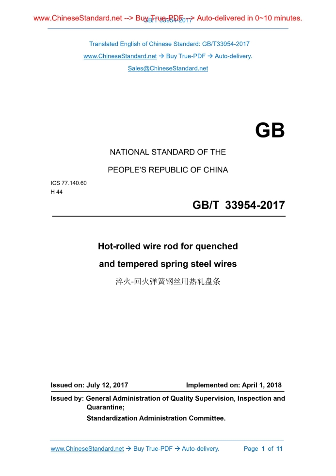 GB/T 33954-2017: Hot-rolled wire rod for quenched and tempered spring steel wires Delivery: 9 seconds. True-PDF full-copy in English & invoice will be downloaded + auto-delivered via email. See step-by-step procedure Status: Valid
