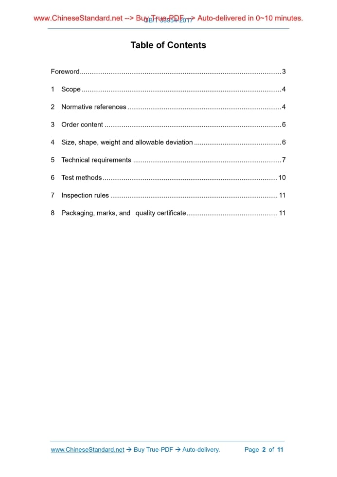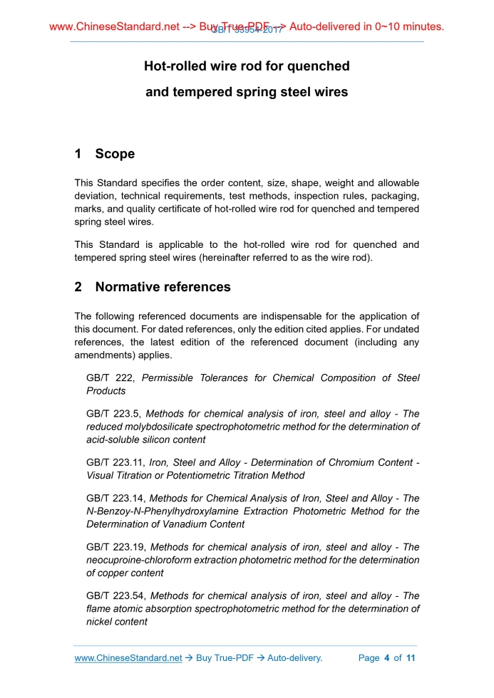 Similar standardsGB/T 33954-2017: Hot-rolled wire rod for quenched and tempered spring steel wires---This is an excerpt. Full copy of true-PDF in English version (including equations, symbols, images, flow-chart, tables, and figures etc.), auto-downloaded/delivered in 9 seconds, can be purchased online: https://www.ChineseStandard.net/PDF.aspx/GBT33954-2017GB NATIONAL STANDARD OF THE PEOPLE’S REPUBLIC OF CHINA ICS 77.140.60 H 44 Hot-rolled wire rod for quenched and tempered spring steel wires Issued on: JULY 12, 2017 Implemented on: APRIL 1, 2018 Issued by. General Administration of Quality Supervision, Inspection and Quarantine; Standardization Administration Committee. Table of ContentsForeword ... 3 1 Scope ... 4 2 Normative references ... 4 3 Order content ... 6 4 Size, shape, weight and allowable deviation ... 6 5 Technical requirements ... 7 6 Test methods ... 10 7 Inspection rules ... 11 8 Packaging, marks, and quality certificate ... 11 Hot-rolled wire rod for quenched and tempered spring steel wires1 ScopeThis Standard specifies the order content, size, shape, weight and allowable deviation, technical requirements, test methods, inspection rules, packaging, marks, and quality certificate of hot-rolled wire rod for quenched and tempered spring steel wires. This Standard is applicable to the hot-rolled wire rod for quenched and tempered spring steel wires (hereinafter referred to as the wire rod).2 Normative referencesThe following referenced documents are indispensable for the application of this document. For dated references, only the edition cited applies. For undated references, the latest edition of the referenced document (including any amendments) applies. GB/T 222, Permissible Tolerances for Chemical Composition of Steel Products GB/T 223.5, Methods for chemical analysis of iron, steel and alloy - The reduced molybdosilicate spectrophotometric method for the determination of acid-soluble silicon content GB/T 223.11, Iron, Steel and Alloy - Determination of Chromium Content - Visual Titration or Potentiometric Titration Method GB/T 223.14, Methods for Chemical Analysis of Iron, Steel and Alloy - The N-Benzoy-N-Phenylhydroxylamine Extraction Photometric Method for the Determination of Vanadium Content GB/T 223.19, Methods for chemical analysis of iron, steel and alloy - The neocuproine-chloroform extraction photometric method for the determination of copper content GB/T 223.54, Methods for chemical analysis of iron, steel and alloy - The flame atomic absorption spectrophotometric method for the determination of nickel content GB/T 223.60, Methods for chemical analysis of iron, steel and alloy - The perchloric acid dehydration gravimetric method for the determination of silicon content GB/T 223.62, Methods for chemical analysis of iron, steel and alloy - The butyl acetate extraction photometric method for the determination of phosphorus content GB/T 223.63, Methods for chemical analysis of iron, steel and alloy - The sodium (potassium) periodate photometric method for the determination of manganese content GB/T 223.64, Iron, Steel and Alloy - Determination of Manganese Content - Flame Atomic Absorption Spectrometric Method GB/T 223.72, Iron, Steel and Alloy - Determination of Sulfur Content - Gravimetric Method GB/T 224, Determination of depth of decarburization of steel GB/T 226, Classification and codes of basic personal information GB/T 228.1, Metallic materials - Tensile testing - Method of test at ambient temperature GB/T 1979, STANDARD diagrams for macrostructure and defect of structural steels GB/T 2101, General requirements of acceptance, packaging, marking and certification for section steel GB/T 2975, Steel and Steel Products - Location and Preparation of Test Pieces for Mechanical Testing GB/T 4336, Carbon and low-alloy steel - Determination of multi-element contents - Spark discharge atomic emission spectrometric method (routine method) GB/T 6394, Metal - Methods for estimating the average grain size GB/T 8170, Rules of rounding off for numerical values & expression and judgement of limiting values GB/T 10561, Steel - Determination of Content of Nonmetallic Inclusions - Micrographic Method Using Standards Diagrams GB/T 11261, Steel and Iron-Determination of oxygen content - The pulse heating inert gas fusion-infra-red absorption method7 Inspection rules7.1 Inspection and acceptance The inspection and acceptance of the wire rod shall be performed by the quality and technical supervision department of the supplier. When necessary, the purchaser has the right to conduct inspection and acceptance in accordance with the provisions of this Standard. 7.2 Batching rules The wire rod shall be accepted in batches. Each batch shall consist of the wire rod of the same furnace number, the same designation, the same specification. 7.3 Re-inspection The re-inspection and determination rules of the wire rod shall be performed according to GB/T 2101. 7.4 Numerical rounding The inspection and inspection data of the wire rod shall be rounded off by comparison method of rounding off values. The rounding off rules shall be in accordance with GB/T 8170. 8 Packaging, marks, and quality certificate 8.1 The packaging, marks, and quality certificate of the wire rod shall comply with GB/T 2101. 8.2 Negotiated with the supplier and the purchaser, and indicated in the contract, it may also adopt other particular packaging, protective requirements. ......Source: Above contents are excerpted from the full-copy PDF -- translated/reviewed by: www.ChineseStandard.net / Wayne Zheng et al. Tips & Frequently Asked Questions:Question 1: How long will the true-PDF of English version of GB/T 33954-2017 be delivered?Answer: The full copy PDF of English version of GB/T 33954-2017 can be downloaded in 9 seconds, and it will also be emailed to you in 9 seconds (double mechanisms to ensure the delivery reliably), with PDF-invoice.Question 2: Can I share the purchased PDF of GB/T 33954-2017_English with my