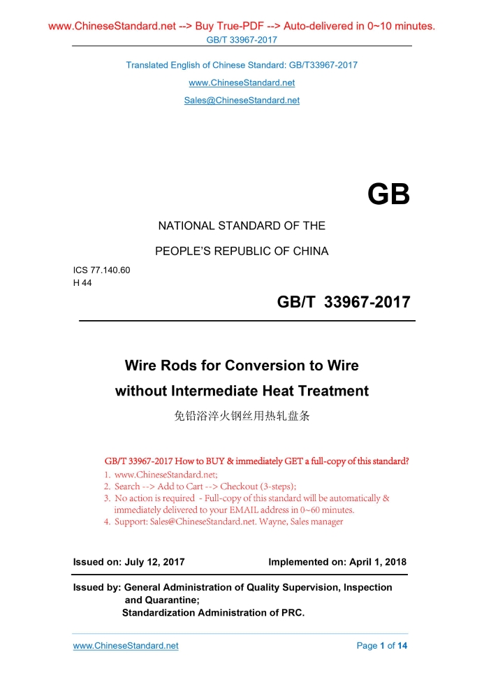 GB/T 33967-2017: Wire Rods for Conversion to Wire without Intermediate Heat Treatment Delivery: 9 seconds. True-PDF full-copy in English & invoice will be downloaded + auto-delivered via email. See step-by-step procedure Status: Valid