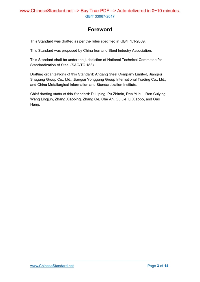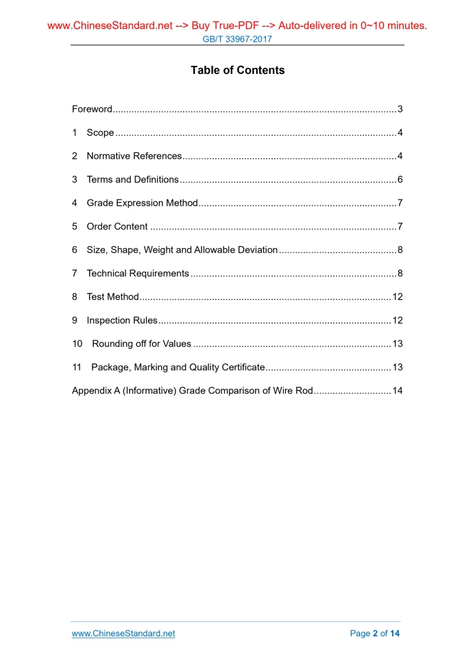 Similar standardsGB/T 33967-2017: Wire Rods for Conversion to Wire without Intermediate Heat Treatment---This is an excerpt. Full copy of true-PDF in English version (including equations, symbols, images, flow-chart, tables, and figures etc.), auto-downloaded/delivered in 9 seconds, can be purchased online: https://www.ChineseStandard.net/PDF.aspx/GBT33967-2017GB NATIONAL STANDARD OF THE PEOPLE’S REPUBLIC OF CHINA ICS 77.140.60 H 44 Wire Rods for Conversion to Wire without Intermediate Heat Treatment Issued on: JULY 12, 2017 Implemented on: APRIL 1, 2018 Issued by. General Administration of Quality Supervision, Inspection and Quarantine; Standardization Administration of PRC. 3. No action is required - Full-copy of this standard will be automatically & immediately delivered to your EMAIL address in 0~60 minutes. Table of ContentsForeword ... 3 1 Scope ... 4 2 Normative References ... 4 3 Terms and Definitions ... 6 4 Grade Expression Method ... 7 5 Order Content ... 7 6 Size, Shape, Weight and Allowable Deviation ... 8 7 Technical Requirements ... 8 8 Test Method ... 12 9 Inspection Rules ... 12 10 Rounding off for Values ... 13 11 Package, Marking and Quality Certificate ... 13 Appendix A (Informative) Grade Comparison of Wire Rod ... 14ForewordThis Standard was drafted as per the rules specified in GB/T 1.1-2009. This Standard was proposed by China Iron and Steel Industry Association. This Standard shall be under the jurisdiction of National Technical Committee for Standardization of Steel (SAC/TC 183). Drafting organizations of this Standard. Angang Steel Company Limited, Jiangsu Shagang Group Co., Ltd., Jiangsu Yonggang Group International Trading Co., Ltd., and China Metallurgical Information and Standardization Institute. Chief drafting staffs of this Standard. Di Liping, Pu Zhimin, Ren Yuhui, Ren Cuiying, Wang Lingjun, Zhang Xiaobing, Zhang Ge, Che An, Gu Jie, Li Xiaobo, and Gao Hang. Wire Rods for Conversion to Wire without Intermediate Heat Treatment1 ScopeThis Standard specifies the terms and definitions, grade expression method, ordering content, dimension, shape, weight and allowable deviation, technical requirements, test methods, inspection rules, package, marking and quality certificate of wire rods for conversion to wire without intermediate heat treatment. This Standard is applicable to the hot-rolled wire rod for wire-making without intermediate heat treatment or final heat treatment during the wire-making process; namely, wire rods for conversion to wire without intermediate heat treatment (hereinafter referred to as wire rod).2 Normative ReferencesThe following documents are essential to the application of this document. For the dated documents, only the versions with the dates indicated are applicable to this document; for the undated documents, only the latest version (including all the amendments) are applicable to this document. GB/T 222 Method of Sampling Steel for Determination of Chemical Composition and Permissible Variation for Product Analysis GB/T 223.5 Methods for Chemical Analysis of Iron, Steel and Alloy - the Reduced Molybdosilicate Spectrophotometric Method for the Determination of Acid-Soluble Silicon Content GB/T 223.12 Methods for Chemical Analysis of Iron, Steel and Alloy - The Sodium Carbonate Separation-Diphenyl Carbazide Photometric Method for the Determination of Chromium Content GB/T 223.19 Methods for Chemical Analysis of Iron, Steel and Alloy - The Neocuproine-Chloroform Extraction Photometric Method for the Determination of Copper Content GB/T 223.23 Methods for Chemical Analysis of Iron, Steel and Alloy - The Dimethylglyoxime Spectrophotometric Method for the Determination of Nickel Content GB/T 223.26 Iron, Steel and Alloy - Determination of Molybdenum Content - The Thiocyanate Spectrophotometric Method GB/T 223.37 Methods for Chemical Analysis of Iron, Steel and Alloy - the Indophenol Blue Photometric Method for the Determination of Nitrogen Content after Distillation Separation GB/T 223.59 Iron, Steel and Alloy - Determination of Phosphorus Content - Bismuth Phosphomolybdate Blue Spectrophotometric Method and Antimony Phosphomolybdate Blue Spectrophotometric Method GB/T 223.62 Methods for Chemical Analysis of Iron, Steel and Alloy - The Butyl Acetate Extraction Photometric Method for the Determination of Phosphorus Content GB/T 223.63 Methods for Chemical Analysis of Iron, Steel and Alloy – The Sodium (Potassium) Periodate Photometric Method for the Determination of Manganese Content GB/T 223.67 Iron, Steel and Alloy - Determination of Sulfur Content - Methylene Blue Spectrophotometric Method GB/T 223.69 Iron, Steel and Alloy - Determination of Carbon Contents - Gas- volumetric Method after Combustion in the Pipe Furnace GB/T 223.72 Iron, Steel and Alloy - Determination of Sulfur Content - Gravimetric Method GB/T 224 Determination of Depth of Decarburization of Steels GB/T 228.1 Metallic Materials - Tensile Testing - Part 1. Method of Test at Room Temperature GB/T 2101 Generel Provisions on Acceptance, Package, Marking and Quality Certificate for Profile Steel GB/T 2975 Steel and Steel Products - Location and Preparation of Test Pieces for Mechanical Testing GB/T 4336 Carbon and Low-Alloy Steel - Determination of Multi-Element Contents -Spark Discharge Atomic Emission Spectrometric Method (Routine Method) GB/T 6394 Metal - Methods for Estimating the Average Grain Size GB/T 8170 Rules of Rounding off for Numerical Values & Expression and Judgement of Limiting Values GB/T 10561 Steel - Determination of Content of Nonmetallic Inclusions - Micrographic Method Using Standards Diagrams GB/T 13298 Metal - Inspection Method of Microstructure GB/T 14981-2009 Dimension Shape Mass and Tolerance for Hot-Rolled Round Wire Rod GB/T 17505 Steel and Steel Products - General Technical Delivery Requirements GB/T 20066 Steel and Iron-Sampling and Preparation of Samples for the Determination of Chemical Composition GB/T 24242.1-2009 Non-Alloy Steel Wir