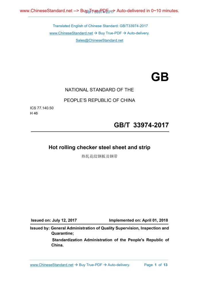 GB/T 33974-2017: Hot rolling checker steel sheet and strip Delivery: 9 seconds. True-PDF full-copy in English & invoice will be downloaded + auto-delivered via email. See step-by-step procedure Status: Valid