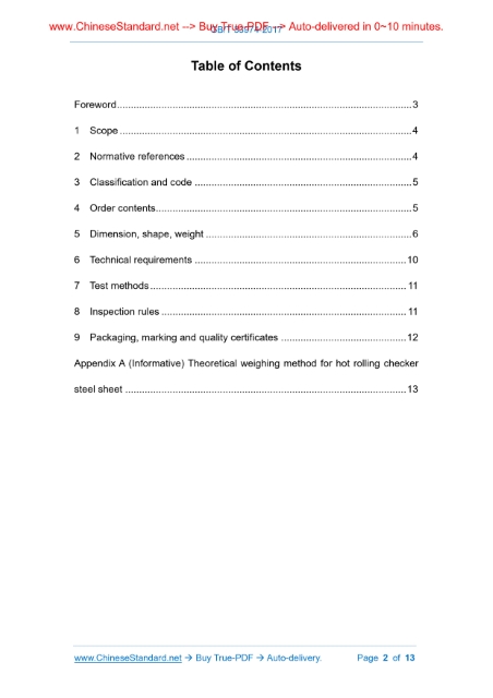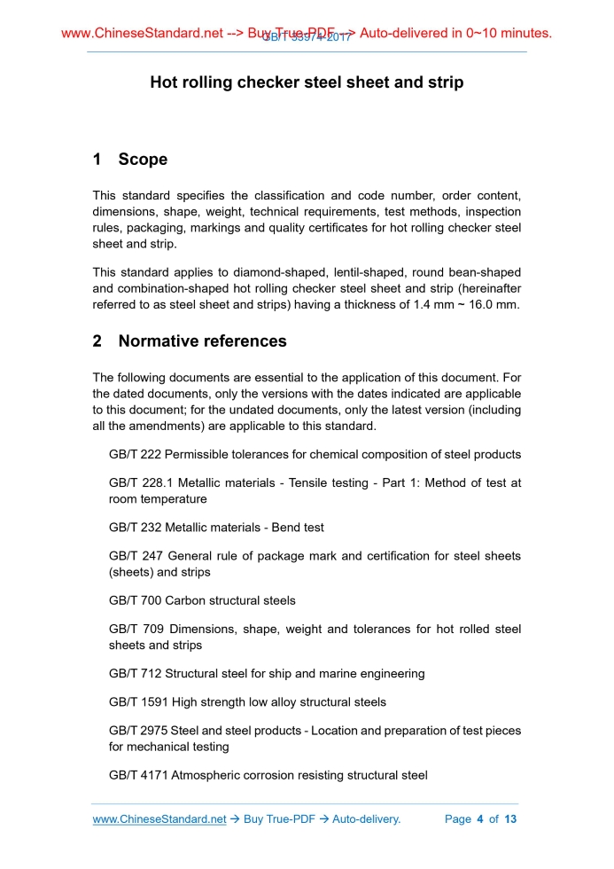 Similar standardsGB/T 33974-2017: Hot rolling checker steel sheet and strip---This is an excerpt. Full copy of true-PDF in English version (including equations, symbols, images, flow-chart, tables, and figures etc.), auto-downloaded/delivered in 9 seconds, can be purchased online: https://www.ChineseStandard.net/PDF.aspx/GBT33974-2017GB NATIONAL STANDARD OF THE PEOPLE’S REPUBLIC OF CHINA ICS 77.140.50 H 46 Hot rolling checker steel sheet and strip Issued on: JULY 12, 2017 Implemented on: APRIL 01, 2018 Issued by. General Administration of Quality Supervision, Inspection and Quarantine; Standardization Administration of the People's Republic of China. Table of ContentsForeword ... 3 1 Scope ... 4 2 Normative references ... 4 3 Classification and code ... 5 4 Order contents ... 5 5 Dimension, shape, weight ... 6 6 Technical requirements ... 10 7 Test methods ... 11 8 Inspection rules ... 11 9 Packaging, marking and quality certificates ... 12 Appendix A (Informative) Theoretical weighing method for hot rolling checker steel sheet ... 13 Hot rolling checker steel sheet and strip1 ScopeThis standard specifies the classification and code number, order content, dimensions, shape, weight, technical requirements, test methods, inspection rules, packaging, markings and quality certificates for hot rolling checker steel sheet and strip. This standard applies to diamond-shaped, lentil-shaped, round bean-shaped and combination-shaped hot rolling checker steel sheet and strip (hereinafter referred to as steel sheet and strips) having a thickness of 1.4 mm ~ 16.0 mm.2 Normative referencesThe following documents are essential to the application of this document. For the dated documents, only the versions with the dates indicated are applicable to this document; for the undated documents, only the latest version (including all the amendments) are applicable to this standard. GB/T 222 Permissible tolerances for chemical composition of steel products GB/T 228.1 Metallic materials - Tensile testing - Part 1. Method of test at room temperature GB/T 232 Metallic materials - Bend test GB/T 247 General rule of package mark and certification for steel sheets (sheets) and strips GB/T 700 Carbon structural steels GB/T 709 Dimensions, shape, weight and tolerances for hot rolled steel sheets and strips GB/T 712 Structural steel for ship and marine engineering GB/T 1591 High strength low alloy structural steels GB/T 2975 Steel and steel products - Location and preparation of test pieces for mechanical testing GB/T 4171 Atmospheric corrosion resisting structural steel GB/T 8170 Rules of rounding off for numerical values & expression and judgement of limiting values GB/T 17505 Steel and steel products General technical delivery requirements GB/T 20066 Steel and iron - Sampling and preparation of samples for the determination of chemical composition3 Classification and code3.1 Classification by edge status is as follows. a) Trimming, EC; b) Not trimming, EM. 3.2 Classification by shape of the pattern is as follows. a) Diamond, LX; b) Lentil-shape, BD; c) Round bean shape, YD; d) Combined shape, ZH.4 Order contents4.1 Contracts or orders placed under this standard shall include the following. a) This standard number; b) Grade; c) Product category (steel sheet or strip); d) Specifications; e) Pattern shape; f) Edge status; g) Other requirements. 4.2 Marking example The untrimmed lentil-shaped pattern steel sheet which is delivered in Table 3 -- Steel sheet flatness, in millimeters Thickness Flatness, not more than Measured length 1.4 ~ 2.5 15 1000 > 2.5 ~ 4.0 12 > 4.0 ~ 16.0 10 5.5 Other sizes and shapes of steel sheets and strips are to comply with the requirements of GB/T 709. 5.6 Steel sheets and strips are delivered by actual weight. In accordance with the requirements of the purchaser, the steel sheet can refer to Appendix A and be delivered by theoretical weight.6 Technical requirements6.1 Grades and chemical composition 6.1.1 The steel grade and chemical composition (smelting analysis) shall comply with the provisions of GB/T 700, GB/T 712, GB/T 1591, and GB/T 4171. With the agreement of the supplier and purchaser, it can supply other grades of steel sheets and strips. 6.1.2 The allowable deviation of the chemical composition of finished steel sheets and strips shall comply with the provisions of GB/T 222. 6.2 Delivery status 6.2.1 Steel sheets and strips are delivered in hot rolling condition. 6.2.2 Steel sheets and strips are usually supplied in an untrimmed state, or otherwise supplied in a trimmed state as specified by the purchaser and specified in the contract. 6.3 Mechanical properties According to the requirements of the purchaser, and specified in the contract, tensile and bending tests can be performed. The performance indicators shall meet the requirements of GB/T 700, GB/T 712, GB/T 1591, and GB/T 4171 or the agreement between the both parties. 6.4 Surface quality 6.4.1 The surface of steel sheets and strips shall be free of bubbles, scars, cracks, folds, and inclusions. There shall be no delamination of steel sheets and strips. 6.4.2 The surface of steel sheets and strips is allowed to have a thin layer of ......Source: Above contents are excerpted from the full-copy PDF -- translated/reviewed by: www.ChineseStandard.net / Wayne Zheng et al. Tips & Frequently Asked Questions:Question 1: How long will the true-PDF of English version of GB/T 33974-2017 be delivered?Answer: The full copy PDF of English version of GB/T 33974-2017 can be downloaded in 9 seconds, and it will also be emailed to you in 9 seconds (double mechanisms to ensure the delivery reliably), with PDF-invoice.Question 2: Can I share the purchased PDF of GB/T 33974-2017_English with my colleagues?Answer: Yes. The purchased PDF of GB/T 33974-2017_English will be deemed to be sold to your employer/organization who actually paid for it, including your colleagues and your employer's intranet.Question 3: Does the price include tax/VAT?Answer