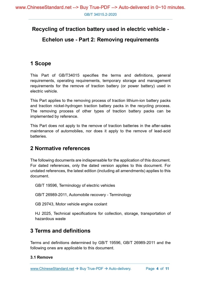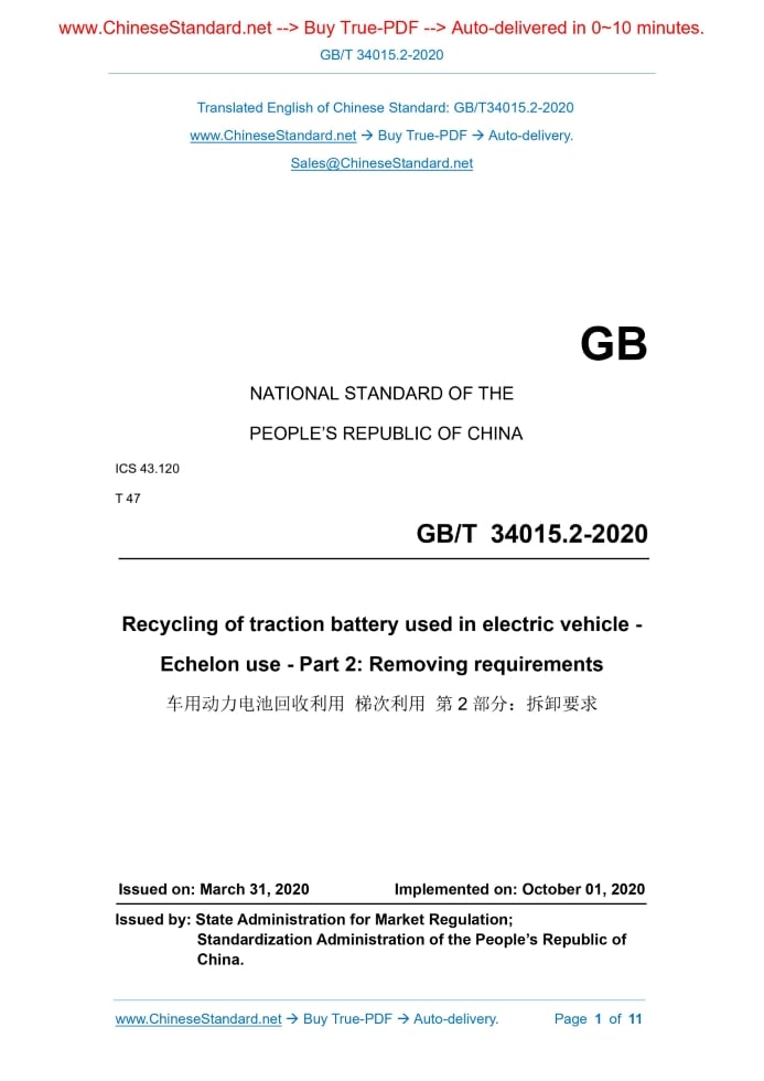 Similar standardsGB/T 34015.2-2020: Recycling of traction battery used in electric vehicle - Echelon use - Part 2: Removing requirements---This is an excerpt. Full copy of true-PDF in English version (including equations, symbols, images, flow-chart, tables, and figures etc.), auto-downloaded/delivered in 9 seconds, can be purchased online: https://www.ChineseStandard.net/PDF.aspx/GBT34015.2-2020 GB NATIONAL STANDARD OF THE PEOPLE’S REPUBLIC OF CHINA ICS 43.120 T 47 Recycling of traction battery used in electric vehicle - Echelon use - Part 2.Removing requirements Issued on. MARCH 31, 2020 Implemented on. OCTOBER 01, 2020 Issued by. State Administration for Market Regulation; Standardization Administration of the People’s Republic of China. Table of ContentsForeword... 3 1 Scope... 4 2 Normative references... 4 3 Terms and definitions... 4 4 General requirements... 5 5 Operation requirements... 6 6 Temporary storage and management... 8 Appendix A (Normative) Test items before removing of traction battery... 10ForewordGB/T 34015 "Recycling of traction battery used in electric vehicle" is divided into 6 parts. -- Part 1.Test of residual capacity; -- Part 2.Removing requirements; -- Part 3.Echelon use requirements; -- Part 4.Echelon use product identification; -- Part 5.Design guide for echelon use; -- Part 6.Specification for remaining life assessment. This Part is Part 2 of GB/T 34015. This Part was drafted in accordance with the rules given in GB/T 1.1-2009. This Part was proposed by the Ministry of Industry and Information Technology of the People's Republic of China. This Part shall be under the jurisdiction of National Technical Committee of Auto Standardization (SAC/TC 114). The drafting organizations of this Part. Guangdong Brunp Recycling Technology Limited, Contemporary Amperex Technology Co. Limited, China Automotive Technology and Research Center Co., Ltd., Benewable Resources of Technology Co., Ltd., GEM Co., Ltd., Zhejiang Chilwee Chuangyuan Industry Co., Ltd., Zhangjiagang Tsingyan Reman Industry Institute Co., Ltd., Shenzhen OptimumNano Energy Co., Ltd., Hefei Gotion High-tech Power Energy Co., Ltd., Ganzhou Haopeng Technology Co., Ltd., Beijing Saidemei Resources Reuse Research Institute Co., Ltd., Guangzhou Zhongwu High-tech Co., Ltd., Shandong Lixiang New Energy Technology Co., Ltd., Hunan Bangpu Automobile Recycling Co., Ltd., Zhejiang Tianneng New Material Co., Ltd. The drafters of this Part. Yu Haijun, Zhao Zhongsong, Zhang Tongzhu, Bi Yuhui, Kong Zhiming, Xie Yinghao, Wei Yuyu, Dong Jincong, He Youqi, Yang Xulai, Ou Hancheng, Zhao Xiaoyong, Ren Shan, Wu Fan, Wei Shaofu, Li Jing, Tang Jianxiao, Guo Jie, Ma Zhiju, Li Jian, Wu Guanjun, Chen Hanquan, Zhen Aigang, Ni Erfu, Liu Dong, Meng Xiao. Recycling of traction battery used in electric vehicle - Echelon use - Part 2.Removing requirements1 ScopeThis Part of GB/T34015 specifies the terms and definitions, general requirements, operating requirements, temporary storage and management requirements for the remove of traction battery (or power battery) used in electric vehicle. This Part applies to the removing process of traction lithium-ion battery packs and traction nickel-hydrogen traction battery packs in the recycling process. The removing process of other types of traction battery packs can be implemented by reference. This Part does not apply to the remove of traction batteries in the after-sales maintenance of automobiles, nor does it apply to the remove of lead-acid batteries.2 Normative referencesThe following documents are indispensable for the application of this document. For dated references, only the dated version applies to this document. For undated references, the latest edition (including all amendments) applies to this document. GB/T 19596, Terminology of electric vehicles GB/T 26989-2011, Automobile recovery - Terminology GB 29743, Motor vehicle engine coolant HJ 2025, Technical specifications for collection, storage, transportation of hazardous waste3 Terms and definitionsTerms and definitions determined by GB/T 19596, GB/T 26989-2011 and the following ones are applicable to this document. 3.1 Remove The operation of separating and removing the traction battery pack from the electric vehicle.4 General requirements4.1 General requirements 4.1.1 The technical support and removing guidance documents that are provided by the vehicle manufacturer shall be used to formulate removing instructions and emergency plans for safety and environmental accidents. 4.1.4 The removing enterprise shall not continue to remove the retired traction batteries that are obtained from the remove, and shall submit it to a new energy vehicle traction battery recycling and processing enterprise that meets the national regulations within the prescribed time limit according to the prescribed procedures. 4.2 Site requirements 4.2.1 The ground of the remove and storage site shall be hardened and leak- proof, rainproof, ventilated, well-lit, and with complete fire-fighting safety facilities; the safety distance shall comply with relevant national management regulations. 4.3 Equipment and facility requirements 4.3.1 It shall be equipped with extraction systems and special collection containers for oils such as traction battery coolant and fuel oil. 4.3.5 It shall be equipped with traction battery safety assessment equipment, such as leakage diagnostic testing equipment, non-contact remote infrared temperature detector, electroscope, discharge rod, special labels and signs. 4.3.6 It shall be equipped with fire-fighting facilities, such as fire hydrants, sandboxes, and fire extinguishers, that are required by the state. 4.3.7 It should be equipped with tools and equipment such as weighing, manipulators, adjustable clamping arms, storage and packing containers. 4.4 Personnel requirements 4.4.1 During the removing process, at least two persons shall operate at the same time; the operator shall hold an electrician certificate. 4.4.2 The r