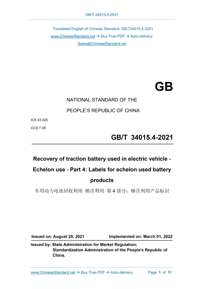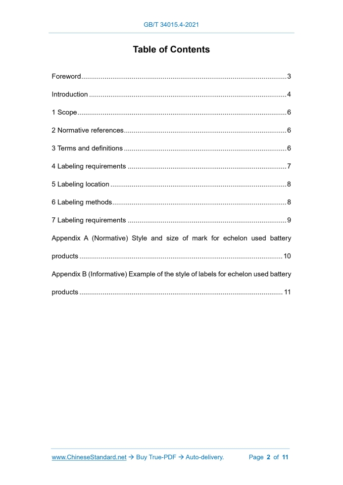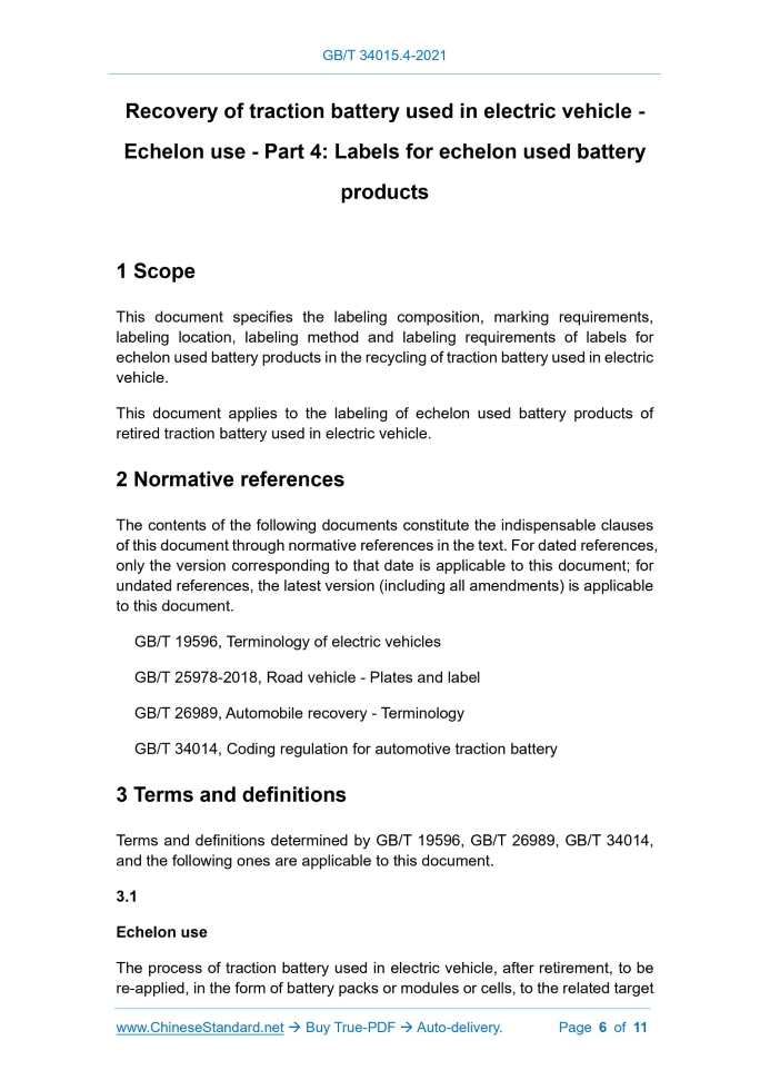Similar standardsGB/T 34015.4-2021: Recovery of traction battery used in electric vehicle - Echelon use - Part 4: Labels for echelon used battery products---This is an excerpt. Full copy of true-PDF in English version (including equations, symbols, images, flow-chart, tables, and figures etc.), auto-downloaded/delivered in 9 seconds, can be purchased online: https://www.ChineseStandard.net/PDF.aspx/GBT34015.4-2021 GB NATIONAL STANDARD OF THE PEOPLE’S REPUBLIC OF CHINA ICS 43.020 CCS T 08 Recovery of traction battery used in electric vehicle - Echelon use - Part 4: Labels for echelon used battery products ISSUED ON: AUGUST 20, 2021 IMPLEMENTED ON: MARCH 01, 2022 Issued by: State Administration for Market Regulation; Standardization Administration of the People’s Republic of China. Table of ContentsForeword ... 3 Introduction ... 4 1 Scope ... 6 2 Normative references ... 6 3 Terms and definitions ... 6 4 Labeling requirements ... 7 5 Labeling location ... 8 6 Labeling methods ... 8 7 Labeling requirements ... 9 Appendix A (Normative) Style and size of mark for echelon used battery products ... 10 Appendix B (Informative) Example of the style of labels for echelon used battery products ... 11 Recovery of traction battery used in electric vehicle - Echelon use - Part 4: Labels for echelon used battery products1 ScopeThis document specifies the labeling composition, marking requirements, labeling location, labeling method and labeling requirements of labels for echelon used battery products in the recycling of traction battery used in electric vehicle. This document applies to the labeling of echelon used battery products of retired traction battery used in electric vehicle.2 Normative referencesThe contents of the following documents constitute the indispensable clauses of this document through normative references in the text. For dated references, only the version corresponding to that date is applicable to this document; for undated references, the latest version (including all amendments) is applicable to this document. GB/T 19596, Terminology of electric vehicles GB/T 25978-2018, Road vehicle - Plates and label GB/T 26989, Automobile recovery - Terminology GB/T 34014, Coding regulation for automotive traction battery3 Terms and definitionsTerms and definitions determined by GB/T 19596, GB/T 26989, GB/T 34014, and the following ones are applicable to this document. 3.1 Echelon use The process of traction battery used in electric vehicle, after retirement, to be re-applied, in the form of battery packs or modules or cells, to the related target 4.2.1 General requirements The mark for echelon used battery products shall be clear and easy to identify. 4.2.2 Marking style The mark for echelon used battery products is composed of an equilateral triangle recycling symbol and a battery mark. The style of the mark shall meet the requirements of Appendix A. 4.2.3 Marking size The marking size shall comply with the provisions of Appendix A; the size can be adjusted according to the size of the echelon used battery product; the height of the entire mark shall not be less than 5 mm. If it is necessary to reduce or enlarge the mark, it shall be reduced or enlarged in the same proportion.5 Labeling location5.1 Echelon used battery products shall be labeled with the label for echelon used battery products on the easy-to-read part of the product surface and visible positions on the product outer packaging, instruction manual and advertising materials. 5.2 For products that cannot be labeled on the outer surface of the product due to product size or structure, etc., only label the mark for echelon used battery products and the code of echelon used battery products. 5.3 If it is not possible to mark the mark on the obvious part due to the influence of the product function, appearance design, etc., it shall be explained in the product technical document that is published by the enterprise.6 Labeling methods6.1 The labels on the outer packaging, operation instruction and advertising materials of the product shall be marked by printing, spraying, or pasting labels. 6.2 For the label on the outer surface of the echelon used battery product, one of the following methods shall be selected for labeling: a) Directly engrave on structural parts that are not easy to remove or replace; it can be engraved in concave or embossed manner; b) Print on the label, which shall be permanently fixed on the structural part of the component that is not easy to remove or replace; the label shall comply with the provisions of 4.1 and 4.2 in GB/T 25978-2018; ......Source: Above contents are excerpted from the full-copy PDF -- translated/reviewed by: www.ChineseStandard.net / Wayne Zheng et al. Tips & Frequently Asked Questions:Question 1: How long will the true-PDF of English version of GB/T 34015.4-2021 be delivered?Answer: The full copy PDF of English version of GB/T 34015.4-2021 can be downloaded in 9 seconds, and it will also be emailed to you in 9 seconds (double mechanisms to ensure the delivery reliably), with PDF-invoice.Question 2: Can I share the purchased PDF of GB/T 34015.4-2021_English with my colleagues?Answer: Yes. The purchased PDF of GB/T 34015.4-2021_English will be deemed to be sold to your employer/organization who actually paid for it, including your colleagues and your employer's intranet.Question 3: Does the price include tax/VAT?Answer: Yes. Our tax invoice, downloaded/delivered in 9 seconds, includes all tax/VAT and complies with 100+ countries' tax regulations (tax exempted in 100+ countries) -- See Avoidance of Double Taxation Agreements (DTAs): List of DTAs signed between Singapore and 100+ countriesQuestion 4: Do you accept my currency other than USD?Answer: Yes. www.ChineseStandard.us -- GB/T 34015.4-2021 -- Click this link and select your country/currency to pay, the exact amount in your currency will be printed on the invoice. Full PDF will also be downloaded/emailed in 9 seconds.How to buy and