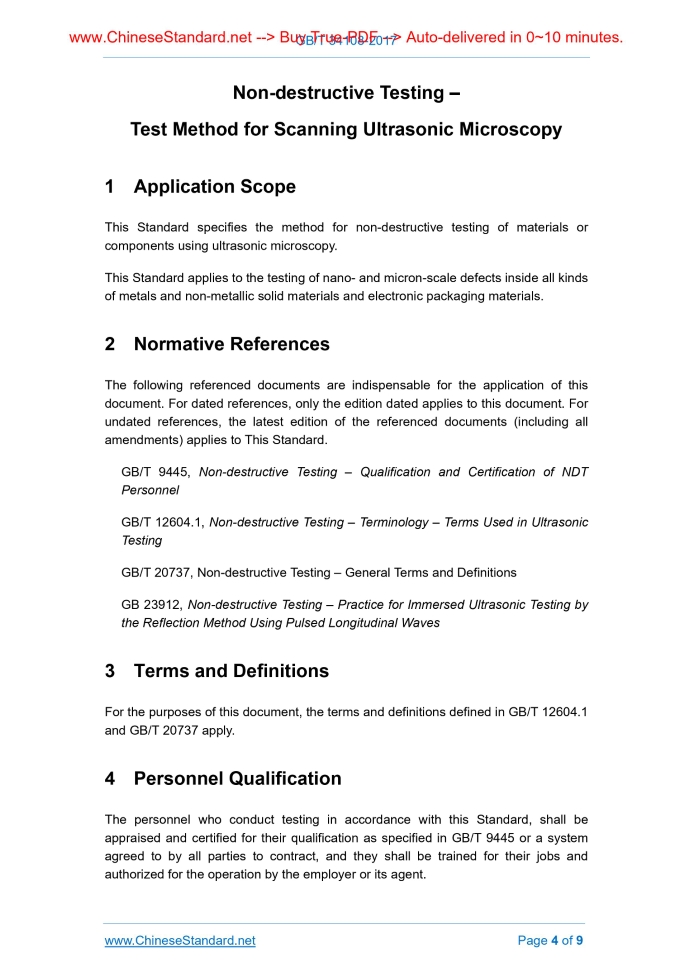Similar standardsGB/T 34018-2017: Non-destructive testing -- Test method for scanning ultrasonic microscopy---This is an excerpt. Full copy of true-PDF in English version (including equations, symbols, images, flow-chart, tables, and figures etc.), auto-downloaded/delivered in 9 seconds, can be purchased online: https://www.ChineseStandard.net/PDF.aspx/GBT34018-2017GB NATIONAL STANDARD OF THE PEOPLE’S REPUBLIC OF CHINA ICS 19.100 J 04 Non-destructive Testing – Test Method for Scanning Ultrasonic Microscopy Issued on: JULY 12, 2017 Implemented on: FEBRUARY 1, 2018 Issued by. General Administration of Quality Supervision, Inspection and Quarantine of the People's Republic of China; Standardization Administration of the People's Republic of China. 3. No action is required - Full-copy of this standard will be automatically & immediately delivered to your EMAIL address in 0~60 minutes. Table of ContentsForeword ... 3 1 Application Scope ... 4 2 Normative References ... 4 3 Terms and Definitions ... 4 4 Personnel Qualification ... 4 5 Method Summary ... 5 6 Testing System ... 6 7 Test Procedures ... 7 8 Testing and Recording ... 9 9 Test Report ... 9 Non-destructive Testing – Test Method for Scanning Ultrasonic Microscopy1 Application ScopeThis Standard specifies the method for non-destructive testing of materials or components using ultrasonic microscopy. This Standard applies to the testing of nano- and micron-scale defects inside all kinds of metals and non-metallic solid materials and electronic packaging materials.2 Normative ReferencesThe following referenced documents are indispensable for the application of this document. For dated references, only the edition dated applies to this document. For undated references, the latest edition of the referenced documents (including all amendments) applies to This Standard. GB/T 9445, Non-destructive Testing – Qualification and Certification of NDT Personnel GB/T 12604.1, Non-destructive Testing – Terminology – Terms Used in Ultrasonic Testing GB/T 20737, Non-destructive Testing – General Terms and Definitions GB 23912, Non-destructive Testing – Practice for Immersed Ultrasonic Testing by the Reflection Method Using Pulsed Longitudinal Waves3 Terms and DefinitionsFor the purposes of this document, the terms and definitions defined in GB/T 12604.1 and GB/T 20737 apply.4 Personnel QualificationThe personnel who conduct testing in accordance with this Standard, shall be appraised and certified for their qualification as specified in GB/T 9445 or a system agreed to by all parties to contract, and they shall be trained for their jobs and authorized for the operation by the employer or its agent. Under a certain fixed distance, adjust the angle between the transducer and the surface of the test block to make sure the amplitude of the reflection echoes on the surface of the samples is the maximum and the axis of the acoustic beam of the transducer is perpendicular to the surface of the samples. Under the A scanning display mode, make the acoustic beam focus on the test surface for imaging by adjusting the height of the transducer, i.e. moving the Z-axis of the coordinate system of the scanning device. 7.2 Placement of test pieces Place the test piece in the coupling agent to make the surface of the test piece parallel to the plane of the scanning movement of the microscope, and remove the bubbles on the surface of the test piece and the surface of the transducer. 7.3 Scanning parameter setting 7.3.1 Setting of scanning origin and scanning range Maintain the height of the transducer, move the transducer along the negative direction of the scanning axis and set the position where the echo signals of the upper surface of the test piece have just disappeared as the scanning origin. Then move the transducer along the positive axis of the scanning axis (the echo signals will first augments to the maximum and then disappear gradually), and set the position where the echo signals have just disappeared as the scanning end. The distance from the scanning origin to the scanning end is the scanning length. Use the same method to set the scanning origin and scanning length of the stepping axis. 7.3.2 Setting of interval of scanning points The lateral resolution of the scanning image is subjected to the focusing characteristics of the acoustic beam of the transducer and the interval of the sampling points during scanning. Consideration shall be given to the diameter of the acoustic beam focus of the transducer (the diameter of the acoustic beam refers to the minimum width of the acoustic beam measured by the transducer at the effective testing distance using the - 6 dB method ) for the interval of scanning points. The interval of the sampling points of the scanning axis and the stepping interval of the stepping axis shall be set in accordance with the principle that the interval between two adjacent scanning points shall not be greater than ½ of the diameter of the focus of the acoustic beam of the transducer. 7.3.3 Setting of scanning speed In order for the ultraspeed data acquisition unit to record the echo signals completely, the scanning movement time within the interval of the sampling points shall be greater than the transmission time of the echoes of the test plane. During the actual setting of scanning speed, make appropriate allowances and consider the factors such as the additional time of the data processing of the ultraspeed data acquisition unit. ......Source: Above contents are excerpted from the full-copy PDF -- translated/reviewed by: www.ChineseStandard.net / Wayne Zheng et al. Tips & Frequently Asked Questions:Question 1: How long will the true-PDF of English version of GB/T 34018-2017 be delivered?Answer: The full copy PDF of English version of GB/T 34018-2017 can be downloaded in 9 seconds, and it will also be emailed to you in 9 seconds (double mechanisms to ensure the delivery reliably), with PDF-invoice.Question 2: Can I share 