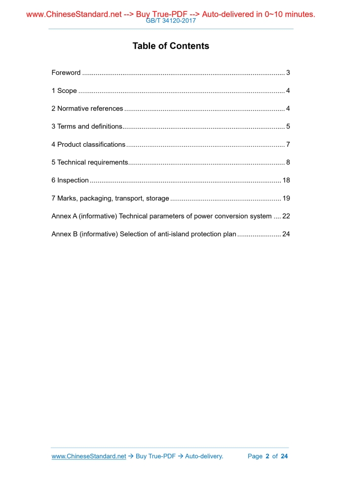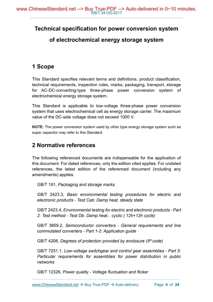 Similar standardsGB/T 34120-2017: Technical specification for power conversion system of electrochemical energy storage system---This is an excerpt. Full copy of true-PDF in English version (including equations, symbols, images, flow-chart, tables, and figures etc.), auto-downloaded/delivered in 9 seconds, can be purchased online: https://www.ChineseStandard.net/PDF.aspx/GBT34120-2017 NATIONAL STANDARD OF THE PEOPLE’S REPUBLIC OF CHINA ICS 27.180 F 19 Technical specification for power conversion system of electrochemical energy storage system Issued on: JULY 31, 2017 Implemented on: FEBRUARY 01, 2018 Issued by. General Administration of Quality Supervision, Inspection and Quarantine; Standardization Administration of the People's Republic of China. Table of ContentsForeword... 3 1 Scope... 4 2 Normative references... 4 3 Terms and definitions... 5 4 Product classifications... 7 5 Technical requirements... 8 6 Inspection... 18 7 Marks, packaging, transport, storage... 19 Annex A (informative) Technical parameters of power conversion system... 22 Annex B (informative) Selection of anti-island protection plan... 24 Technical specification for power conversion system of electrochemical energy storage system1 ScopeThis Standard specifies relevant terms and definitions, product classification, technical requirements, inspection rules, marks, packaging, transport, storage for AC-DC-converting-type three-phase power conversion system of electrochemical energy storage system. This Standard is applicable to low-voltage three-phase power conversion system that uses electrochemical cell as energy storage carrier. The maximum value of the DC-side voltage does not exceed 1000 V. NOTE. The power conversion system used by other type energy storage system such as super capacitor may refer to this Standard.2 Normative referencesThe following referenced documents are indispensable for the application of this document. For dated references, only the edition cited applies. For undated references, the latest edition of the referenced document (including any amendments) applies. GB/T 191, Packaging and storage marks GB/T 2423.3, Basic environmental testing procedures for electric and electronic products - Test Cab. Damp heat, steady state GB/T 2423.4, Environmental testing for electric and electronic products - Part 2.Test method - Test Db. Damp heat, cyclic (12h+12h cycle) GB/T 3859.2, Semiconductor converters - General requirements and line commutated converters - Part 1-2.Application guide GB/T 4208, Degrees of protection provided by enclosure (IP code) GB/T 7251.1, Low-voltage switchgear and control gear assemblies - Part 5. Particular requirements for assemblies for power distribution in public networks GB/T 12326, Power quality - Voltage fluctuation and flicker 3.3 power conversion system; PCS a converter that, in electrochemical energy storage system, is connected between battery system and grid (and/or load) to realize bidirectional conversion of power 3.4 converter efficiency the ratio of output active power to input active power of power conversion system, represented in a percentage; where, when grid stores power to battery module, the ratio of DC-side output active power to AC-side input active power is efficiency of rectification; when battery module releases power to grid, the ratio of AC-side output active power to DC-side input active power is inverter efficiency 3.5 grid mode an operation mode that power conversion system is simultaneously integrated into AC grid, operating in current source characteristics, storing grid power into battery module or feedbacking battery module energy to grid 3.6 islanded mode an operation mode that power conversion system operates in current source characteristics so as to provide power supply to grid that is connected to AC- side of energy storage system 3.7 transfer time between charge and discharge the time required by energy storage system to switch between charging state and discharging state; it usually refers to the average value when it switches from 90% rated power charging state to 90% rated power discharging state AND from 90% rated power discharging state to 90% rated power charging state 3.8 stabilized current precision the stability of DC-side output current of power conversion system when electrochemical energy storage system is under constant current working state, when DC-side output current of power conversion system remains stable at any value within its rated range 3.9 stabilized voltage precision the stability of DC-side output voltage of power conversion system when electrochemical energy storage system is under constant voltage working state, when DC-side output current of power conversion system varies within its rated value, when output voltage remains stable at any value within adjustable range Rated power level of power conversion system (kW) prefers the following series. 30, 50, 100, 200, 250, 500, 630, 750, 1000, 1500, 2000.5 Technical requirements5.1 Conditions of use 5.1.1 Environmental conditions for normal use Power conversion system shall work under the following environmental conditions. a) working environment temperature. -20°C ~ +45°C; When environment temperature exceeds the maximum value specified by environmental conditions for normal use (but not more than 15°C at the most), in order to make power conversion system operate safely, use according to the provisions of GB/T 3859.2; b) relative humidity of air ≤95%; c) altitude is ≤1000 m; when altitude is >1000 m, use according to the de- rate specified in GB/T 3859.2; d) air shall not contain excessive dust, acid, alkali, corrosive and explosive particles and gases; e) no severe vibration shock, vertical inclination is ≤5°. 5.1.2 Electrical conditions for normal use If there are no other regulations, the power conversion system that complies with this document, under the following grid conditions, shall be able to operate in the normal way. a) the harmonic volta