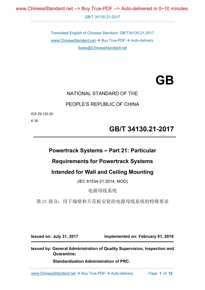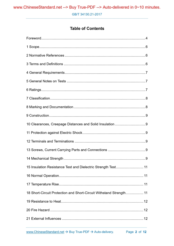 Similar standardsGB/T 34130.21-2017: Power-track systems -- Part 21: Particular requirements for power-track systems intended for wall and ceiling mounting---This is an excerpt. Full copy of true-PDF in English version (including equations, symbols, images, flow-chart, tables, and figures etc.), auto-downloaded/delivered in 9 seconds, can be purchased online: https://www.ChineseStandard.net/PDF.aspx/GBT34130.21-2017 GB NATIONAL STANDARD OF THE PEOPLE’S REPUBLIC OF CHINA ICS 29.120.20 K 30 Powertrack Systems – Part 21. Particular Requirements for Powertrack Systems Intended for Wall and Ceiling Mounting (IEC 61534-21.2014, MOD) Issued on: JULY 31, 2017 Implemented on: FEBRUARY 01, 2018 Issued by. General Administration of Quality Supervision, Inspection and Quarantine; Standardization Administration of PRC. Table of ContentsForeword ... 4 1 Scope ... 6 2 Normative References ... 6 3 Terms and Definitions ... 6 4 General Requirements ... 7 5 General Notes on Tests ... 7 6 Ratings ... 7 7 Classification ... 8 8 Marking and Documentation ... 8 9 Construction ... 9 10 Clearances, Creepage Distances and Solid Insulation ... 9 11 Protection against Electric Shock ... 9 12 Terminals and Terminations ... 9 13 Screws, Current Carrying Parts and Connections ... 9 14 Mechanical Strength ... 9 15 Insulation Resistance Test and Dielectric Strength Test ... 11 16 Normal Operation... 11 17 Temperature Rise ... 11 18 Short-Circuit Protection and Short-Circuit Withstand Strength ... 11 19 Resistance to Heat... 12 20 Fire Hazard ... 12 21 External Influences ... 12 22 Electromagnetic Compatibility ... 12ForewordGB/T 34130 Powertrack Systems consists of the following parts. --- Part 1. General Requirements; --- Part 21. Particular Requirements for Powertrack Systems Intended for Wall and Ceiling Mounting; --- Part 22. Particular Requirements for Powertrack Systems Intended for on Flor and under Floor Installation. This Part belongs to Part 21 of GB/T 34130. This Part was drafted as per the rules specified in GB/T 1.1-2009. This Part adopts the re-drafting method to modify and use IEC 61534-21.2014 Powertrack Systems – Part 21. Particular Requirements for Powertrack Systems Intended for Wall and Ceiling Mounting. The technical differences and causes between this Part and IEC 61534-21.2014 are as follows. --- For the Normative References, this part has made adjustment against the technical differences, so that adapt to the technical conditions of China; the adjustment is mainly reflected in the Clause 2 “Normative References”; the specific adjustments are as follows. Use GB/T 34130.21-2017 Powertrack Systems – Part 1. General Requirements (IEC 61534-1.2014, MOD) to replace IEC 61534-1.2011. This Part has made the following editorial changes. --- Delete the notes in the IEC 61534-21.2014 that apply to other countries and regions; such as Note to 14.2.102; --- Since China has not adopted the standard of IEC 61534-21.2006, delete Annex AA “Additional Test Requirements for PT Systems already Complying with IEC 61534-21.2006”. This Part was proposed by China Electrical Equipment Industrial Association. This Part shall be under the jurisdiction of National Technical Committee for Standardization of Electrical Accessories (SAC/TC 67). Drafting organizations of this Part. China National Electric Apparatus Research Powertrack Systems - Part 21. Particular Requirements for Powertrack Systems Intended for Wall and Ceiling Mounting1 ScopeThis Clause of GB/T 34130.1-2017 is applicable after the following modification. 1.1 This sub-clause of GB/T 34130.1-2017 is modified as. This Part of GB/T 34130 specifies the particular requirements and tests for powertrack systems (PT systems) intended for mounting on walls and/or ceiling. This Part is applicable to the PT systems intended for mounting on walls and ceilings. They may be installed flush or semi-flush, surface mounted, suspended or spaced away from the surface using fixing devices.2 Normative ReferencesThe following documents are essential to the application of this document. For the dated documents, only the versions with the dates indicated are applicable to this document; for the undated documents, only the latest version (including all the amendments) are applicable to this document. Clause 2 of GB/T 34130.1-2017 Powertrack Systems – Part 1. General Requirements (IEC 61534-1.2014, MOD) is applicable.3 Terms and DefinitionsFor the purposes of this document, the terms and definitions given in GB/T 34130.1- 2017 and the following apply. 3.101 Wall PT system PT system which is suitable for mounting on a vertical surface or a vertical structure directly or with the use of fixing devices. 3.102 Ceiling PT system ......Source: Above contents are excerpted from the full-copy PDF -- translated/reviewed by: www.ChineseStandard.net / Wayne Zheng et al. Tips & Frequently Asked Questions:Question 1: How long will the true-PDF of English version of GB/T 34130.21-2017 be delivered?Answer: The full copy PDF of English version of GB/T 34130.21-2017 can be downloaded in 9 seconds, and it will also be emailed to you in 9 seconds (double mechanisms to ensure the delivery reliably), with PDF-invoice.Question 2: Can I share the purchased PDF of GB/T 34130.21-2017_English with my colleagues?Answer: Yes. The purchased PDF of GB/T 34130.21-2017_English will be deemed to be sold to your employer/organization who actually paid for it, including your colleagues and your employer's intranet.Question 3: Does the price include tax/VAT?Answer: Yes. Our tax invoice, downloaded/delivered in 9 seconds, includes all tax/VAT and complies with 100+ countries' tax regulations (tax exempted in 100+ countries) -- See Avoidance of Double Taxation Agreements (DTAs): List of DTAs signed between Singapore and 100+ countriesQuestion 4: Do you accept my currency other than USD?Answer: Yes. www.ChineseStandard.us -- GB/T 34130.21-2017 -- Click this link and select your country/currency to pay, th