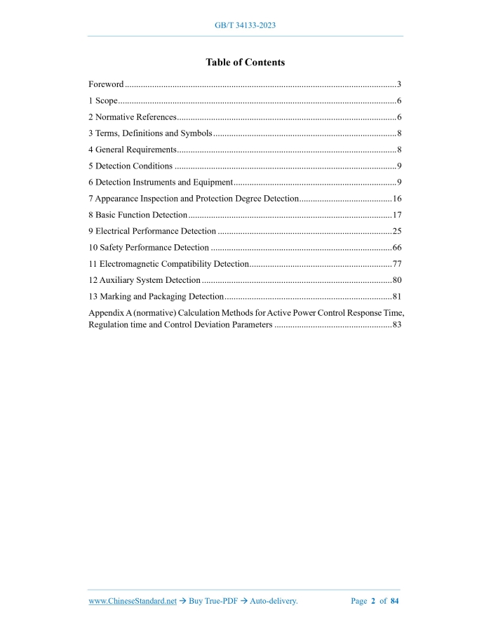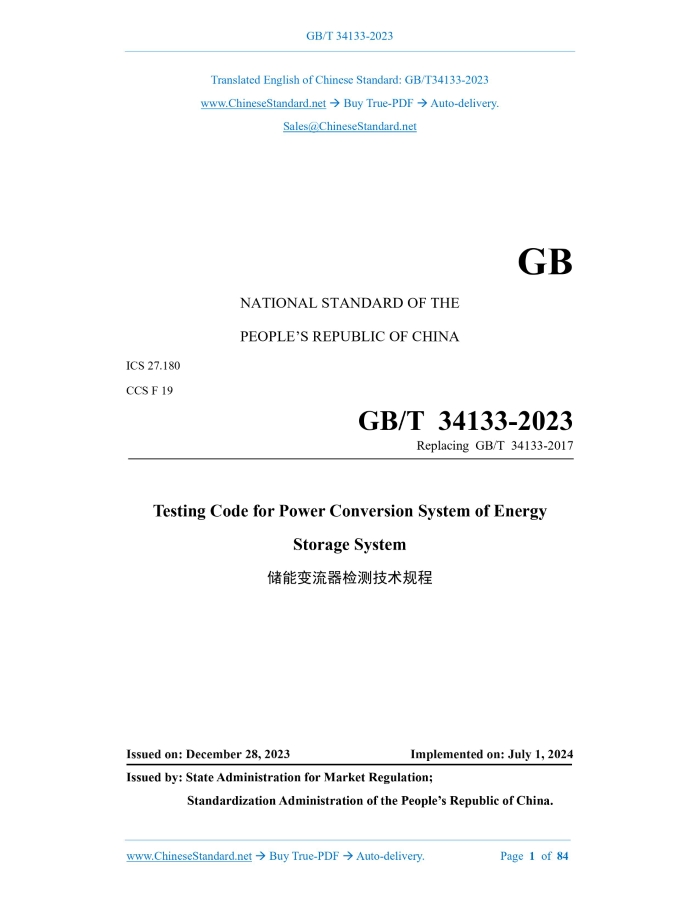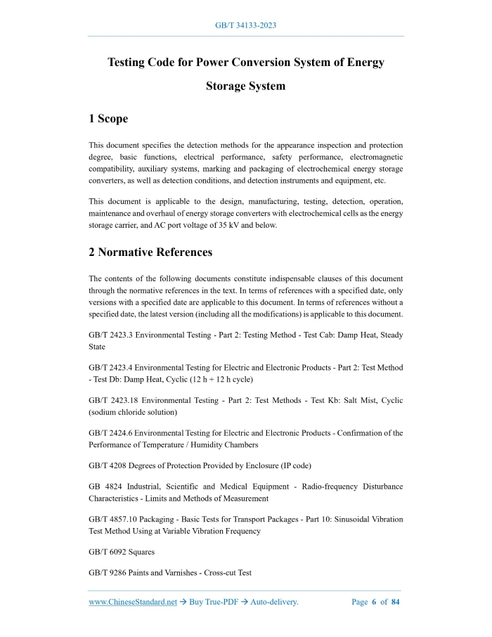 Similar standardsGB/T 34133-2023: Testing code for power conversion system of energy storage system---This is an excerpt. Full copy of true-PDF in English version (including equations, symbols, images, flow-chart, tables, and figures etc.), auto-downloaded/delivered in 9 seconds, can be purchased online: https://www.ChineseStandard.net/PDF.aspx/GBT34133-2023GB NATIONAL STANDARD OF THE PEOPLE’S REPUBLIC OF CHINA ICS 27.180 CCS F 19 Replacing GB/T 34133-2017 Testing Code for Power Conversion System of Energy Storage System Issued on. DECEMBER 28, 2023 Implemented on. JULY 1, 2024 Issued by. State Administration for Market Regulation; Standardization Administration of the People’s Republic of China. Table of ContentsForeword... 3 1 Scope... 6 2 Normative References... 6 3 Terms, Definitions and Symbols... 8 4 General Requirements... 8 5 Detection Conditions... 9 6 Detection Instruments and Equipment... 9 7 Appearance Inspection and Protection Degree Detection... 16 8 Basic Function Detection... 17 9 Electrical Performance Detection... 25 10 Safety Performance Detection... 66 11 Electromagnetic Compatibility Detection... 77 12 Auxiliary System Detection... 80 13 Marking and Packaging Detection... 81 Appendix A (normative) Calculation Methods for Active Power Control Response Time, Regulation time and Control Deviation Parameters... 831 ScopeThis document specifies the detection methods for the appearance inspection and protection degree, basic functions, electrical performance, safety performance, electromagnetic compatibility, auxiliary systems, marking and packaging of electrochemical energy storage converters, as well as detection conditions, and detection instruments and equipment, etc. This document is applicable to the design, manufacturing, testing, detection, operation, maintenance and overhaul of energy storage converters with electrochemical cells as the energy storage carrier, and AC port voltage of 35 kV and below.2 Normative ReferencesThe contents of the following documents constitute indispensable clauses of this document through the normative references in the text. In terms of references with a specified date, only versions with a specified date are applicable to this document. In terms of references without a specified date, the latest version (including all the modifications) is applicable to this document. GB/T 2423.3 Environmental Testing - Part 2.Testing Method - Test Cab. Damp Heat, Steady State GB/T 2423.4 Environmental Testing for Electric and Electronic Products - Part 2.Test Method - Test Db. Damp Heat, Cyclic (12 h + 12 h cycle) GB/T 2423.18 Environmental Testing - Part 2.Test Methods - Test Kb. Salt Mist, Cyclic (sodium chloride solution) GB/T 2424.6 Environmental Testing for Electric and Electronic Products - Confirmation of the Performance of Temperature / Humidity Chambers GB/T 4208 Degrees of Protection Provided by Enclosure (IP code) GB 4824 Industrial, Scientific and Medical Equipment - Radio-frequency Disturbance Characteristics - Limits and Methods of Measurement GB/T 4857.10 Packaging - Basic Tests for Transport Packages - Part 10.Sinusoidal Vibration Test Method Using at Variable Vibration Frequency GB/T 6092 Squares GB/T 9286 Paints and Varnishes - Cross-cut Test GB 9524.1 (TRANSLATOR NOTE. it should be GB/T 9254.1) Information Technology Equipment, Multimedia Equipment and Receivers - Electromagnetic Compatibility - Part 1. Emission Requirements3 Terms, Definitions and Symbols3.1 Terms and Definitions The terms and definitions defined in GB/T 34120 and DL/T 2528 are applicable to this document. 3.2 Symbols The following symbols are applicable to this document. Pn. the rated power, expressed in kW or MW; Un. the AC port rated voltage, expressed in V or kV; Vdc_max. the maximum DC voltage of energy storage converter, expressed in V or kV.4 General Requirements4.1 Before the detection of the energy storage converter, relevant technical data of the energy storage converter shall be collected, a detection scheme shall be prepared, and safety measures shall be formulated. 4.2 The detection instruments and meters shall be verified or calibrated, and within the validity period. 4.3 The detection content of the energy storage converter shall include appearance, protection degree, basic functions, electrical performance, safety performance, electromagnetic compatibility, auxiliary systems, marking and packaging, etc. 4.4 During the detection, test data and environmental conditions shall be recorded. After the detection is completed, a detection report shall be issued. The detection report shall include detection conditions, detection equipment, detection basis, detection process and detection conclusions, etc.5 Detection Conditions5.1 Environmental Conditions Unless otherwise specified, the detection environment shall satisfy the following requirements. 5.2 Electrical Conditions When directly connected to the public power grid, the power quality of the grid shall satisfy the following requirements.6 Detection Instruments and Equipment6.1 Detection Instruments The accuracy levels of voltage / current sensors, thermometers and hygrometers, sound level meters and data acquisition devices shall at least satisfy the requirements of Table 1.The detection instruments and meters shall satisfy the following requirements. 6.2 Power Grid Simulation Device The power grid simulation device shall satisfy the following requirements. 6.3 Voltage Fault Generation Device 6.3.1 Low-voltage fault generation device The low-voltage fault generation device should adopt a passive device. The device structure is shown in Figure 1.The device performance shall satisfy the following requirements. 6.3.2 High-voltage fault generation device The high-voltage fault generation device should adopt a passive device. The device structure is shown in Figure 2.The device performance shall satisfy the following requirements. 6.3.3 Continuous fault generation device The continuous fault generation