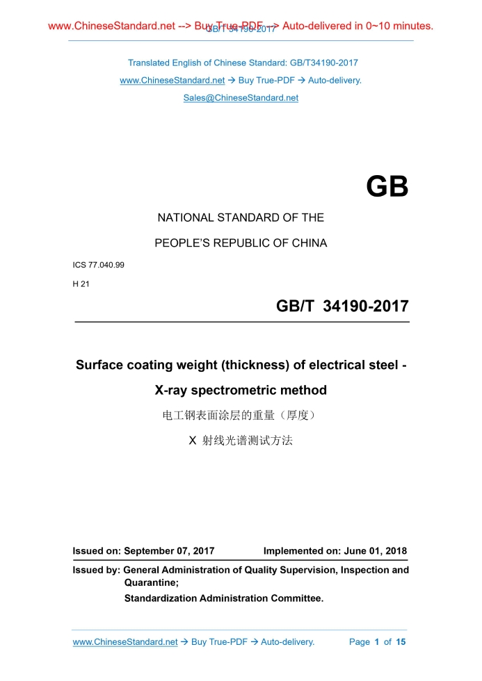 GB/T 34190-2017: Surface coating weight (thickness) of electrical steel - X-ray spectrometric method Delivery: 9 seconds. True-PDF full-copy in English & invoice will be downloaded + auto-delivered via email. See step-by-step procedure Status: Valid