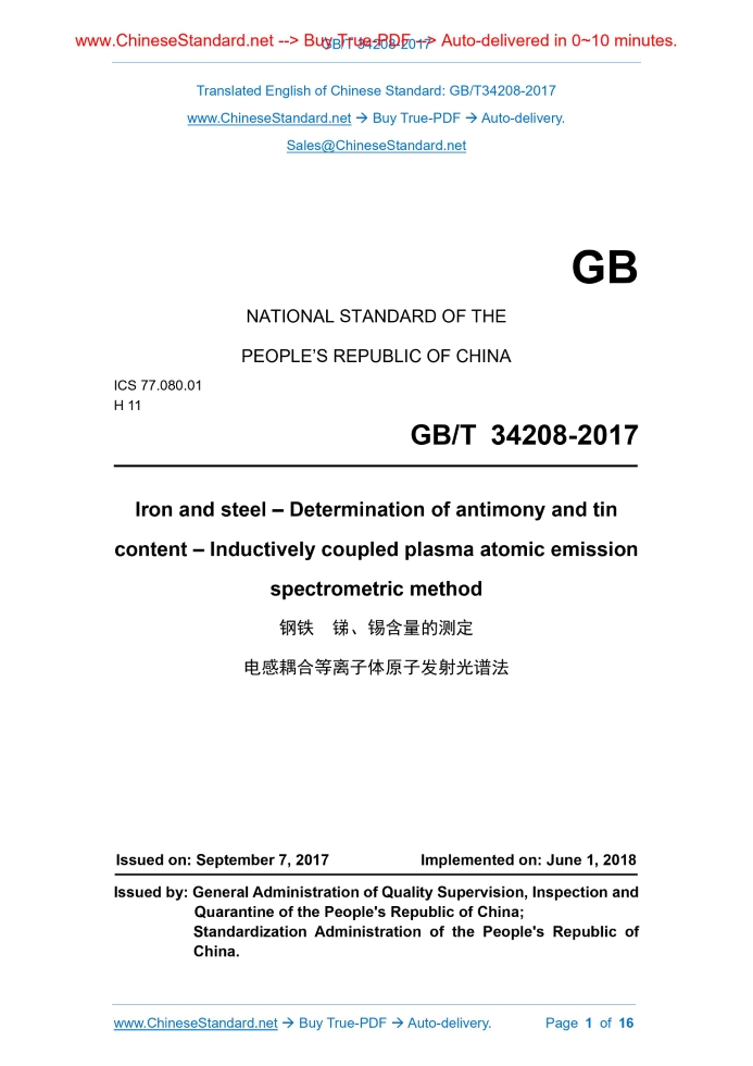 GB/T 34208-2017: Iron and steel - Determination of antimony and tin content - Inductively coupled plasma atomic emission spectrometric method Delivery: 9 seconds. True-PDF full-copy in English & invoice will be downloaded + auto-delivered via email. See step-by-step procedure Status: Valid