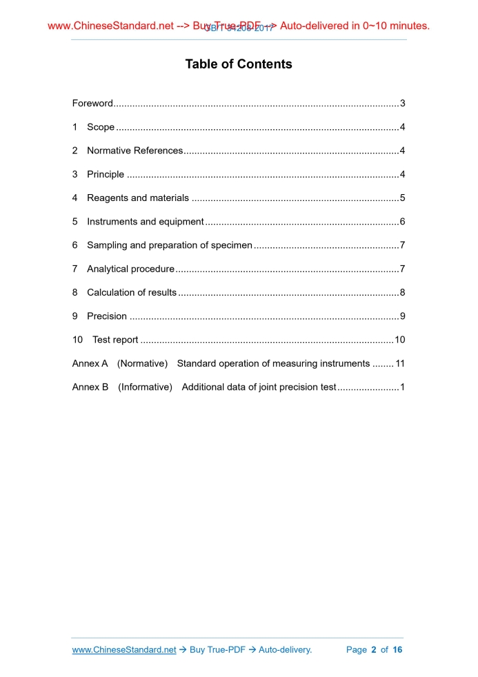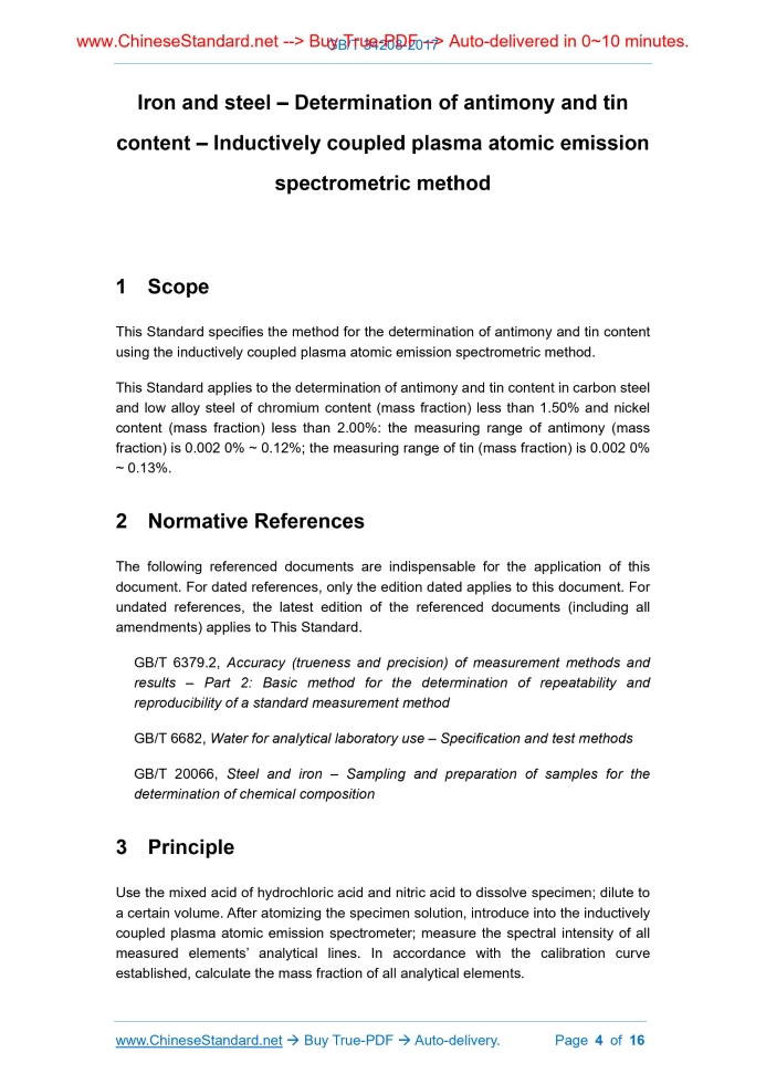 Similar standardsGB/T 34208-2017: Iron and steel - Determination of antimony and tin content - Inductively coupled plasma atomic emission spectrometric method---This is an excerpt. Full copy of true-PDF in English version (including equations, symbols, images, flow-chart, tables, and figures etc.), auto-downloaded/delivered in 9 seconds, can be purchased online: https://www.ChineseStandard.net/PDF.aspx/GBT34208-2017 GB NATIONAL STANDARD OF THE PEOPLE’S REPUBLIC OF CHINA ICS 77.080.01 H 11 Iron and steel – Determination of antimony and tin content – Inductively coupled plasma atomic emission spectrometric method Issued on: SEPTEMBER 7, 2017 Implemented on: JUNE 1, 2018 Issued by. General Administration of Quality Supervision, Inspection and Quarantine of the People's Republic of China; Standardization Administration of the People's Republic of China. Table of ContentsForeword ... 3 1 Scope ... 4 2 Normative References ... 4 3 Principle ... 4 4 Reagents and materials ... 5 5 Instruments and equipment ... 6 6 Sampling and preparation of specimen ... 7 7 Analytical procedure ... 7 8 Calculation of results ... 8 9 Precision ... 9 10 Test report ... 10 Annex A (Normative) Standard operation of measuring instruments ... 11 Annex B (Informative) Additional data of joint precision test ... 1 Iron and steel – Determination of antimony and tin content – Inductively coupled plasma atomic emission spectrometric method1 ScopeThis Standard specifies the method for the determination of antimony and tin content using the inductively coupled plasma atomic emission spectrometric method. This Standard applies to the determination of antimony and tin content in carbon steel and low alloy steel of chromium content (mass fraction) less than 1.50% and nickel content (mass fraction) less than 2.00%. the measuring range of antimony (mass fraction) is 0.002 0% ~ 0.12%; the measuring range of tin (mass fraction) is 0.002 0% ~ 0.13%.2 Normative ReferencesThe following referenced documents are indispensable for the application of this document. For dated references, only the edition dated applies to this document. For undated references, the latest edition of the referenced documents (including all amendments) applies to This Standard. GB/T 6379.2, Accuracy (trueness and precision) of measurement methods and results – Part 2. Basic method for the determination of repeatability and reproducibility of a standard measurement method GB/T 6682, Water for analytical laboratory use – Specification and test methods GB/T 20066, Steel and iron – Sampling and preparation of samples for the determination of chemical composition3 PrincipleUse the mixed acid of hydrochloric acid and nitric acid to dissolve specimen; dilute to a certain volume. After atomizing the specimen solution, introduce into the inductively coupled plasma atomic emission spectrometer; measure the spectral intensity of all measured elements’ analytical lines. In accordance with the calibration curve established, calculate the mass fraction of all analytical elements.4 Reagents and materialsUnless specified otherwise, only use certified analytically pure reagents and grade II water specified in GB/T 6682 in the analysis. 4.1 High-purity iron, ρ about 1.19 g/mL. 4.2 Nitric acid, ρ about 1.42 g/mL. 4.3 Nitric acid, ρ about 1.42 g/mL, diluted to be 1 + 1. 4.4 Antimony standard solution 4.5 Antimony stock solution, 500 μg/mL Weigh 1.371 5 g of antimony potassium tartrate (C4H4KOSb·ଵଶ H2O) pre-dried in a desiccator; dissolve in hydrochloric acid (1 + 9); transfer to a 1,000 mL volumetric flask; use hydrochloric acid (1 + 9) to dilute to scale; mix up. 1 mL of the solution contains 500 μg of antimony. A merchant certified antimony standard solution can also be used. 4.5.1 Antimony standard solution, 10.0 μg/mL Transfer 2.00 mL of antimony stock solution (4.5.1) to a 100 mL volumetric flask; use hydrochloric acid (1 + 9) to dilute to scale; mix up. 1 mL of the solution contains 10.0 μg of antimony. 4.5.2 Tin standard solution 4.6 Tin standard solution 4.6.1 Tin stock solution, 500 μg/mL Weigh 0.500 0 g of high-purity tin (mass fraction not less than 99.9%); place into a 200 mL beaker. Add 40 mL of hydrochloric acid (1 + 1); heat to dissolve. After cooling to room temperature, transfer the solution into a 1,000 mL volumetric flask; use hydrochloric acid to dilute to scale; mix up. 1 mL of the solution contains 500 μg of tin. A merchant certified antimony standard solution can also be used. 4.6.2 Tin standard solution, 10.0 μg/mL Spray in blank test solutions for about 10 s; measure 10 times using the preset integral time. Spray in 10 times detection limit solutions about 10 s; measure 10 times using the preset integral time. Based on the readings of intensity obtained from blank solutions and 10 times detection limit solutions, calculate the average intensity of blank solutions Xഥ b, the average intensity of 10 times detection limit solutions Xഥ1 and the standard deviation of blank sb. Calculate the net average intensity of 10 times detection limit solutions (Xഥ n1) in accordance with Equation (A.1). Calculate the detection limit of tested elements (DL) in accordance with Equation (A.2). where. ρ1 – the concentration of 10 times detection limit solutions, in μg/mL; It shall be indicated that, because of limited number of repeated measurements, the errors of detection limit calculated using this method are within a wide range. A.2.3 Determination of background equivalent concentration Calculate the background equivalent concentration (BEC) in accordance with Equation (A.3). A.3 Spectral line interferences Spectral line inferences make the intensities of tested elements’ analytical lines on the high side, so spectral interference calibration needs to be done. Prepare respectively one solution containing 1 mg/L of tested elements and one solution containing 1,000 mg/L of interfering elements. Spray in respectively water, 1 mg/L