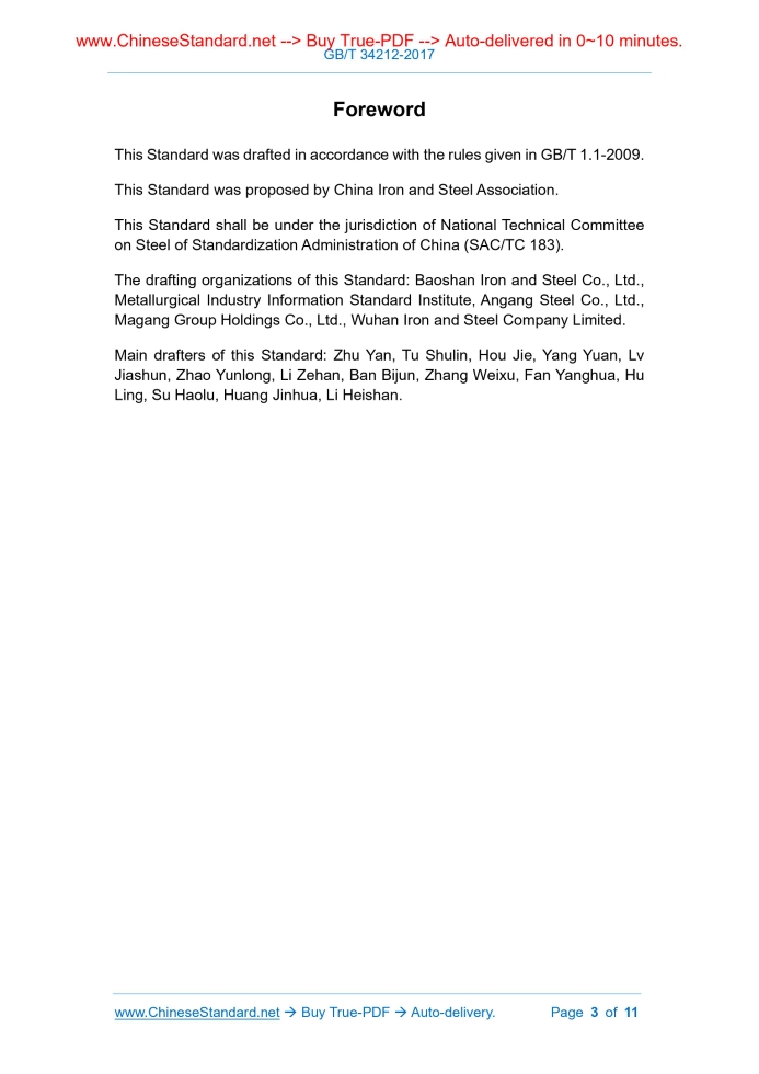 Similar standardsGB/T 34212-2017: Cold rolled steel strip for battery shell---This is an excerpt. Full copy of true-PDF in English version (including equations, symbols, images, flow-chart, tables, and figures etc.), auto-downloaded/delivered in 9 seconds, can be purchased online: https://www.ChineseStandard.net/PDF.aspx/GBT34212-2017GB NATIONAL STANDARD OF THE PEOPLE’S REPUBLIC OF CHINA ICS 77.140.50 H 46 Cold rolled steel strip for battery shell Issued on: SEPTEMBER 7, 2017 Implemented on: JUNE 1, 2018 Issued by. General Administration of Quality Supervision, Inspection and Quarantine; Standardization Administration Committee. Table of ContentsForeword ... 3 1 Scope ... 4 2 Normative references ... 4 3 Classification and code ... 6 4 Order content ... 6 5 Size, shape, weight and allowable deviation ... 7 6 Technical requirements ... 7 7 Test methods ... 9 8 Inspection rules ... 10 9 Packaging, marks and quality certificate ... 10 Annex A (Normative) Conversions of HRB and HR30T ... 11ForewordThis Standard was drafted in accordance with the rules given in GB/T 1.1-2009. This Standard was proposed by China Iron and Steel Association. This Standard shall be under the jurisdiction of National Technical Committee on Steel of Standardization Administration of China (SAC/TC 183). The drafting organizations of this Standard. Baoshan Iron and Steel Co., Ltd., Metallurgical Industry Information Standard Institute, Angang Steel Co., Ltd., Magang Group Holdings Co., Ltd., Wuhan Iron and Steel Company Limited. Main drafters of this Standard. Zhu Yan, Tu Shulin, Hou Jie, Yang Yuan, Lv Jiashun, Zhao Yunlong, Li Zehan, Ban Bijun, Zhang Weixu, Fan Yanghua, Hu Ling, Su Haolu, Huang Jinhua, Li Heishan. Cold rolled steel strip for battery shell1 ScopeThis Standard specifies the classification and code, order content, size, shape, weight, technical requirements, test methods, inspection rules, packaging, marks and quality certificates of cold rolled steel strip for battery shell (hereinafter referred to as the steel strip). This Standard is applicable to the cold rolled steel strip of which the thickness is 0.25mm ~ 0.50mm, mainly used for steel shells for flushing alkaline and rechargeable batteries.2 Normative referencesThe following referenced documents are indispensable for the application of this document. For dated references, only the edition cited applies. For undated references, the latest edition of the referenced document (including any amendments) applies. GB/T 222, Permissible Tolerances for Chemical Composition of Steel Products GB/T 223.9, Iron steel and alloy - Determination of aluminium content - Chrom azurol S photometric method GB/T 223.59, Iron, Steel and Alloy - Determination of Phosphorus Content - Bismuth Phosphomolybdate Blue Spectrophotometric Method and Antimony Phosphomolybdate Blue Spectrophotometric Method GB/T 223.60, Methods for chemical analysis of iron, steel and alloy - The perchloric acid dehydration gravimetric method for the determination of silicon content GB/T 223.62, Methods for chemical analysis of iron, steel and alloy - The butyl acetate extraction photometric method for the determination of phosphorus content GB/T 223.63, Methods for chemical analysis of iron, steel and alloy - The sodium (potassium) periodate photometric method for the determination of manganese content GB/T 223.64, Iron, Steel and Alloy - Determination of Manganese Content - Flame Atomic Absorption Spectrometric Method GB/T 228.1-2010, Metallic materials - Tensile testing - Part 1 . Method of test at room temperature GB/T 230.1, Metallic materials - Rockwell hardness test - Part 1. Test method(scales A, B, C, D, E, F, G, H, K, N, T) GB/T 247, General rule of package, mark and certification for steel plates (sheets) and strips GB/T 708, Dimension, shape, weight and tolerance for code - rolled steel plates and sheets GB/T 2523, Measuring method of surface roughness and peak count for cold-rolled metal sheet (strip) GB/T 2975, Steel and Steel Products - Location and Preparation of Test Pieces for Mechanical Testing GB/T 4336, Carbon and low-alloy steel - Determination of multi-element contents - Spark discharge atomic emission spectrometric method (routine method) GB/T 8170, Rules of rounding off for numerical values & expression and judgement of limiting values GB/T 17505, Steel and steel products General technical delivery requirements GB/T 20066, Steel and Iron-Sampling and Preparation of Samples for the Determination of Chemical Composition GB/T 20123, Steel and iron - Determination of total carbon and sulfur content Infrared absorption method after combustion in an induction furnace (routine method) GB/T 20125, Low-alloy steel - Determination of multi-element contents - Inductively coupled plasma atomic emission spectrometric method GB/T 20126, Unalloyed steel - Determination of low carbon content - Part 2. Infrared absorption method after combustion in an induction furnace (with preheating) ......Source: Above contents are excerpted from the full-copy PDF -- translated/reviewed by: www.ChineseStandard.net / Wayne Zheng et al. Tips & Frequently Asked Questions:Question 1: How long will the true-PDF of English version of GB/T 34212-2017 be delivered?Answer: The full copy PDF of English version of GB/T 34212-2017 can be downloaded in 9 seconds, and it will also be emailed to you in 9 seconds (double mechanisms to ensure the delivery reliably), with PDF-invoice.Question 2: Can I share the purchased PDF of GB/T 34212-2017_English with my colleagues?Answer: Yes. The purchased PDF of GB/T 34212-2017_English will be deemed to be sold to your employer/organization who actually paid for it, including your colleagues and your employer's intranet.Question 3: Does the price include tax/VAT?Answer: Yes. Our tax invoice, downloaded/delivered in 9 seconds, includes all tax/VAT and complies with 100+ countries' tax regulations (tax exempted in 100+ countries) -- See Avoidance of Double Taxation Agreements 