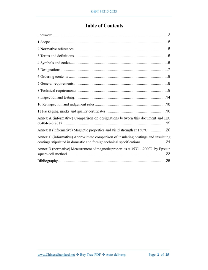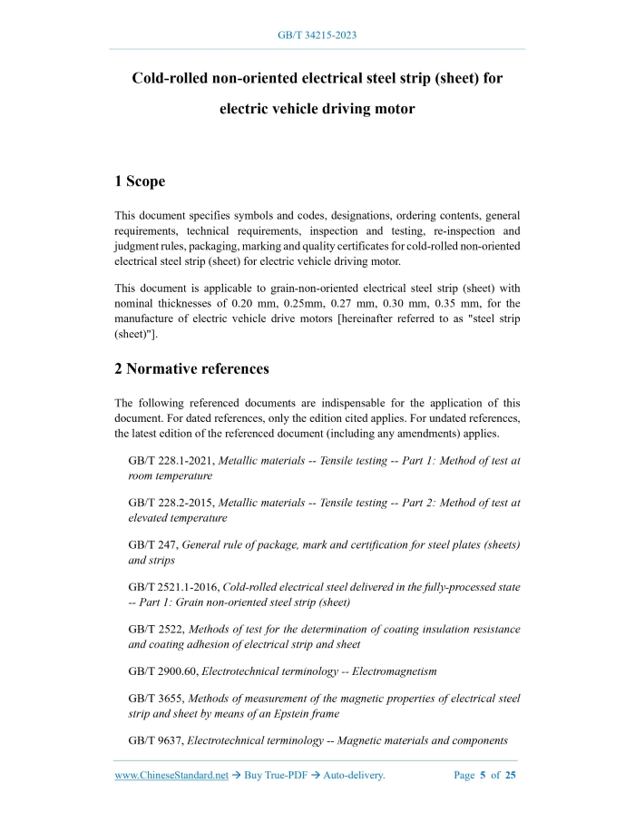 Similar standardsGB/T 34215-2023: Cold-rolled non-oriented electrical steel strip (sheet)for electric vehicle driving motor---This is an excerpt. Full copy of true-PDF in English version (including equations, symbols, images, flow-chart, tables, and figures etc.), auto-downloaded/delivered in 9 seconds, can be purchased online: https://www.ChineseStandard.net/PDF.aspx/GBT34215-2023 GB NATIONAL STANDARD OF THE PEOPLE’S REPUBLIC OF CHINA ICS 77.140.40 CCS H 53 Replacing GB/T 34215-2017 Cold-rolled non-oriented electrical steel strip (sheet) for electric vehicle driving motor ISSUED ON: AUGUST 06, 2023 IMPLEMENTED ON: MARCH 01, 2024 Issued by: State Administration for Market Regulation; Standardization Administration of the People's Republic of China. Table of ContentsForeword ... 3 1 Scope ... 5 2 Normative references ... 5 3 Terms and definitions ... 6 4 Symbols and codes... 6 5 Designations ... 7 6 Ordering contents ... 8 7 General requirements ... 8 8 Technical requirements ... 9 9 Inspection and testing ... 14 10 Reinspection and judgement rules ... 18 11 Packaging, marks and quality certificates ... 18 Annex A (informative) Comparison on designations between this document and IEC 60404-8-8:2017 ... 19 Annex B (informative) Magnetic properties and yield strength at 150°C ... 20 Annex C (informative) Approximate comparison of insulating coatings and insulating coatings stipulated in domestic and foreign technical specifications ... 21 Annex D (normative) Measurement of magnetic properties at 35℃ ~200℃ by Epstein square coil method ... 23 Bibliography ... 25 Cold-rolled non-oriented electrical steel strip (sheet) for electric vehicle driving motor1 ScopeThis document specifies symbols and codes, designations, ordering contents, general requirements, technical requirements, inspection and testing, re-inspection and judgment rules, packaging, marking and quality certificates for cold-rolled non-oriented electrical steel strip (sheet) for electric vehicle driving motor. This document is applicable to grain-non-oriented electrical steel strip (sheet) with nominal thicknesses of 0.20 mm, 0.25mm, 0.27 mm, 0.30 mm, 0.35 mm, for the manufacture of electric vehicle drive motors [hereinafter referred to as "steel strip (sheet)"].2 Normative referencesThe following referenced documents are indispensable for the application of this document. For dated references, only the edition cited applies. For undated references, the latest edition of the referenced document (including any amendments) applies. GB/T 228.1-2021, Metallic materials -- Tensile testing -- Part 1: Method of test at room temperature GB/T 228.2-2015, Metallic materials -- Tensile testing -- Part 2: Method of test at elevated temperature GB/T 247, General rule of package, mark and certification for steel plates (sheets) and strips GB/T 2521.1-2016, Cold-rolled electrical steel delivered in the fully-processed state -- Part 1: Grain non-oriented steel strip (sheet) GB/T 2522, Methods of test for the determination of coating insulation resistance and coating adhesion of electrical strip and sheet GB/T 2900.60, Electrotechnical terminology -- Electromagnetism GB/T 3655, Methods of measurement of the magnetic properties of electrical steel strip and sheet by means of an Epstein frame GB/T 9637, Electrotechnical terminology -- Magnetic materials and components GB/T 17505, Steel and steel products -- General technical delivery requirements GB/T 19289, Methods of measurement of resistivity, density and stacking factor of electrical steel strip and sheet YB/T 4292, Methods of determination of the geometrical characteristics of electric steel sheet and strip YB/T 4731-2019, Reverse bend test method for electrical steel strip and sheet3 Terms and definitionsFor the purposes of this document, the terms and definitions defined in GB/T 2900.60, GB/T 9637, GB/T 2521.1-2016 apply.4 Symbols and codes4.1 Symbols The following symbols apply to this document. A50mm: Elongation after break with original gauge length of 50 mm. J5000: Magnetic polarization intensity at which the peak magnetic field intensity is 5000A/m. P1.0/400: Specific total loss measured with the peak magnetic polarization intensity at 1.0 T and the frequency at 400 Hz. ReL: Lower yield strength. Rm: Tensile strength. Rp0.2: Stress that specifies the plastic elongation of 0.2%. 4.2 Codes The following codes apply to this document. NV: Non grain-oriented steel for electrical vehicle NVP: Non grain-oriented high-permeability steel for electrical vehicle NVPS: Non grain-oriented high-permeability and high-strength steel for electrical vehicle NVS: Non grain-oriented high strength steel for electrical vehicle5 Designations5.1 Product type In this document, the products are classified into four types: non-grain-oriented type, non-grain-oriented high-permeability type, non-grain-oriented high-permeability and high-strength type and non-grain-oriented high strength type. 5.2 Methods for expressing designations 5.2.1 The levels for designations of non-grain-oriented type, non-grain-oriented high- permeability type, non-grain-oriented high-permeability and high-strength type are defined based on the maximum specific total loss value P1.0/400 of material nominal thicknesses 0.20 mm, 0.25 mm, 0.27 mm, 0.30 mm and 0.35 mm, measured with magnetic polarization peak at 1.0 T, frequency at 400 Hz. The levels for designations of non-grain-oriented high strength type are defined according to the minimum yield strength for material nominal thickness 0.35 mm. 5.2.2 The product designation consists of the following three parts in order. - 100 times the nominal thickness of the material, in millimeters (mm). - Product type code. - When the product type is non-grain-oriented type, non-grain-oriented high- permeability type, or non-grain-oriented high-permeability and high-strength type, Part 3 is 100 times the maximum specific total loss P1.0/400 (unit: W/kg) measured with the peak magnetic polarization