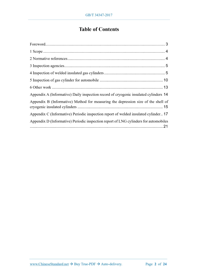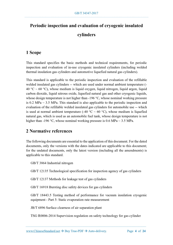 Similar standardsGB/T 34347-2017: Periodic inspection and evaluation of cryogenic insulated cylinders---This is an excerpt. Full copy of true-PDF in English version (including equations, symbols, images, flow-chart, tables, and figures etc.), auto-downloaded/delivered in 9 seconds, can be purchased online: https://www.ChineseStandard.net/PDF.aspx/GBT34347-2017NATIONAL STANDARD OF THE PEOPLE’S REPUBLIC OF CHINA ICS 23.020.30 J 74 Periodic inspection and evaluation of cryogenic insulated cylinders Issued on. OCTOBER 14, 2017 Implemented on. APRIL 01, 2018 Issued by. General Administration of Quality Supervision, Inspection and Quarantine of PRC; Standardization Administration of PRC. Table of ContentsForeword... 3 1 Scope... 4 2 Normative references... 4 3 Inspection agencies... 5 4 Inspection of welded insulated gas cylinders... 5 5 Inspection of gas cylinder for automobile... 10 6 Other work... 13 Appendix A (Informative) Daily inspection record of cryogenic insulated cylinders 14 Appendix B (Informative) Method for measuring the depression size of the shell of cryogenic insulated cylinders... 15 Appendix C (Informative) Periodic inspection report of welded insulated cylinder.. 17 Appendix D (Informative) Periodic inspection report of LNG cylinders for automobiles ... 21ForewordThis standard was drafted in accordance with the rules given in GB/T 1.1-2009. This standard was proposed by AND shall be under the jurisdiction of the National Gas Cylinder Standardization Technical Committee (SAC/TC 31). Drafting organizations of this standard. Dalian Boiler and Pressure Vessel Inspection and Research Institute, Changzhou Branch of Jiangsu Special Equipment Safety Supervision and Inspection Research Institute, China Special Equipment Inspection and Research Institute, Shanghai Special Equipment Supervision and Inspection Technology Research Institute, Beijing Tianhai Industry Co., Ltd., Ultra-Cryogenic Engineering System (Changzhou) Co., Ltd., Guangdong Special Equipment Inspection and Research Institute, Jiangsu Baocheng Special Equipment Inspection Co., Ltd., Suzhou Rongtai New Special Equipment Technology Inspection Co., Ltd., Te Anjie (Jiangsu) New Energy Technology Co., Ltd.. The main drafters of this standard. Wang Liping, Han Bing, Ning Ye, Yin Airong, Zhang Hejun, Xu Huixin, Tan Yue, Huang Qianghua, Tian Feng, Yang Jin, Yin Jinsong. Periodic inspection and evaluation of cryogenic insulated cylinders1 ScopeThis standard specifies the basic methods and technical requirements, for periodic inspection and evaluation of in-use cryogenic insulated cylinders (including welded thermal insulation gas cylinders and automotive liquefied natural gas cylinders). This standard is applicable to the periodic inspection and evaluation of the refillable welded insulated gas cylinders -- which are used under normal ambient temperature (- 40 °C ~ 60 °C), whose medium is liquid oxygen, liquid nitrogen, liquid argon, liquid carbon dioxide, liquid nitrous oxide, liquefied natural gas and other cryogenic liquids, whose design temperature is not higher than -196 °C, whose nominal working pressure is 0.2 MPa ~ 3.5 MPa. This standard is also applicable to the periodic inspection and evaluation of the refillable welded insulated gas cylinders for automobile use -- which is used at normal ambient temperature (-40 °C ~ 60 °C), whose medium is liquefied natural gas, which is used as an automobile fuel tank, whose design temperature is not higher than -196 °C, whose nominal working pressure is 0.6 MPa ~ 3.5 MPa.2 Normative referencesThe following documents are essential to the application of this document. For the dated documents, only the versions with the dates indicated are applicable to this document; for the undated documents, only the latest version (including all the amendments) is applicable to this standard. GB/T 3864 Industrial nitrogen GB/T 12135 Technological specification for inspection agency of gas cylinders GB/T 12137 Methods for leakage test of gas cylinders GB/T 16918 Bursting disc safety devices for gas cylinders GB/T 18443.5 Testing method of performance for vacuum insulation cryogenic equipment - Part 5.Static evaporation rate measurement JB/T 6896 Surface clearness of air separation plant3 Inspection agenciesThe inspection agency, that undertakes the periodic inspection of gas cylinders, shall meet the requirements of GB/T 12135, AND be approved by the special equipment safety supervision and management authority, in accordance with TSG Z7001.4 Inspection of welded insulated gas cylinders4.1 Inspection period 4.1.1 The period of periodic inspection of gas cylinders shall not exceed 3 years. 4.2 Inspection items The inspection items of gas cylinders include external inspection, safety accessories inspection, valve and pipeline inspection, air tightness test, static evaporation rate testing. 4.3 Preparation for inspection 4.3.1 Review of technical archives 4.3.2 Record 4.3.2.1 Check and record the manufacturing marks and inspection marks, on the nameplate of the gas cylinders one by one. The records include the country of manufacture, the cylinder manufacturing license number, the name of the manufacturer, the cylinder number, the product standard number, the standard name, the year and month of manufacture, the nominal working pressure, the test pressure of the liner, the medium contained, the nominal volume, the maximum filling volume, the net weight of gas cylinder, the date of last inspection. 4.3.3 Disposal of in-cylinder medium 4.3.3.1 Appropriate methods shall be taken, to discharge the medium in the cylinder and properly handle it, under the conditions of ensuring safety, hygiene, non-polluting the environment. 4.3.3.2 For gas cylinders with unknown medium, valves that cannot be opened, safety accessories that fail, they shall be stored separately and properly disposed of. 4.3.4 Surface cleaning and accessory removal 4.5 Inspection of safety accessories, valve, pipeline 4.5.1 Inspect