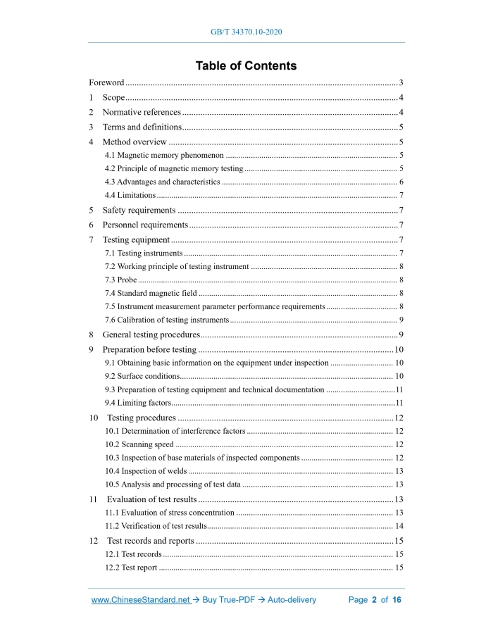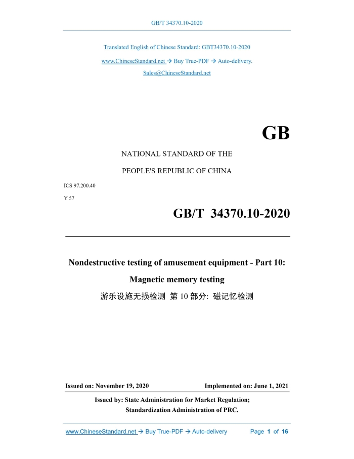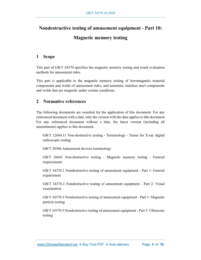 Similar standardsGB/T 34370.10-2020: Nondestructive testing of amusement equipment - Part 10: Magnetic memory testing---This is an excerpt. Full copy of true-PDF in English version (including equations, symbols, images, flow-chart, tables, and figures etc.), auto-downloaded/delivered in 9 seconds, can be purchased online: https://www.ChineseStandard.net/PDF.aspx/GBT34370.10-2020GB NATIONAL STANDARD OF THE PEOPLE'S REPUBLIC OF CHINA ICS 97.200.40 Y 57 Nondestructive testing of amusement equipment - Part 10: Magnetic memory testing ISSUED ON: NOVEMBER 19, 2020 IMPLEMENTED ON: JUNE 1, 2021 Issued by: State Administration for Market Regulation; Standardization Administration of PRC. Table of ContentsForeword ... 3 1 Scope ... 4 2 Normative references ... 4 3 Terms and definitions ... 5 4 Method overview ... 5 4.1 Magnetic memory phenomenon ... 5 4.2 Principle of magnetic memory testing ... 5 4.3 Advantages and characteristics ... 6 4.4 Limitations ... 7 5 Safety requirements ... 7 6 Personnel requirements ... 7 7 Testing equipment ... 7 7.1 Testing instruments ... 7 7.2 Working principle of testing instrument ... 8 7.3 Probe ... 8 7.4 Standard magnetic field ... 8 7.5 Instrument measurement parameter performance requirements ... 8 7.6 Calibration of testing instruments ... 9 8 General testing procedures ... 9 9 Preparation before testing ... 10 9.1 Obtaining basic information on the equipment under inspection ... 10 9.2 Surface conditions ... 10 9.3 Preparation of testing equipment and technical documentation ... 11 9.4 Limiting factors ... 11 10 Testing procedures ... 12 10.1 Determination of interference factors ... 12 10.2 Scanning speed ... 12 10.3 Inspection of base materials of inspected components ... 12 10.4 Inspection of welds ... 13 10.5 Analysis and processing of test data ... 13 11 Evaluation of test results ... 13 11.1 Evaluation of stress concentration ... 13 11.2 Verification of test results... 14 12 Test records and reports ... 15 12.1 Test records ... 15 12.2 Test report ... 15 Nondestructive testing of amusement equipment - Part 10: Magnetic memory testing1 ScopeThis part of GB/T 34370 specifies the magnetic memory testing and result evaluation methods for amusement rides. This part is applicable to the magnetic memory testing of ferromagnetic material components and welds of amusement rides, and austenitic stainless steel components and welds that are magnetic under certain conditions.2 Normative referencesThe following documents are essential for the application of this document. For any referenced document with a date, only the version with the date applies to this document. For any referenced document without a date, the latest version (including all amendments) applies to this document. GB/T 12604.11 Non-destructive testing - Terminology - Terms for X-ray digital radioscopic testing GB/T 20306 Amusement devices terminology GB/T 26641 Non-destructive testing - Magnetic memory testing - General requirements GB/T 34370.1 Nondestructive testing of amusement equipment - Part 1: General requirement GB/T 34370.2 Nondestructive testing of amusement equipment - Part 2: Visual examination GB/T 34370.3 Nondestructive testing of amusement equipment - Part 3: Magnetic particle testing GB/T 34370.5 Nondestructive testing of amusement equipment - Part 5: Ultrasonic testing3 Terms and definitionsThe terms and definitions defined in GB/T 12604.11, GB/T 20306, GB/T 26641 and GB/T 34370.1 apply to this document.4 Method overview4.1 Magnetic memory phenomenon In a weak magnetic field environment, ferromagnetic metal materials produce irreversible residual magnetism in local areas under the influence of external environmental factors (such as load, temperature, and mechanical processing or collision), which is manifested as the local magnetic field changes on the surface of the ferromagnetic material still remain after the external environmental factors are eliminated. 4.2 Principle of magnetic memory testing The principle of magnetic memory testing is based on the magneto-mechanical effect of non-uniform stress and strain. The uneven organization or stress in the material will lead to uneven magnetization intensity, thus forming a leakage magnetic field on the surface of the material. This principle is used in magnetic memory testing; magnetic field mutation signals are obtained by measuring the distribution of the inherent leakage magnetic field on the surface of the test piece without applying an artificial excitation magnetic field and used to detect possible stress concentration, material degradation or material damage on the test piece. The basic principle of the magnetic memory testing method is shown in Figure 1. The magnetic memory signal is the magnetic field component of the magnetic field on the surface of the test piece (usually the components in the normal and scanning directions, or multi-dimensional components). g) Particularly suitable for carbon steel components subjected to alternating loads. 4.4 Limitations The limitations of the magnetic memory testing method are as follows: a) Not applicable to non-ferromagnetic materials; b) It is difficult to determine the nature and size of defects in the material; c) Susceptible to artificial magnetization.5 Safety requirementsThis chapter does not list all safety requirements when performing tests. Users of this part shall establish safety criteria before testing. The safety requirements during the testing process are at least as follows: a) The testing personnel shall comply with the safety requirements at the site and wear protective work clothes and relevant protective equipment according to the requirements of the testing location; b) Care shall be taken to avoid various safety hazards, such as bumps, electric shocks, falls, squeezing, shearing, entanglement, slips, and drowning; c) When the inspection is carried out during and after the equipment operates, attention shall be paid to the operating status and temperature statu