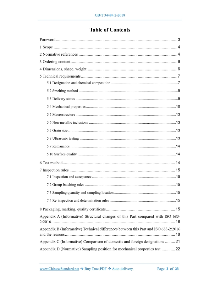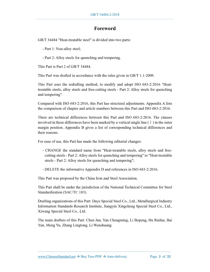 Similar standardsGB/T 34484.2-2018: Heat-treatable steels -- Part 2: Alloy steels for quenching and tempering---This is an excerpt. Full copy of true-PDF in English version (including equations, symbols, images, flow-chart, tables, and figures etc.), auto-downloaded/delivered in 9 seconds, can be purchased online: https://www.ChineseStandard.net/PDF.aspx/GBT34484.2-2018GB NATIONAL STANDARD OF THE PEOPLE’S REPUBLIC OF CHINA ICS 77.140.10 H 40 Heat-treatable steels - Part 2.Alloy steels for quenching and tempering (ISO 683-2.2016, Heat-treatable steels, alloy steels and free-cutting steels - Part 2.Alloy steels for quenching and tempering, MOD) Issued on: SEPTEMBER 17, 2018 Implemented on: JUNE 01, 2019 Issued by. State Administration for Market Regulation; National Standardization Administration. Table of ContentsForeword... 3 1 Scope... 4 2 Normative references... 4 3 Ordering content... 6 4 Dimensions, shape, weight... 6 5 Technical requirements... 7 5.1 Designation and chemical composition... 7 5.2 Smelting method... 9 5.3 Delivery status... 9 5.4 Mechanical properties... 10 5.5 Macrostructure... 13 5.6 Non-metallic inclusions... 13 5.7 Grain size... 13 5.8 Ultrasonic testing... 13 5.9 Remanence... 14 5.10 Surface quality... 14 6 Test method... 14 7 Inspection rules... 15 7.1 Inspection and acceptance... 15 7.2 Group-batching rules... 15 7.3 Sampling quantity and sampling location... 15 7.4 Re-inspection and determination rules... 15 8 Packaging, marking, quality certificate... 15 Appendix A (Informative) Structural changes of this Part compared with ISO 683- 2.2016... 16 Appendix B (Informative) Technical differences between this Part and ISO 683-2.2016 and the reasons... 18 Appendix C (Informative) Comparison of domestic and foreign designations... 21 Appendix D (Normative) Sampling position for mechanical properties test... 22ForewordGB/T 34484 "Heat-treatable steel" is divided into two parts. - Part 1.Non-alloy steel; - Part 2.Alloy steels for quenching and tempering. This Part is Part 2 of GB/T 34484. This Part was drafted in accordance with the rules given in GB/T 1.1-2009. This Part uses the redrafting method, to modify and adopt ISO 683-2.2016 "Heat- treatable steels, alloy steels and free-cutting steels - Part 2.Alloy steels for quenching and tempering". Compared with ISO 683-2.2016, this Part has structural adjustments. Appendix A lists the comparison of chapter and article numbers between this Part and ISO 683-2.2016. There are technical differences between this Part and ISO 683-2.2016.The clauses involved in these differences have been marked by a vertical single line (丨) in the outer margin position. Appendix B gives a list of corresponding technical differences and their reasons. For ease of use, this Part has made the following editorial changes. - CHANGE the standard name from "Heat-treatable steels, alloy steels and free- cutting steels - Part 2.Alloy steels for quenching and tempering" to "Heat-treatable steels - Part 2.Alloy steels for quenching and tempering"; - DELETE the informative Appendix D and references in ISO 683-2.2016. This Part was proposed by the China Iron and Steel Association. This Part shall be under the jurisdiction of the National Technical Committee for Steel Standardization (SAC/TC 183). Drafting organizations of this Part. Daye Special Steel Co., Ltd., Metallurgical Industry Information Standards Research Institute, Jiangyin Xingcheng Special Steel Co., Ltd., Xiwang Special Steel Co., Ltd. The main drafters of this Part. Chen Jun, Yan Chengming, Li Bopeng, Hu Ruihai, Bai Yun, Meng Yu, Zhang Lingtong, Li Wenshuang. Heat-treatable steels - Part 2.Alloy steels for quenching and tempering1 ScopeThis Part of GB/T 34484 specifies the ordering content, size, shape, weight, technical requirements, test methods, inspection rules, packaging, marking, quality certificate of alloy steels delivered in quenched and tempered state. This Part applies to rolled round steel which has a nominal diameter not exceeding 310 mm and rolled square steel which has a nominal side length not exceeding 280 mm (hereinafter referred to as steel).2 Normative referencesThe following documents are essential to the application of this document. For the dated documents, only the versions with the dates indicated are applicable to this document; for the undated documents, only the latest version (including all the amendments) is applicable to this standard. GB/T 222 Permissible tolerances for chemical composition of steel products GB/T 223.9 Iron, steel and alloy - Determination of aluminium content - Chrome azurol S photometric method GB/T 223.11 Iron, steel and alloy - Determination of chromium content - Visual titration or potentiometric titration method (GB/T 223.11-2008, ISO 4937.1986, MOD) GB/T 223.13 Methods for chemical analysis of iron, steel and alloy - The ammonium ferrous sulfate titration method for the determination of vanadium content GB/T 223.17 Methods for chemical analysis of iron, steel and alloy - The diantipyryl methane spectrophotometry for the determination of titanium content GB/T 223.23 Iron, steel and alloy - Determination of nickel content - The dimethylglyoxime spectrophotometric method GB/T 223.26 Iron, steel and alloy - Determination of molybdenum content - The thiocyanate spectrophotometric method GB/T 6394 Determination of estimating the average grain size of metal GB/T 10561-2005 Steel - Determination of content of nonmetallic inclusions - Micrographic method using standards diagrams (ISO 4967.1998, IDT) GB/T 17505 Steel and steel products - General technical delivery requirements (GB/T 17505-2016, ISO 404.2013, MOD) GB/T 20066 Steel and iron - Sampling and preparation of samples for the determination of chemical composition (GB/T 20066-2006, ISO 14284.1996, IDT) GB/T 20123 Steel and iron - Determination of total carbon and sulfur content Infrared absorption method after combustion in an induction furnace (routine method)3 Ordering contentThe co
