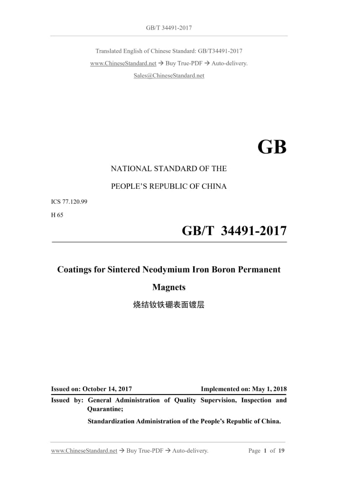 GB/T 34491-2017: Coatings for sintered neodymium iron boron permanent magnets Delivery: 9 seconds. True-PDF full-copy in English & invoice will be downloaded + auto-delivered via email. See step-by-step procedure Status: Valid