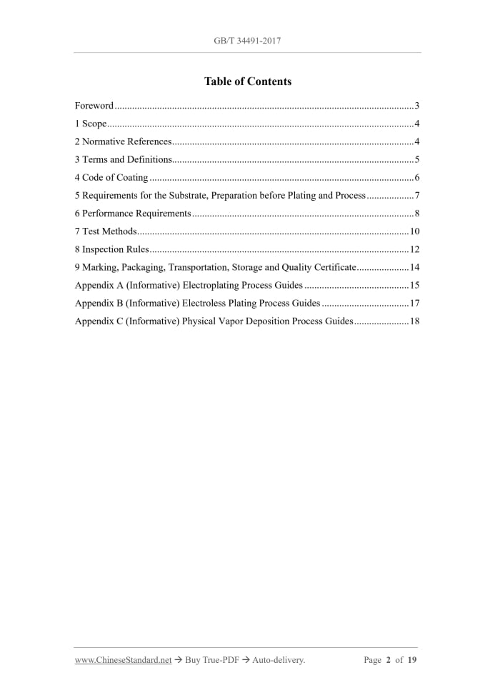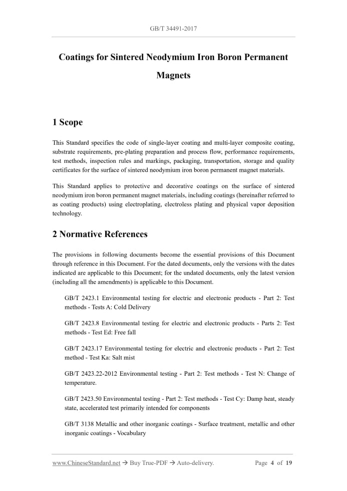 Similar standardsGB/T 34491-2017: Coatings for sintered neodymium iron boron permanent magnets---This is an excerpt. Full copy of true-PDF in English version (including equations, symbols, images, flow-chart, tables, and figures etc.), auto-downloaded/delivered in 9 seconds, can be purchased online: https://www.ChineseStandard.net/PDF.aspx/GBT34491-2017GB NATIONAL STANDARD OF THE PEOPLE’S REPUBLIC OF CHINA ICS 77.120.99 H 65 Coatings for Sintered Neodymium Iron Boron Permanent Magnets Issued on: OCTOBER 14, 2017 Implemented on: MAY 1, 2018 Issued by. General Administration of Quality Supervision, Inspection and Quarantine; Standardization Administration of the People’s Republic of China. Table of ContentsForeword... 3 1 Scope... 4 2 Normative References... 4 3 Terms and Definitions... 5 4 Code of Coating... 6 5 Requirements for the Substrate, Preparation before Plating and Process... 7 6 Performance Requirements... 8 7 Test Methods... 10 8 Inspection Rules... 12 9 Marking, Packaging, Transportation, Storage and Quality Certificate... 14 Appendix A (Informative) Electroplating Process Guides... 15 Appendix B (Informative) Electroless Plating Process Guides... 17 Appendix C (Informative) Physical Vapor Deposition Process Guides... 18 Coatings for Sintered Neodymium Iron Boron Permanent Magnets1 ScopeThis Standard specifies the code of single-layer coating and multi-layer composite coating, substrate requirements, pre-plating preparation and process flow, performance requirements, test methods, inspection rules and markings, packaging, transportation, storage and quality certificates for the surface of sintered neodymium iron boron permanent magnet materials. This Standard applies to protective and decorative coatings on the surface of sintered neodymium iron boron permanent magnet materials, including coatings (hereinafter referred to as coating products) using electroplating, electroless plating and physical vapor deposition technology.2 Normative ReferencesThe provisions in following documents become the essential provisions of this Document through reference in this Document. For the dated documents, only the versions with the dates indicated are applicable to this Document; for the undated documents, only the latest version (including all the amendments) is applicable to this Document. GB/T 2423.1 Environmental testing for electric and electronic products - Part 2.Test methods - Tests A. Cold Delivery GB/T 2423.8 Environmental testing for electric and electronic products - Parts 2.Test methods - Test Ed. Free fall GB/T 2423.17 Environmental testing for electric and electronic products - Part 2.Test method - Test Ka. Salt mist GB/T 2423.22-2012 Environmental testing - Part 2.Test methods - Test N. Change of temperature. GB/T 2423.50 Environmental testing - Part 2.Test methods - Test Cy. Damp heat, steady state, accelerated test primarily intended for components GB/T 3138 Metallic and other inorganic coatings - Surface treatment, metallic and other inorganic coatings - Vocabulary GB/T 4955 Metallic coatings - Measurement of coating thickness - Coulometric method by anodic dissolution" GB/T 5210 Paints and varnishes - Pull-off test for adhesion GB/T 5270 Metallic coatings on metallic substrates - Electrodeposited and chemically deposited coatings - Review of adhesion strength test methods GB/T 6462 Metallic and oxide coatings - Measurement of coating thickness - Microscopical method GB/T 12334 Metallic and other inorganic coatings - Definitions and conventions concerning the measurement of thickness GB/T 13560 Sintered neodymium iron boron permanent magnets GB/T 16921 Metallic coatings. Measurement of coating thickness. X-ray spectrometric methods QB/T 3814 Surface examination method of the metal deposits and conversion coatings for light industrial products3 Terms and DefinitionsFor the purposes of this Document, the terms and definitions given in GB/T 3138 and GB/T 12334, and the following apply. 3.1 Substrate The substrate referred to in this Document refers to the workpiece that requires surface treatment. 3.2 Electroplating In order to obtain properties or dimensions that the substrate does not have, a metal or alloy layer with good bonding strength is deposited on the substrate by electrolysis. 3.3 Barrel electroplating An electroplating process in which bulk workpieces are electrodeposited in a rotating, oscillating or otherwise moving container. 3.4 Vat plating (GB) or still plating (US) Electroplating in which the parts to be plated are independently connected to the rack. 3.5 Electroless plating or actocalytic plating 5.2 The surface-treated workpiece can be of various shapes, and its dimensional deviation, shape and position deviation, surface condition, etc. shall be accepted. The acceptance requirements for workpieces with special shapes and large dimensional differences in different directions shall be determined by negotiation between the supplier and the purchaser. 5.3 The size of the residual magnetism of the workpiece shall affect the quality of the coating, and the supplier and the purchaser shall agree in advance before the plating process. 5.4 Chamfering should be performed before plating; and the radius of curvature after chamfering is 0.1 mm~0.8 mm. There shall be no excessive chipping, scratches and abrasion after chamfering. 5.5 Before plating, the workpiece shall be degreased and cleaned as required. 5.6 Electroplating, electroless plating and physical vapor deposition techniques are usually used to coat the protective and decorative coatings on the surface of sintered NdFeB permanent magnet materials. For process guidelines, see Appendixes A, B and C, respectively.6 Performance Requirements6.1 Appearance quality 6.1.1 The coating surface shall be free of rust spots, yellow marks, water stains and other bad marks. The passivation film on the coating surface shall be complete and there shall not be adhered whitening. On the main surface of the workpiece, there